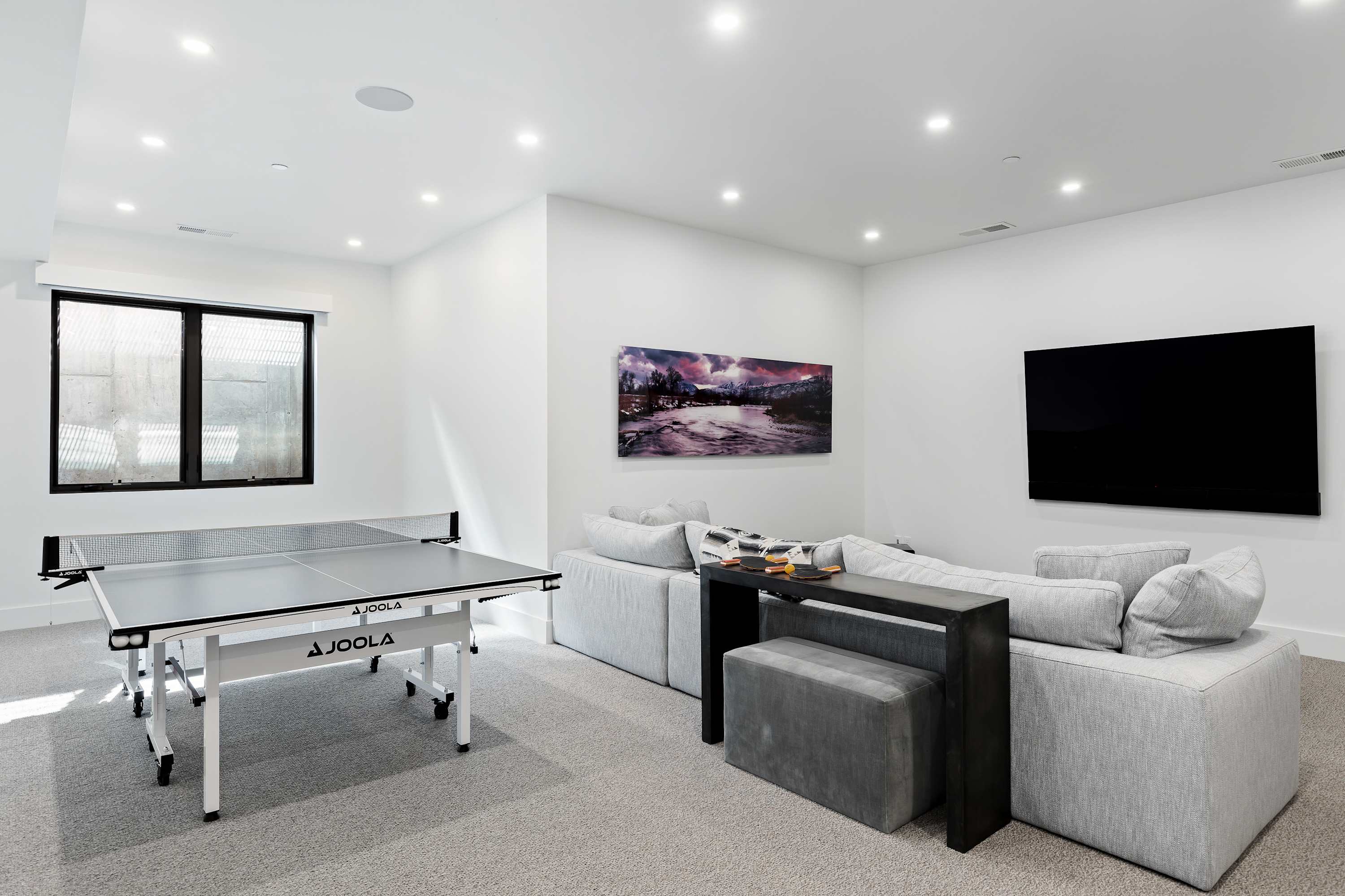 The lower level is a haven for fun and relaxation. Enjoy the dedicated bonus room with a huge RH sectional sofa, an 83” Smart TV, a ping-pong table, dart board, and assorted games. The convenient wet bar with a mini-fridge makes it the perfect entertainment space.