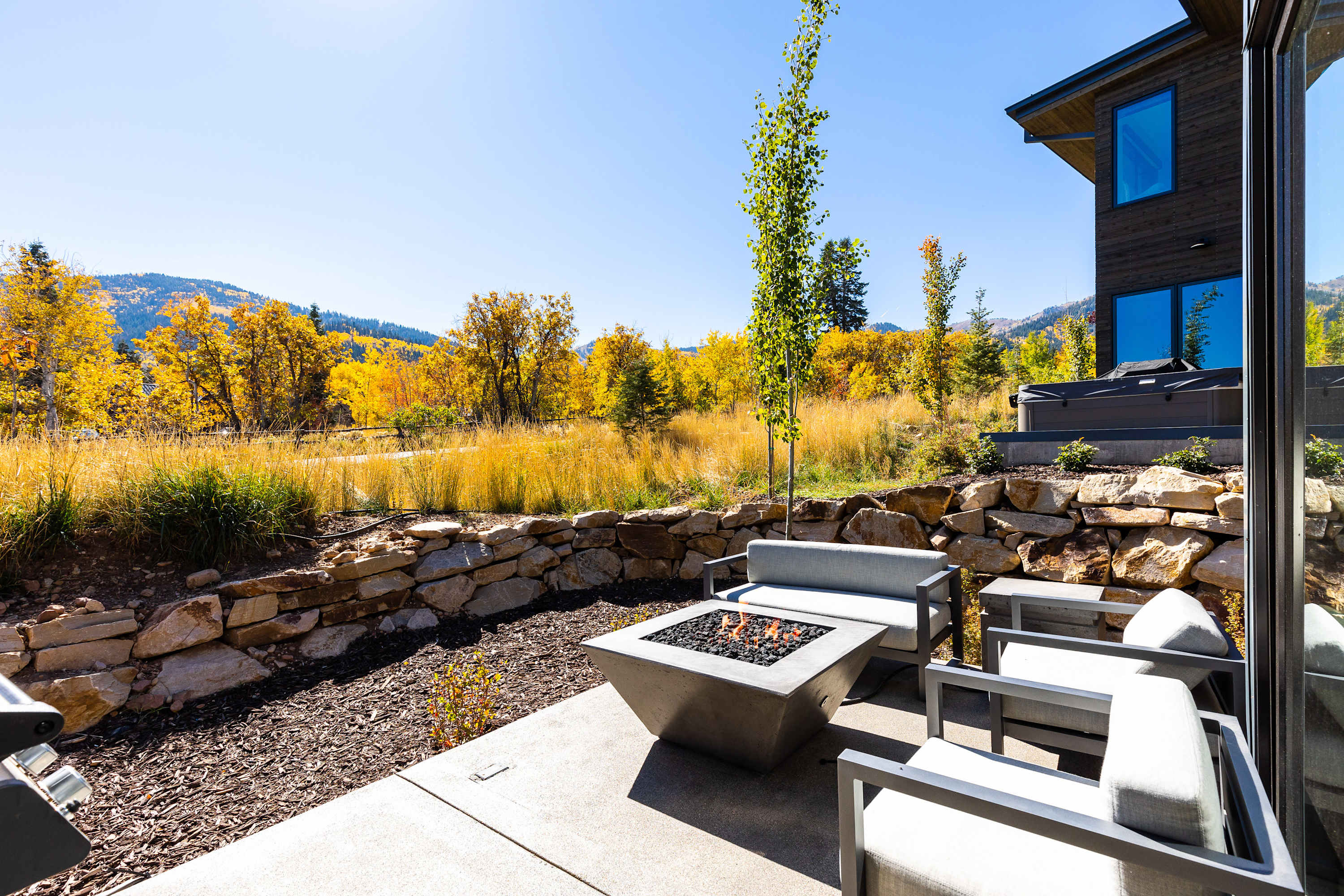 Outdoor Amenities: The private patio features welcoming RH seating with a large fire pit and a Weber propane grill. The heated, attached garage offers additional gear storage with ski and bike racks, a bench, and clothing hooks.