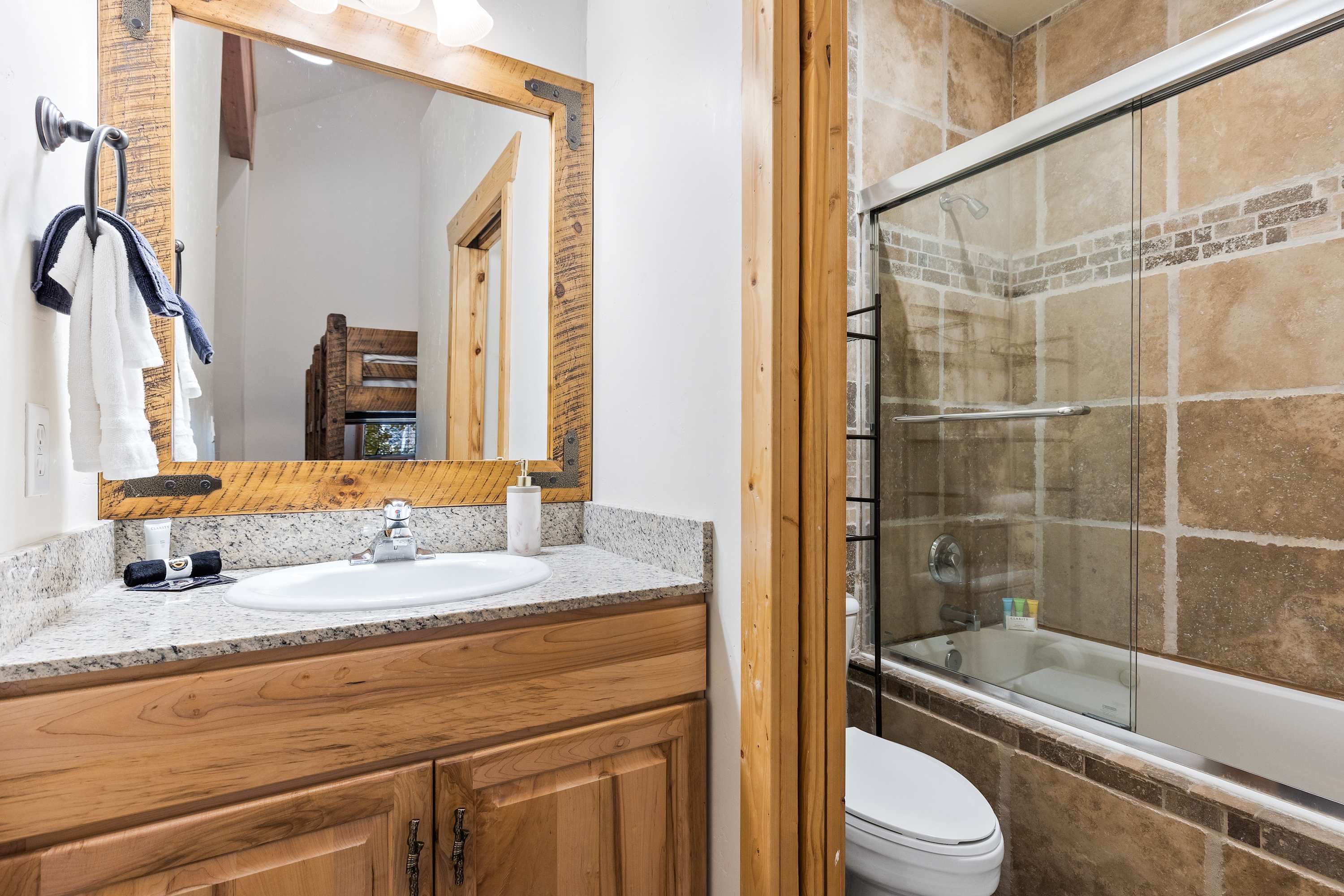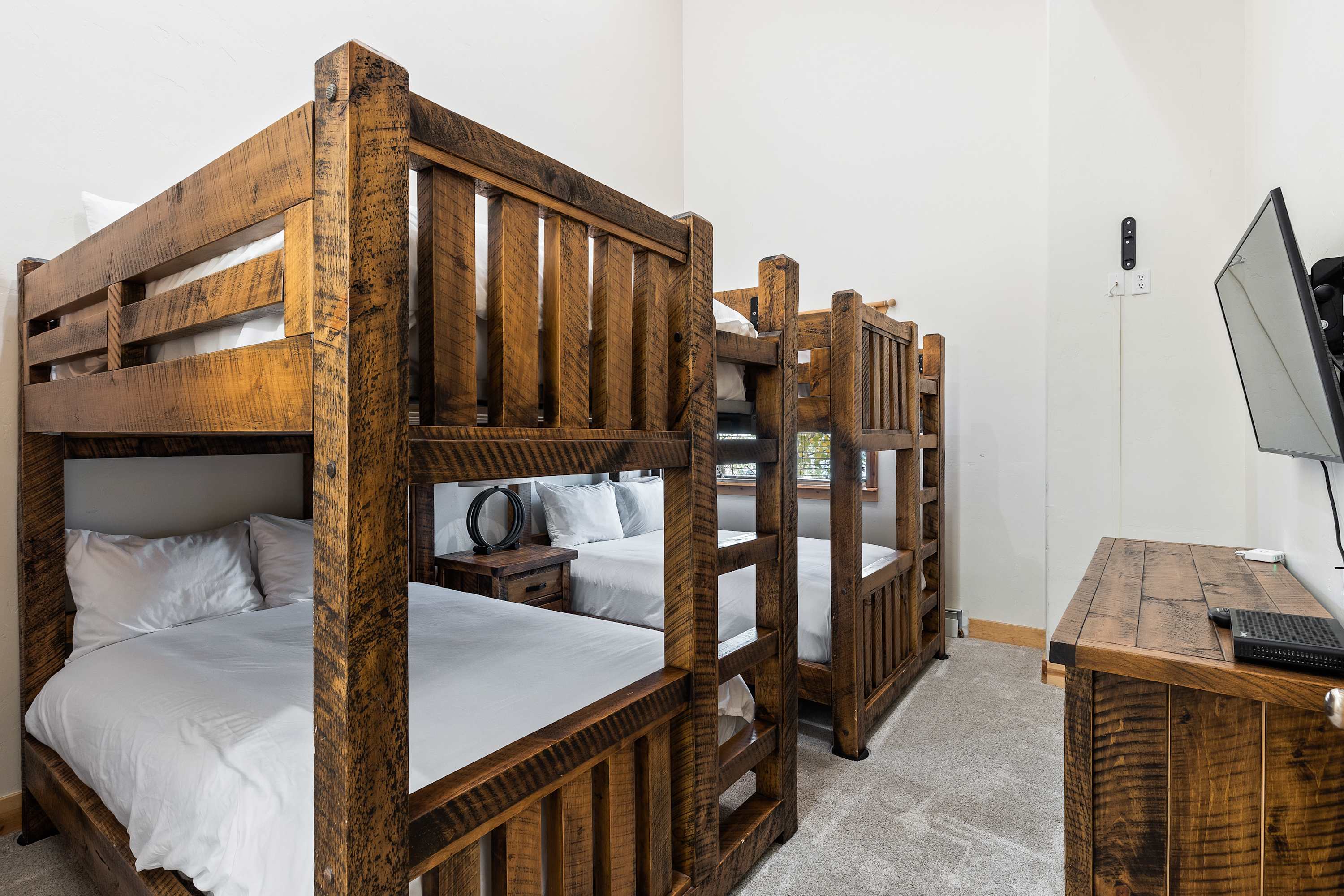 In the room adjacent to the master there are two, FULL over FULL, bunk beds for extra comfort and space, a flat screen TV, and an en-suite bathroom with shower-tub. Especially great for large families because kids LOVE this room!