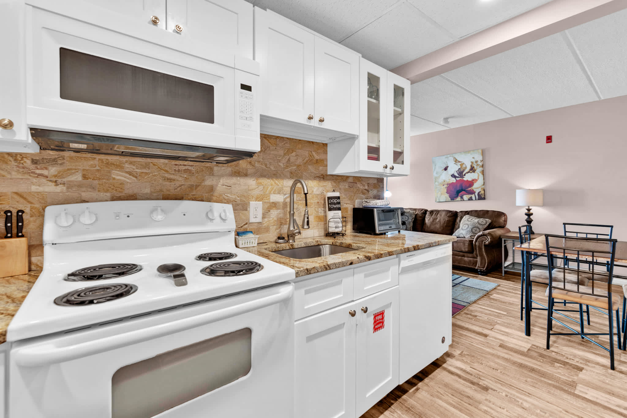 Settle into a comfortable, easygoing condo designed for relaxing between outings. The living area offers space to gather and a full-size sleeper sofa for extra guests. A seasonal gas fireplace (October–March) adds cozy ambiance on cooler evenings, and a laptop-friendly workspace makes it simple to check in on email or plan your next hike.