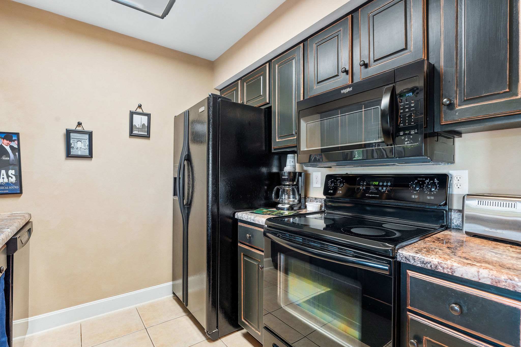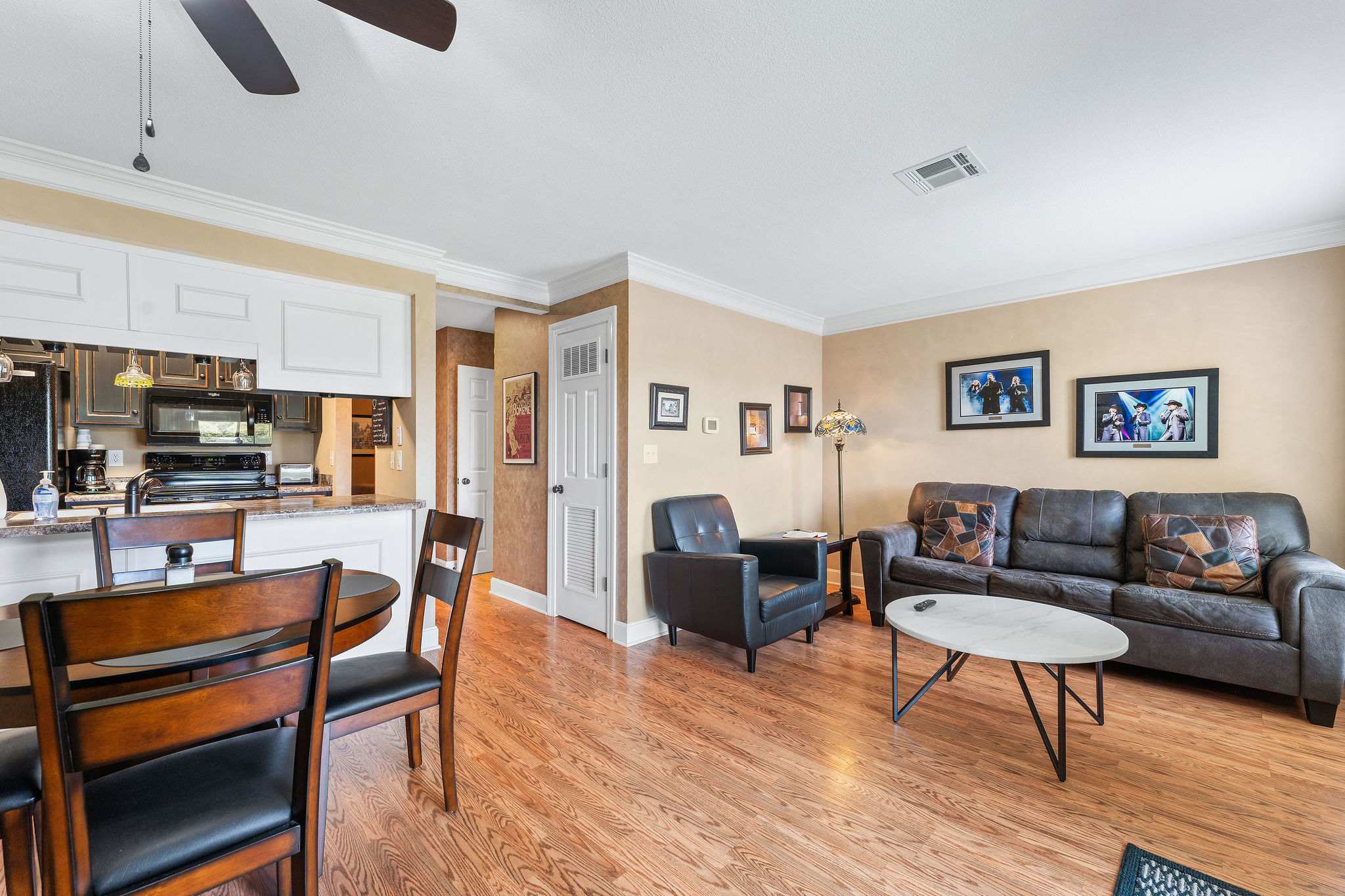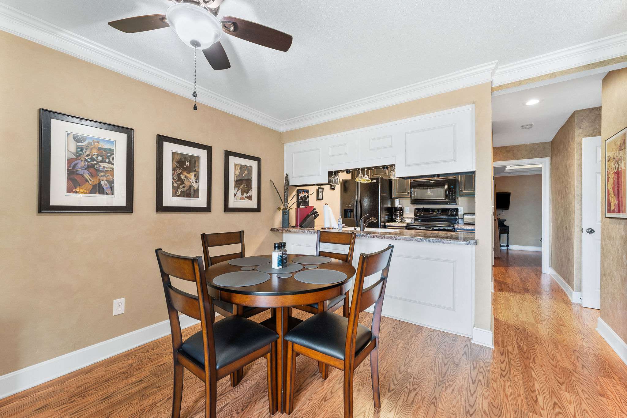 The home’s lovely interior exudes both comfort and style, with bright and airy spaces designed to maximize your downtime and allow you to fully refresh for the days ahead. Sink into the plush leather sofa or armchair in the living room while you stream all your favorite shows and movies on the smart TV. A sliding door opens out onto the breezy balcony, the perfect spot for observing the links while sipping your morning coffee or an evening cocktail. Back indoors, whip up delicious homestyle meals in the fully equipped kitchen, at home among the full-sized appliances and plentiful counterspace and cabinetry for preparation and storage. Family dining can be enjoyed at the table with seating for 4, afterward breaking out the games for an energetic night of fun.