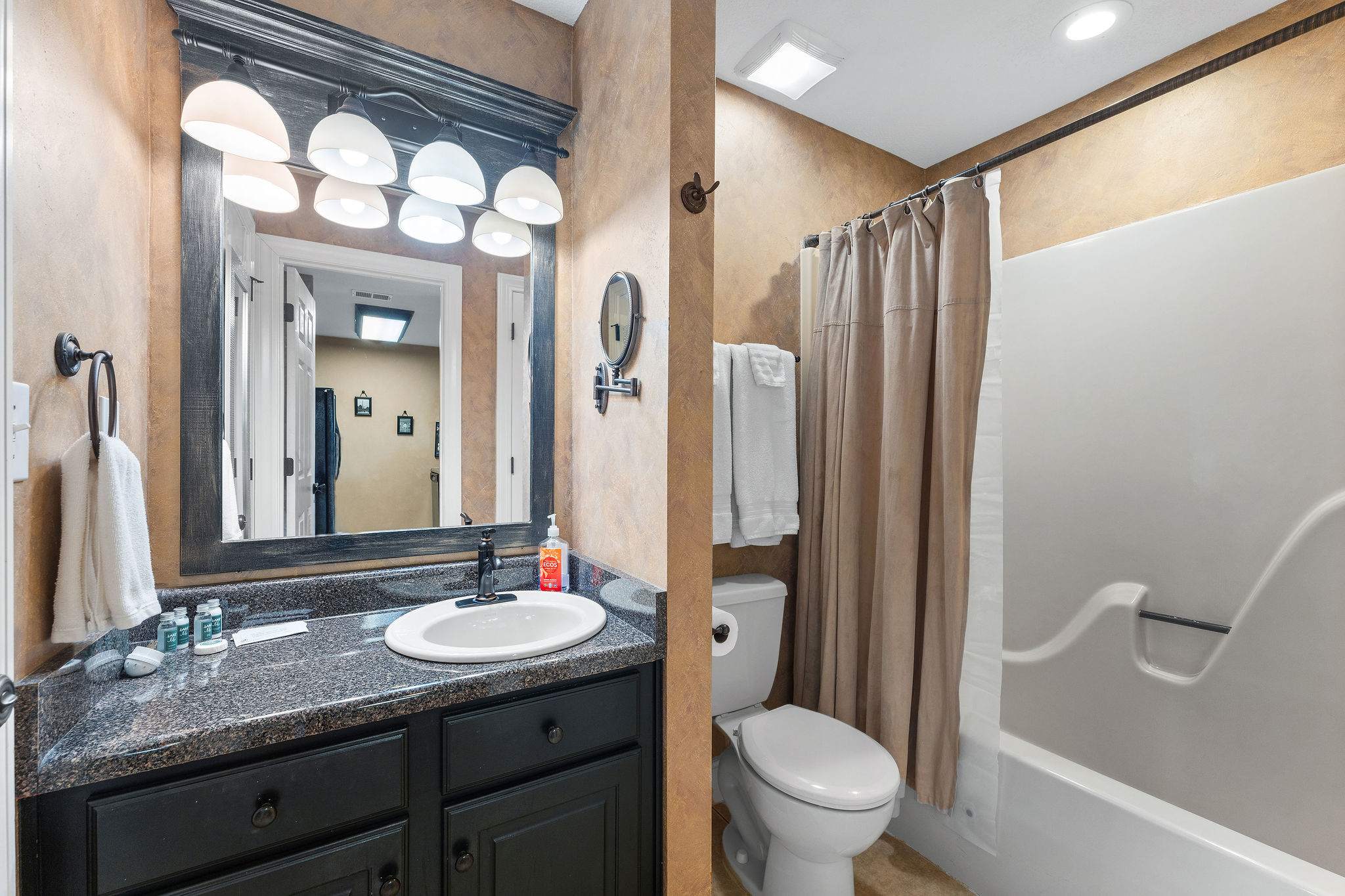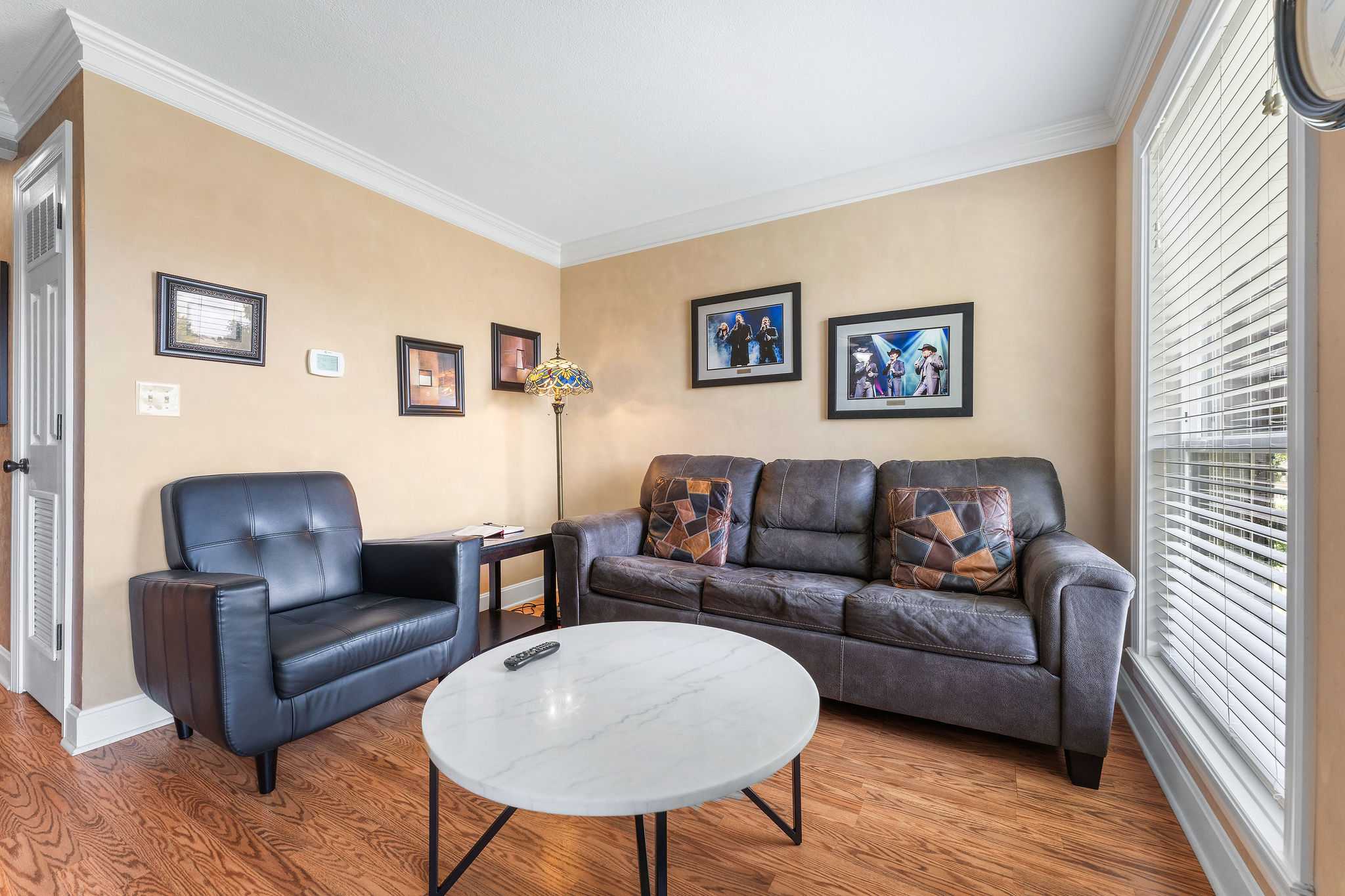 This home comfortably sleeps 4 guests between a private bedroom and queen-size sleeper sofa in the living room. The bedroom includes a luxurious king-size bed fitted with crisp linens and soft blankets for a great night’s sleep, along with a smart TV. The ensuite bathroom includes a spacious single vanity and shower/tub combo.