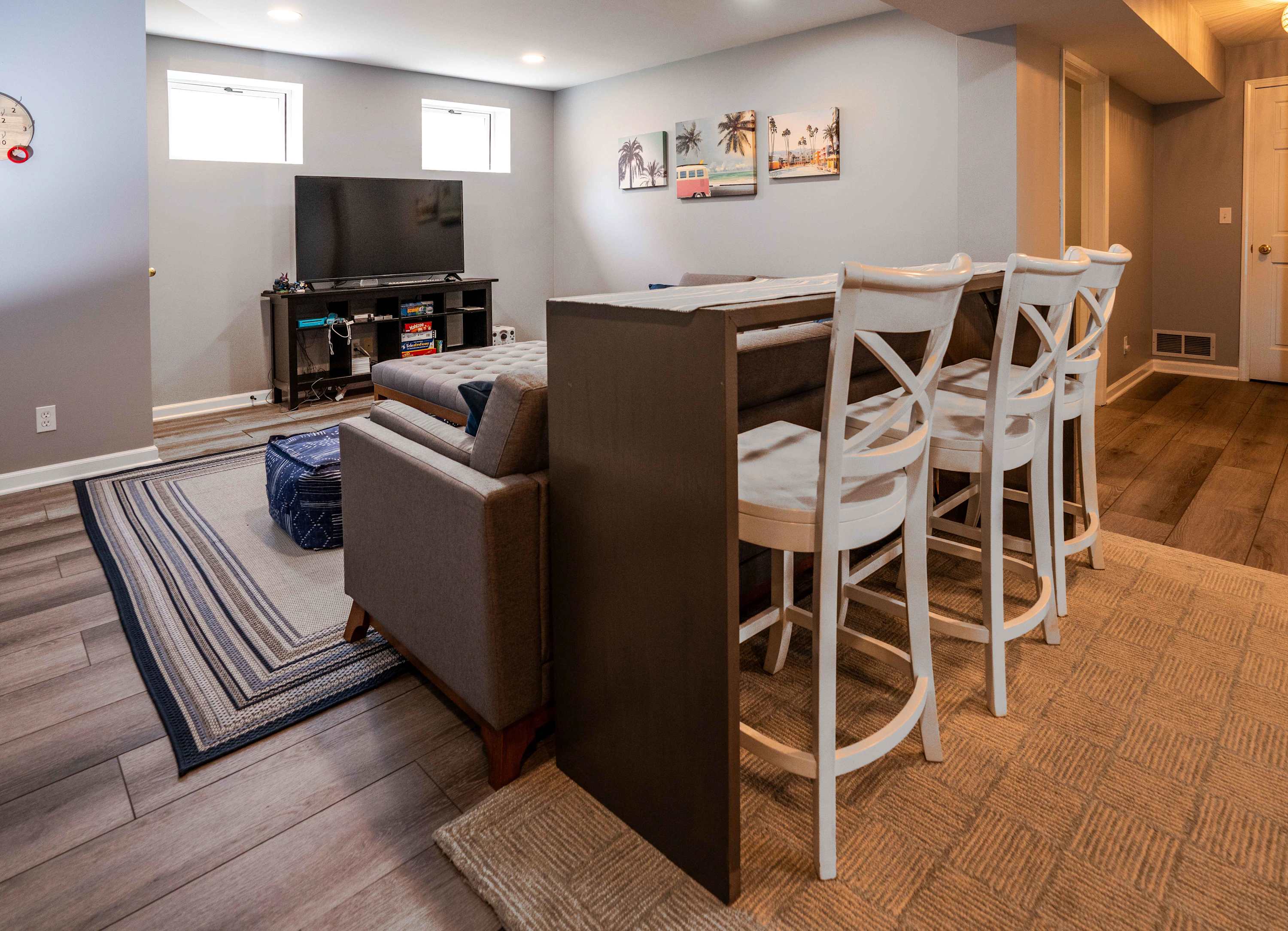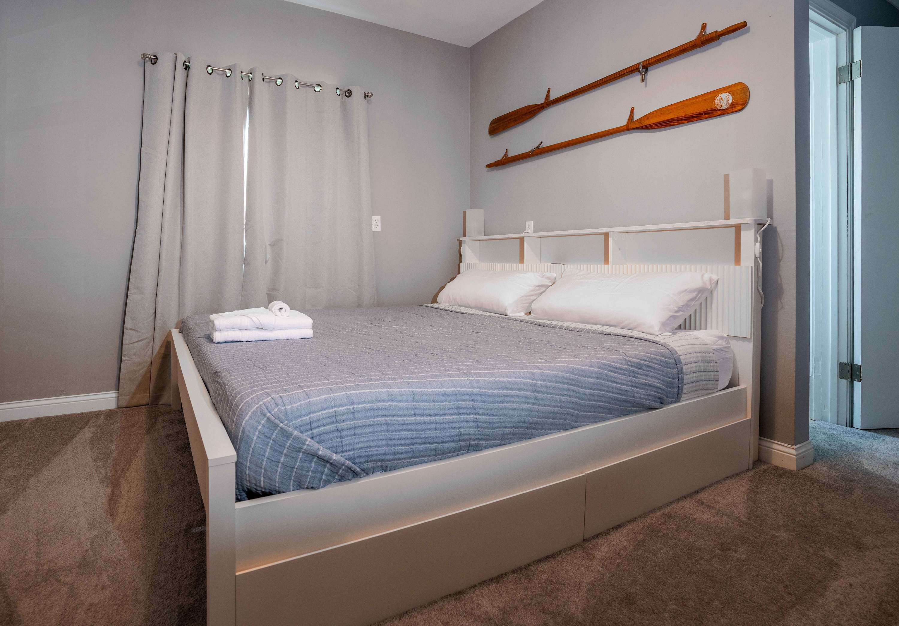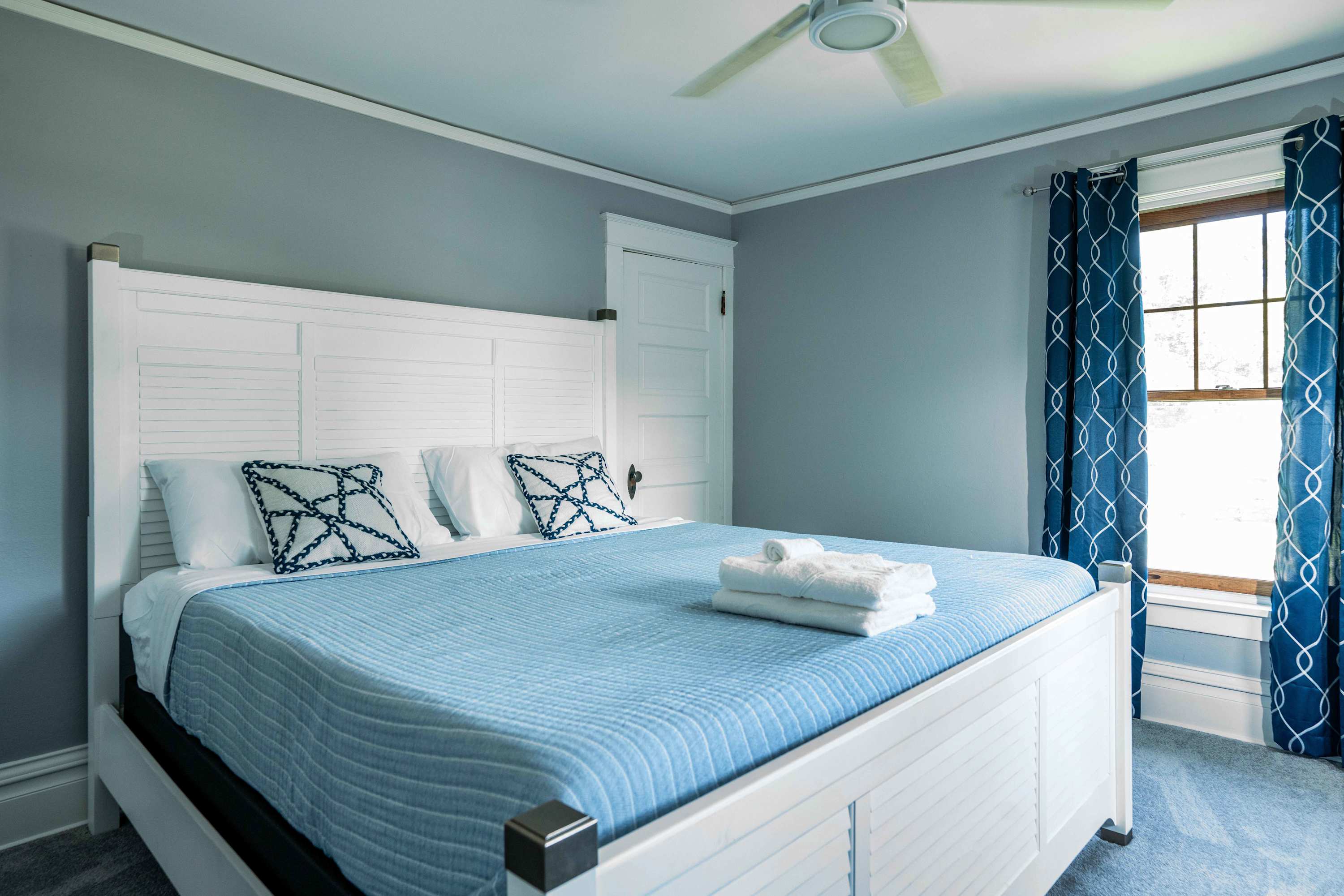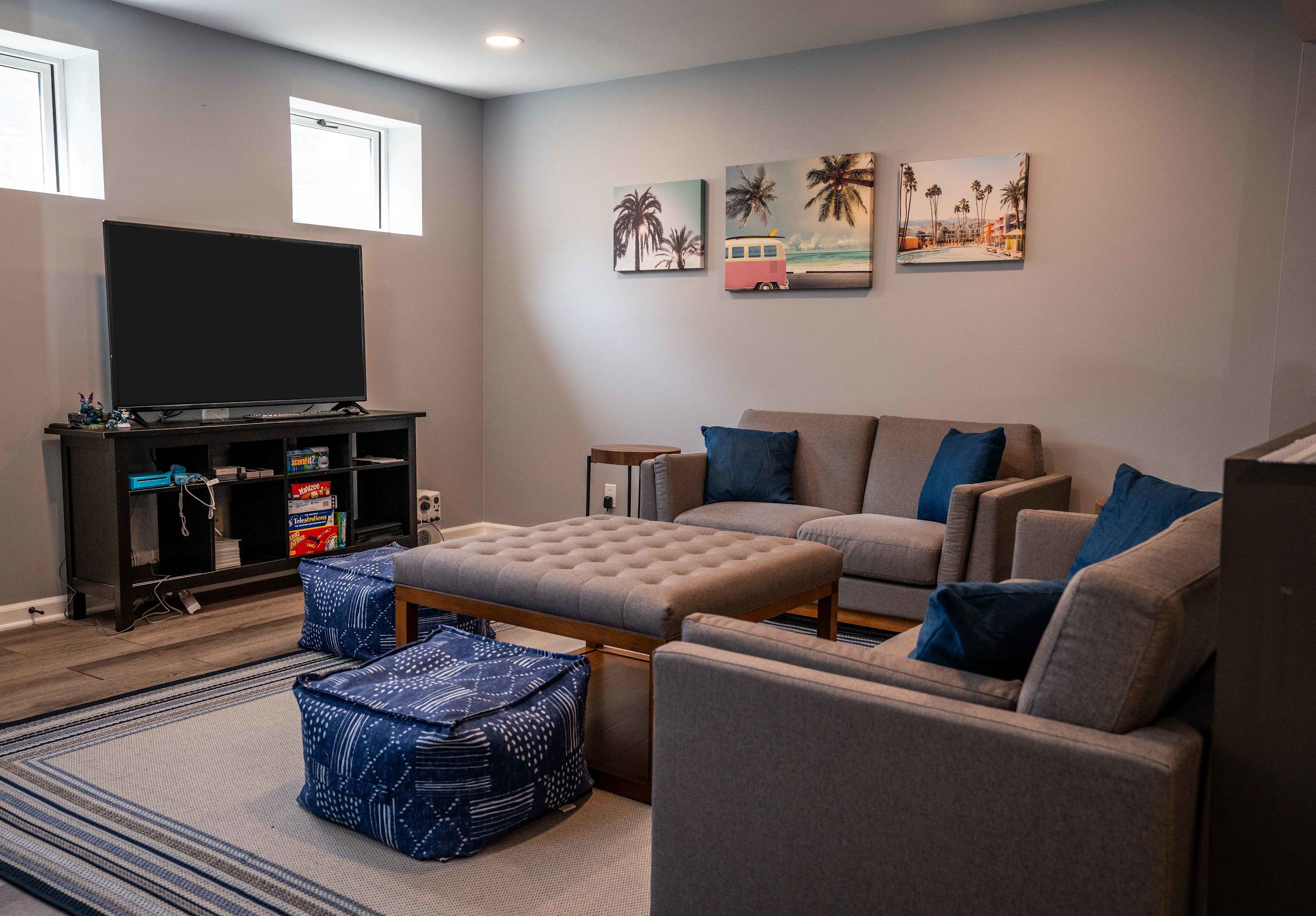 The home’s interior is a picture of sophistication, expertly curated with comfortable furnishings and trendy décor to maximize your downtime and connection with others. With several living spaces to choose from, everyone will be able to have the relaxation experience they desire. Sink into plush sofa and armchair seating in the living room to stream all your favorite entertainment on the mounted smart TV or escape to the charming front room for a quiet afternoon nap. Take your morning coffee or break out the cocktails and cards in the sunroom, soaking up the plentiful natural light. The lower-level den is all-things entertainment, with a full-sized shuffleboard table, board games, and additional sofa seating with smart TV for an immersive family movie night.