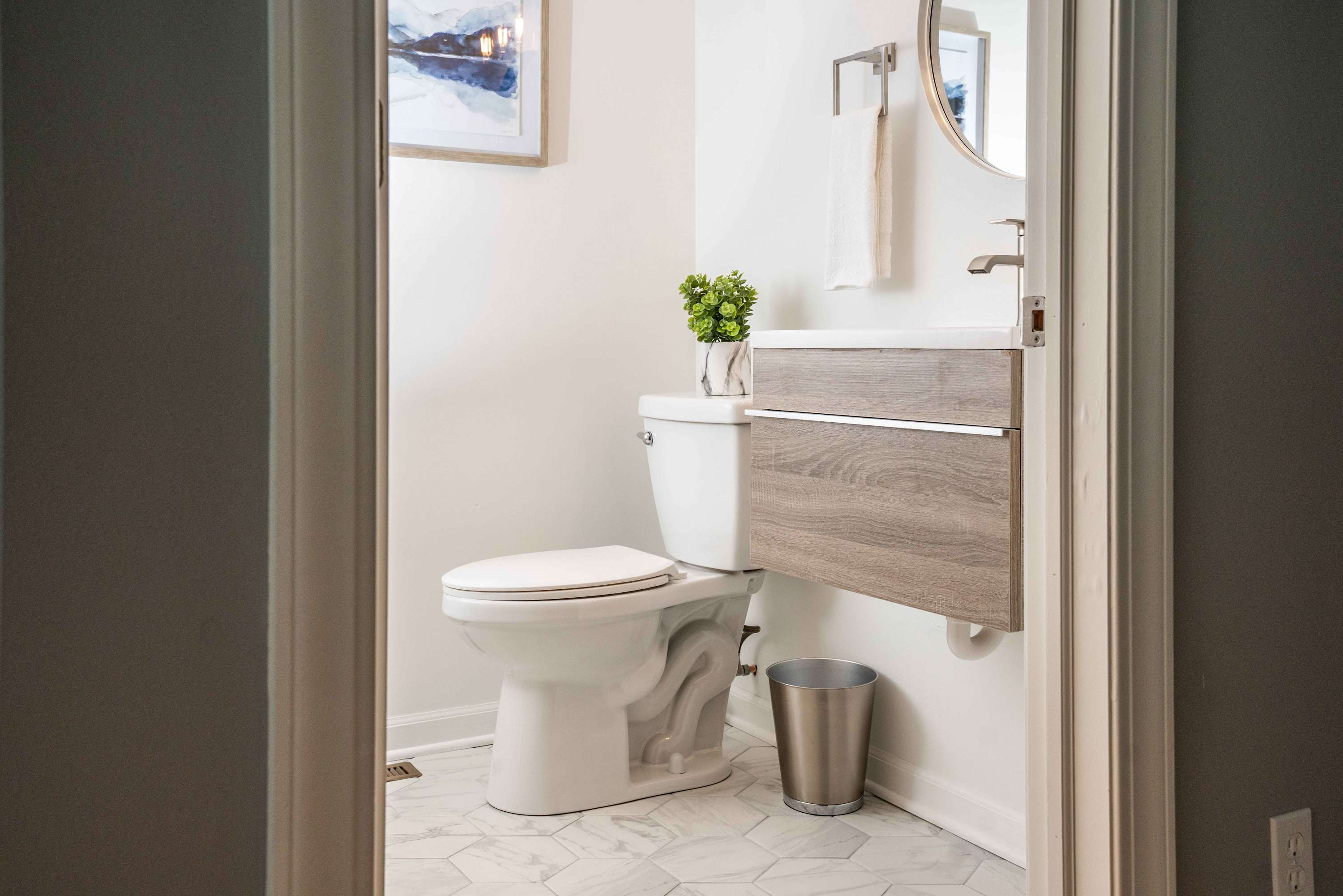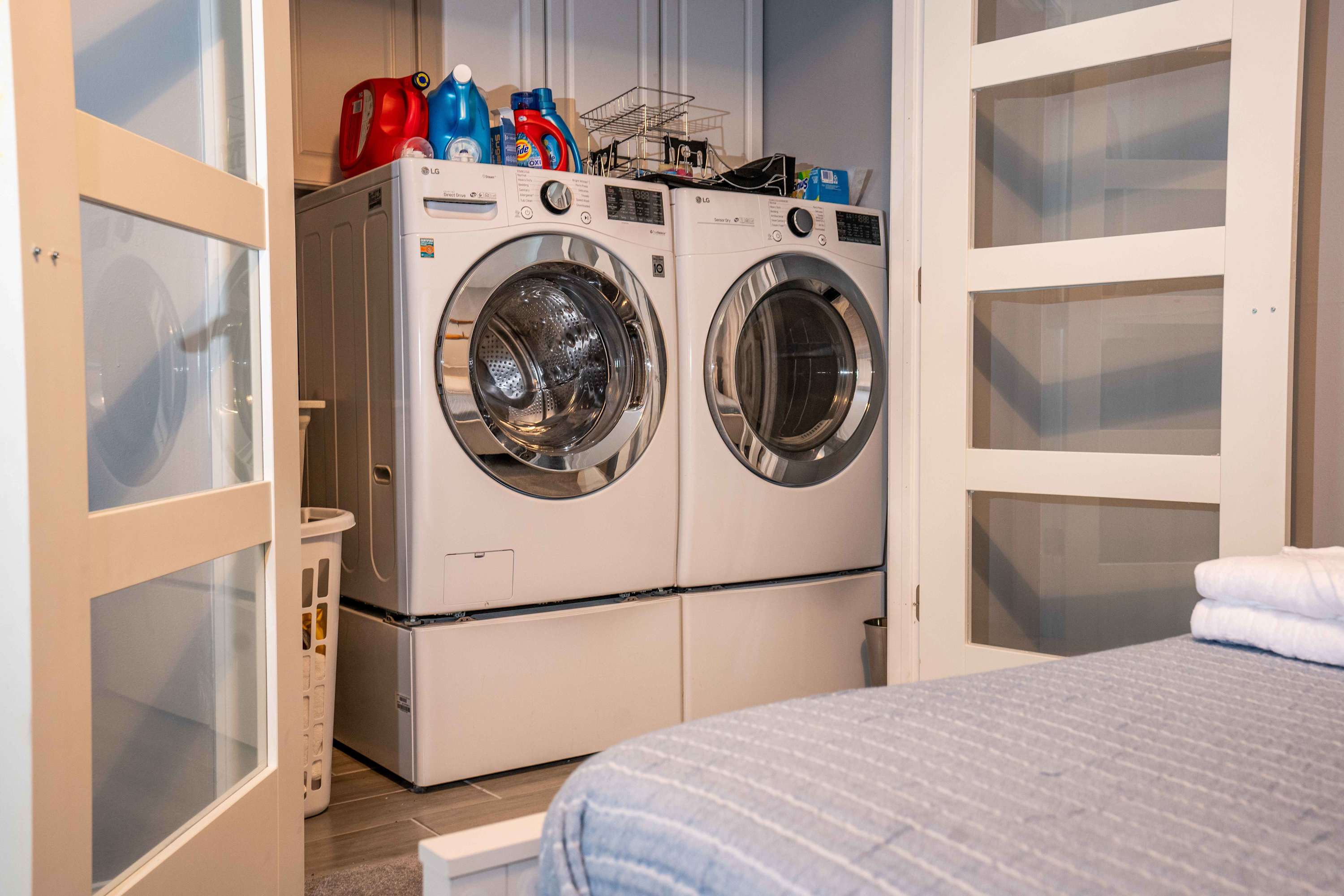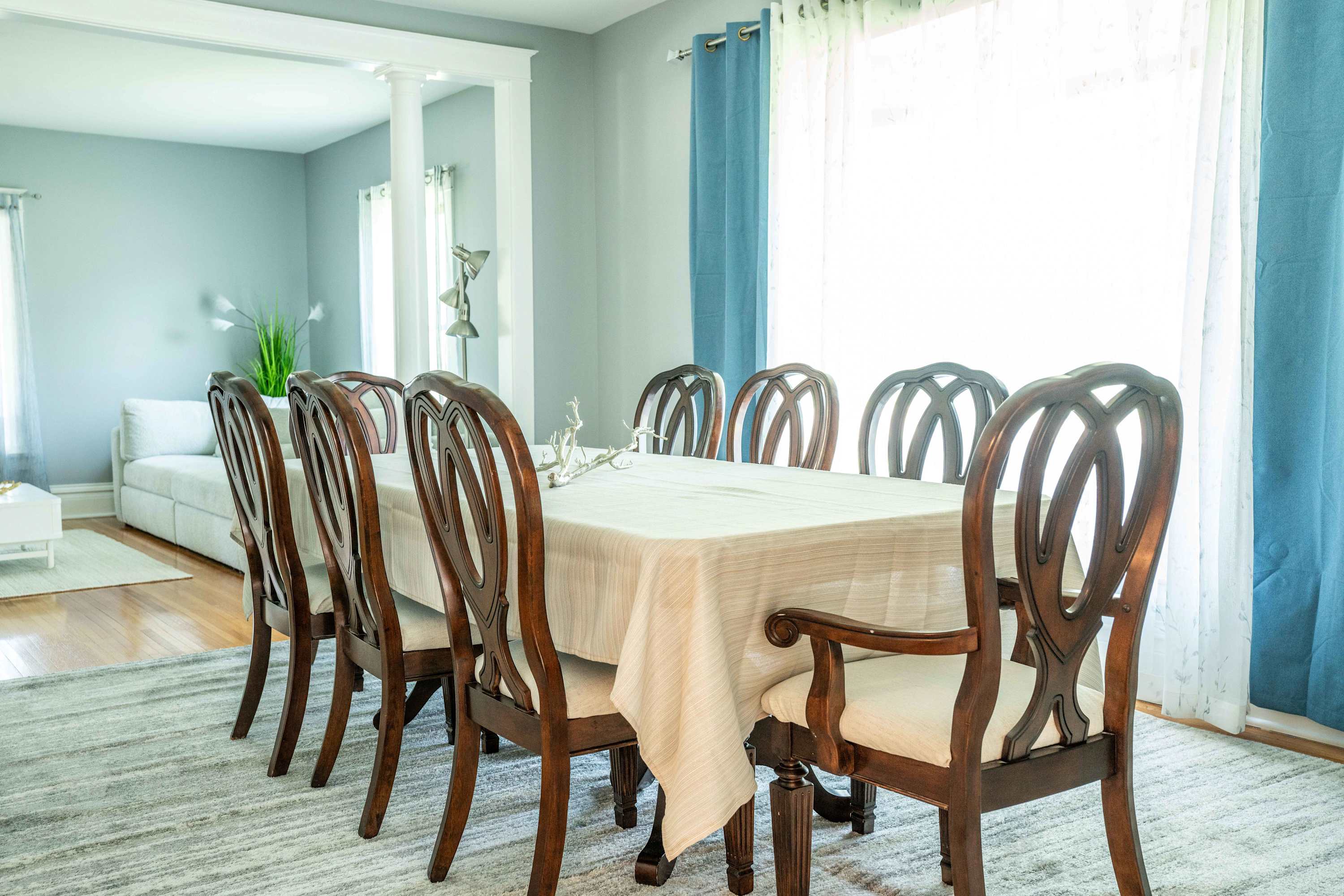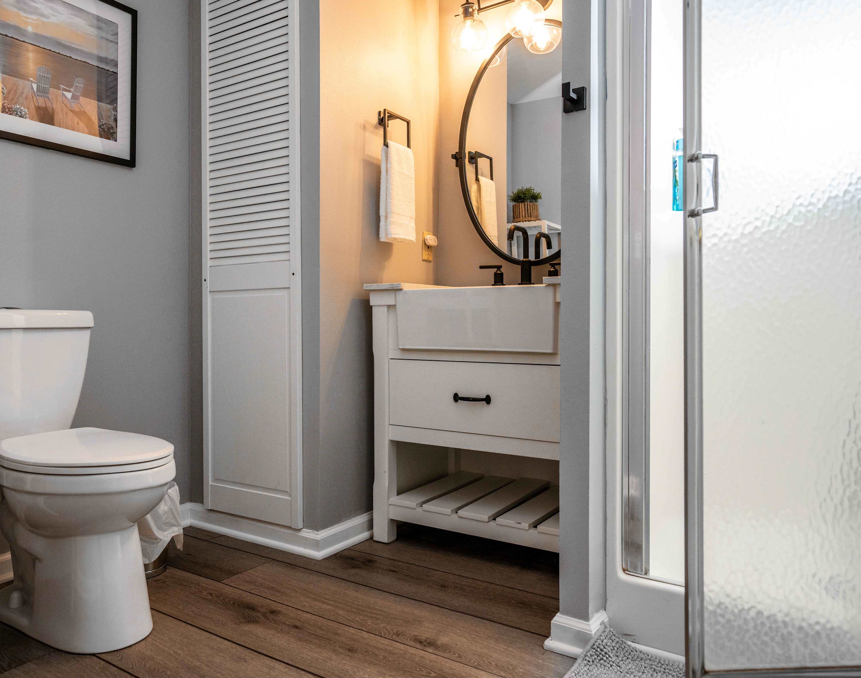 The home’s interior is a picture of sophistication, expertly curated with comfortable furnishings and trendy décor to maximize your downtime and connection with others. With several living spaces to choose from, everyone will be able to have the relaxation experience they desire. Sink into plush sofa and armchair seating in the living room to stream all your favorite entertainment on the mounted smart TV or escape to the charming front room for a quiet afternoon nap. Take your morning coffee or break out the cocktails and cards in the sunroom, soaking up the plentiful natural light. The lower-level den is all-things entertainment, with a full-sized shuffleboard table, board games, and additional sofa seating with smart TV for an immersive family movie night.