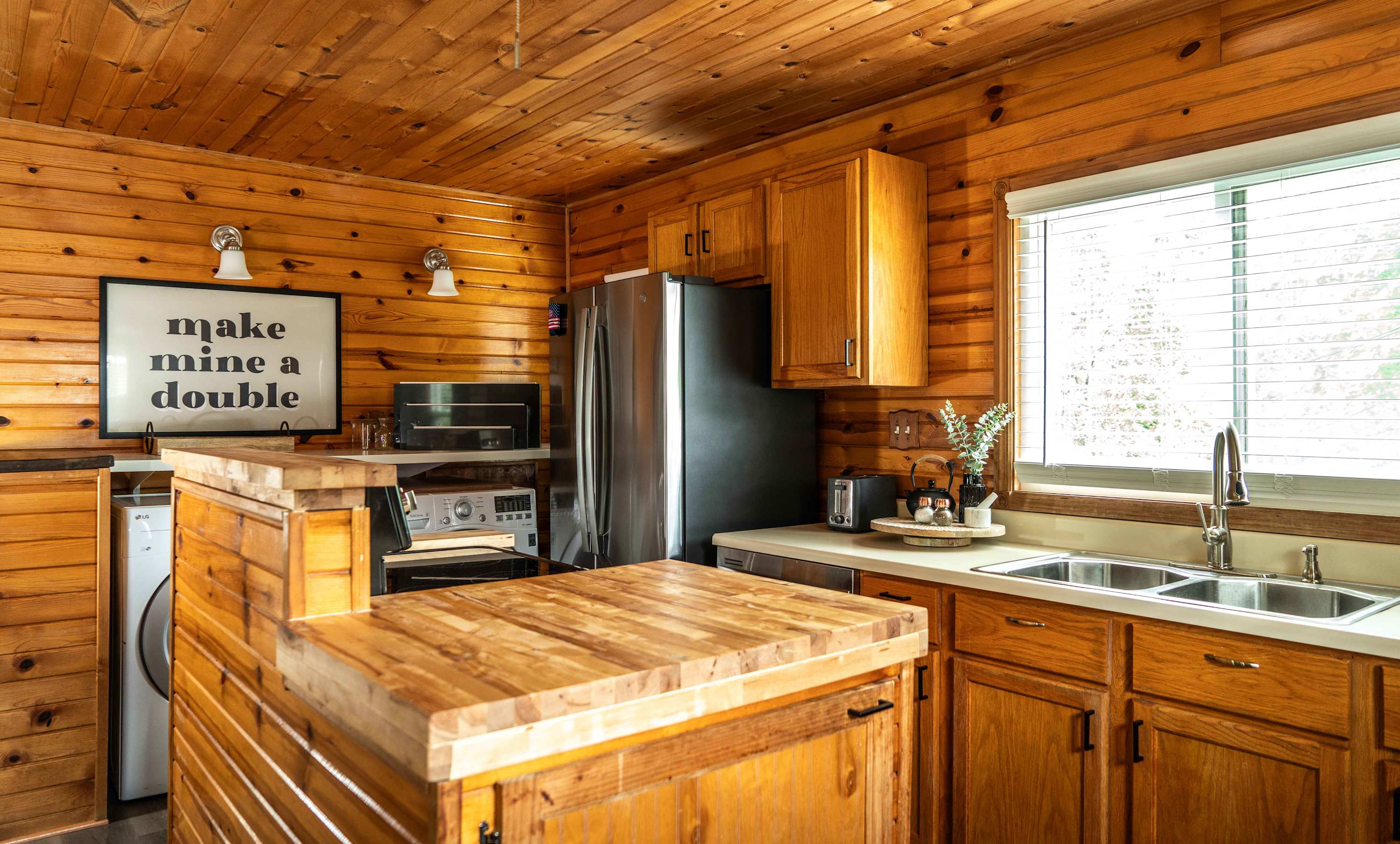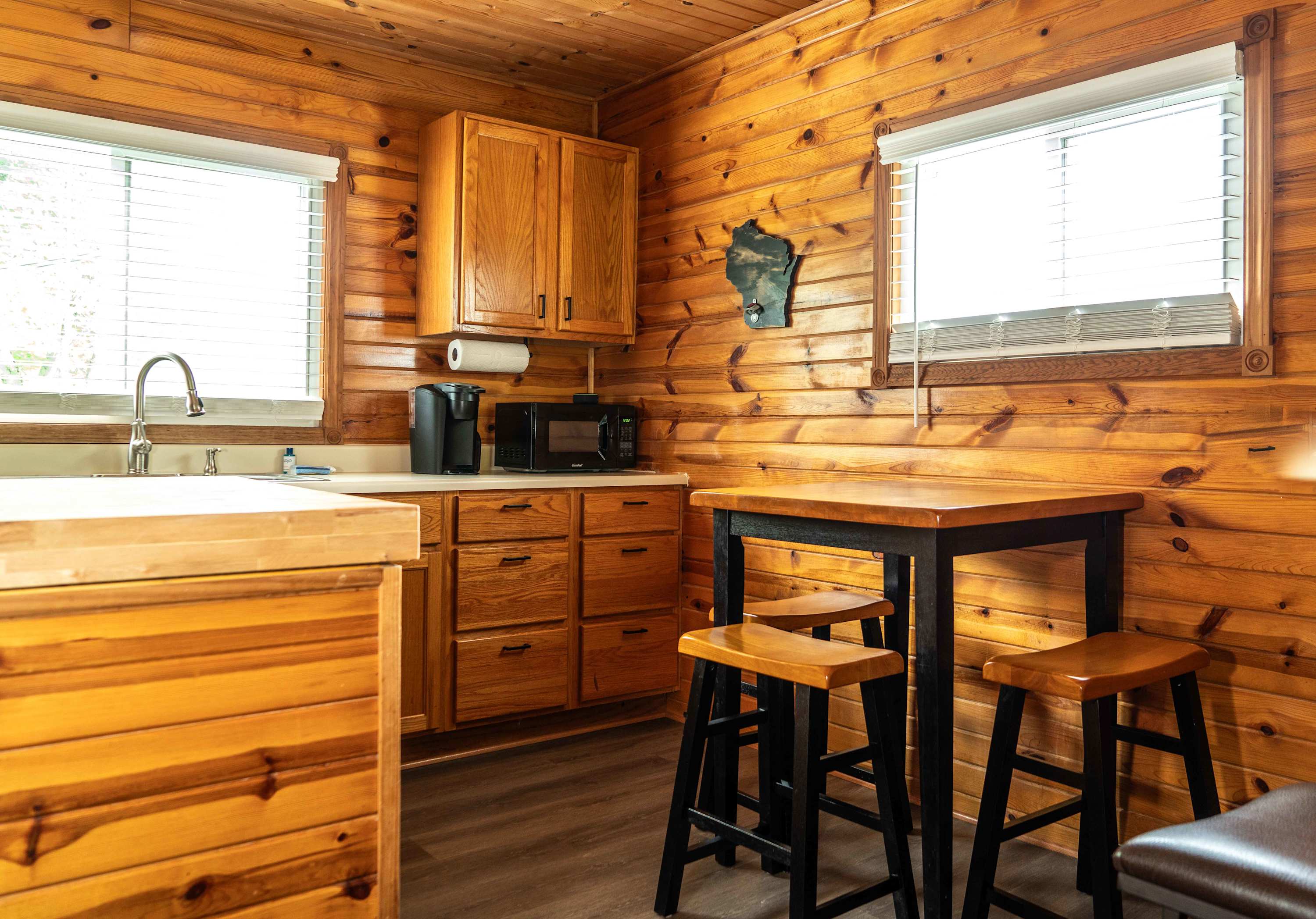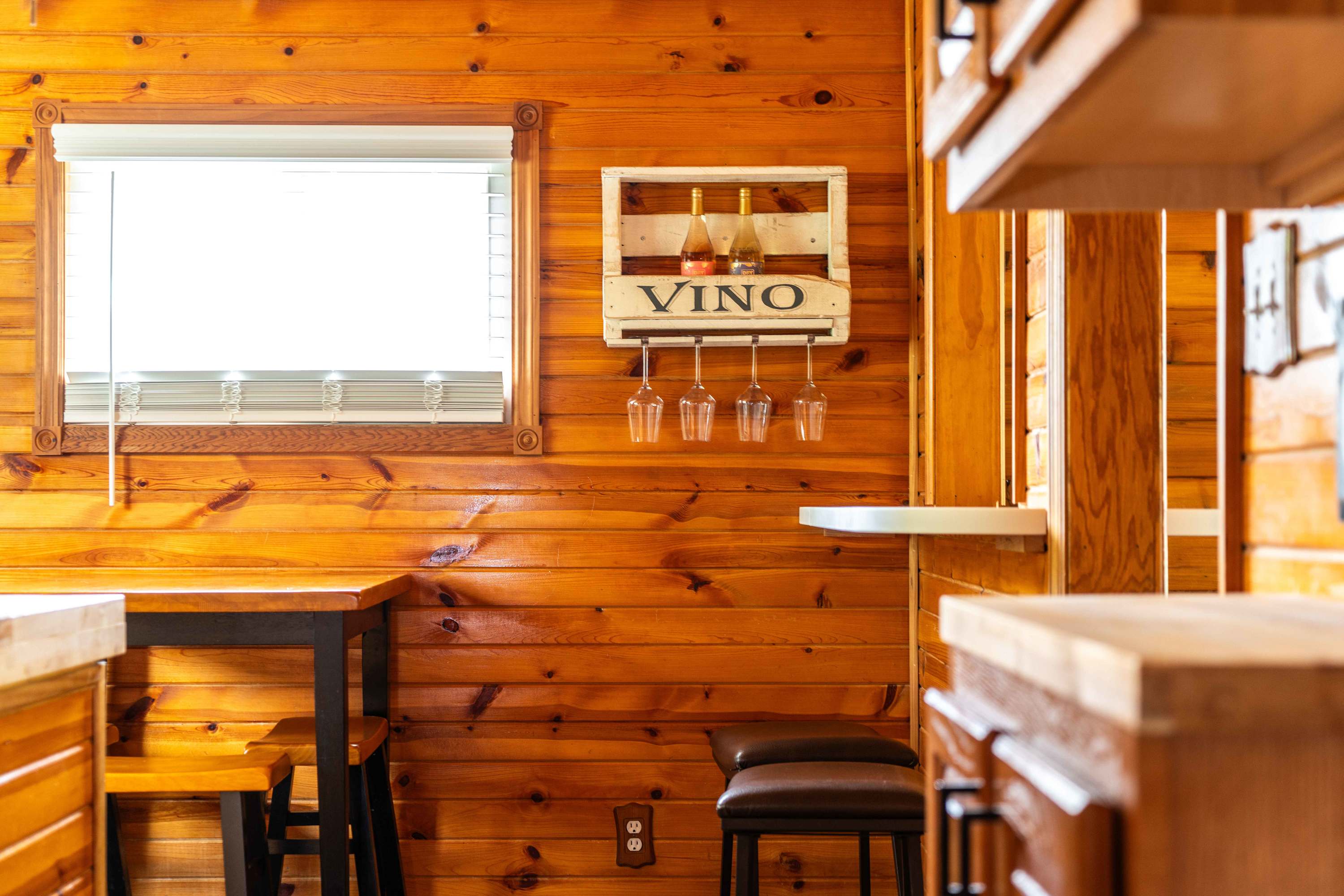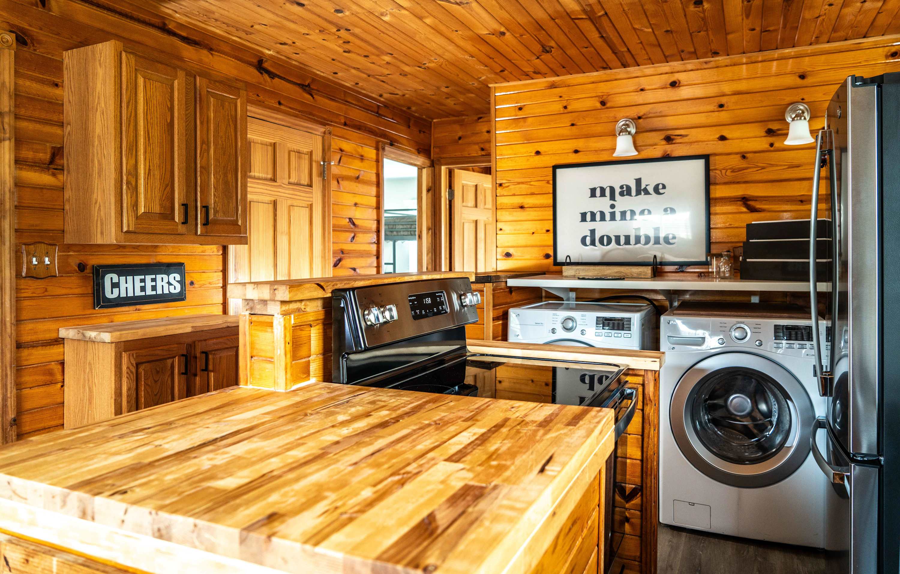 The home’s charming interior is every cabin-lover’s dream, with wood-paneled walls and ceilings embracing you in warmth and comfort. The living room provides ample leather sofa and recliner seating for evenings spent streaming all your favorite shows and movies on the smart TV. The eat-in kitchen offers everything you need to create delicious culinary delights in the convenience of home, with full sized appliances and ample countertop space and cabinetry for preparation and storage. Mealtimes are made simple with options for everyone at the table or the counter, each offering the opportunity to dine in good company.