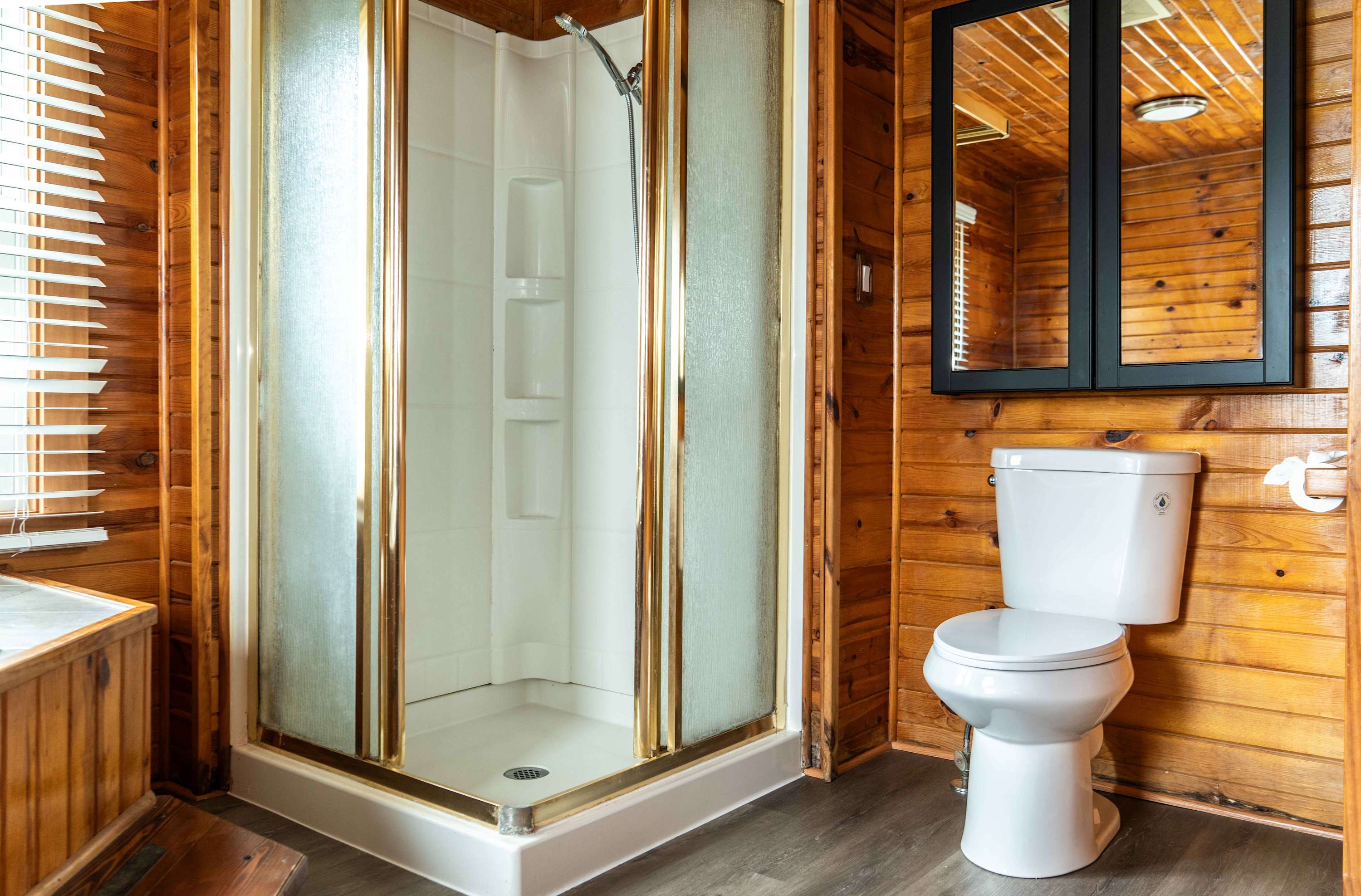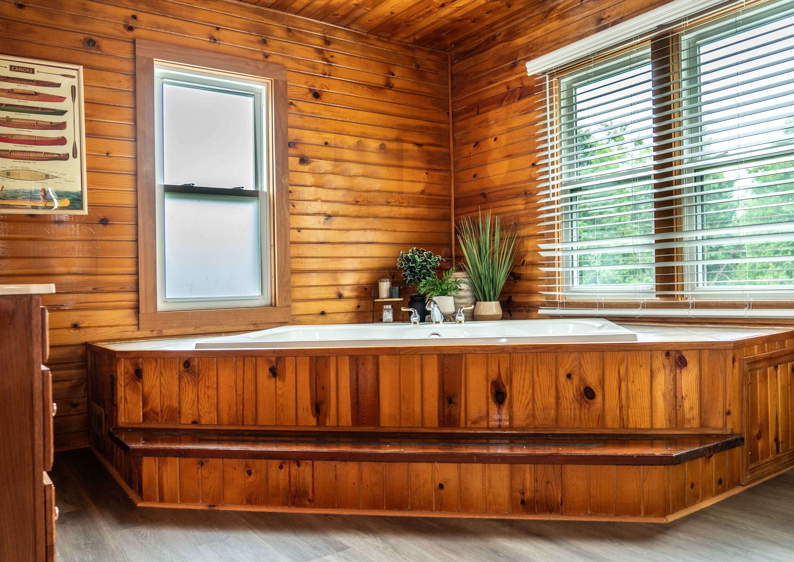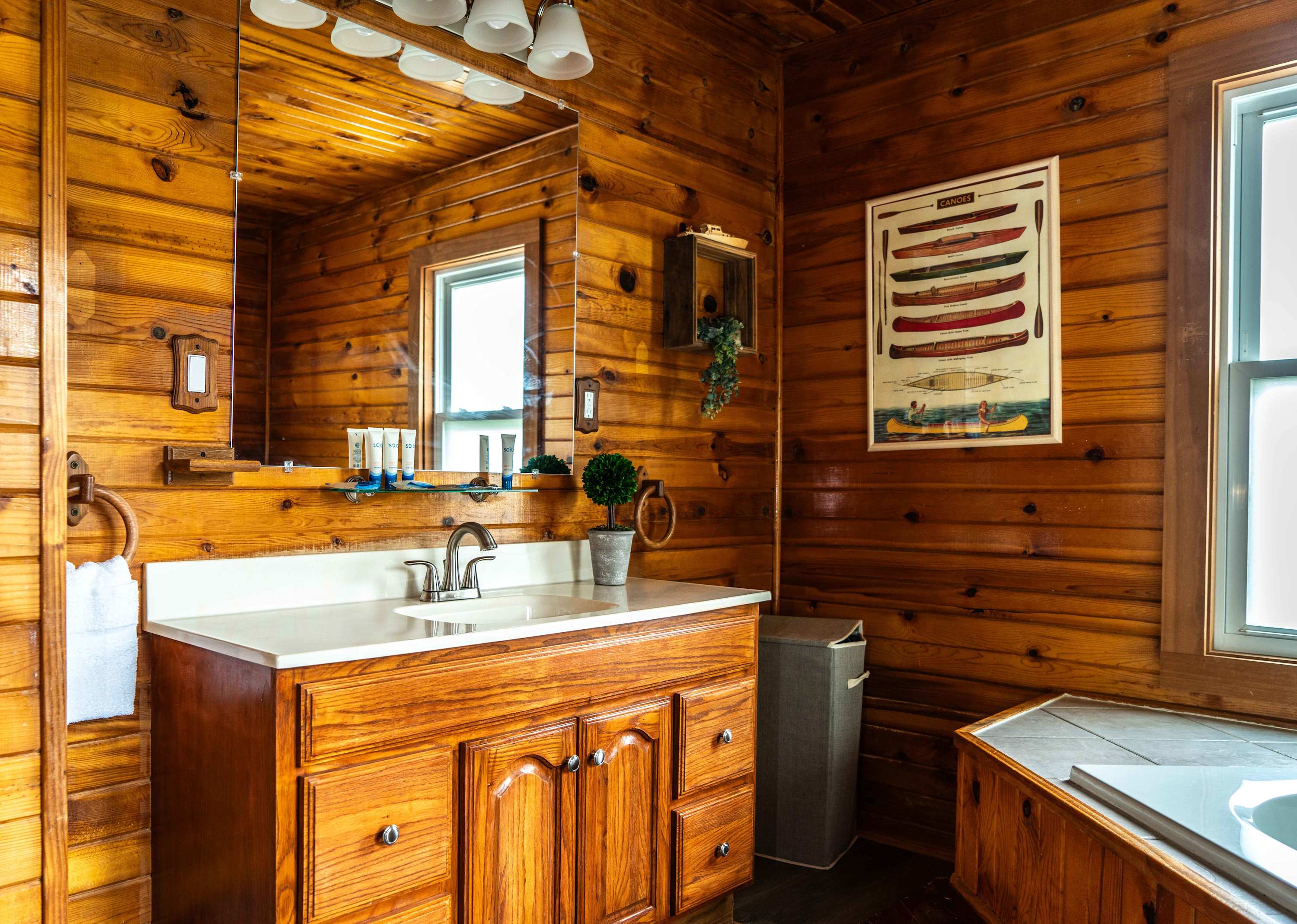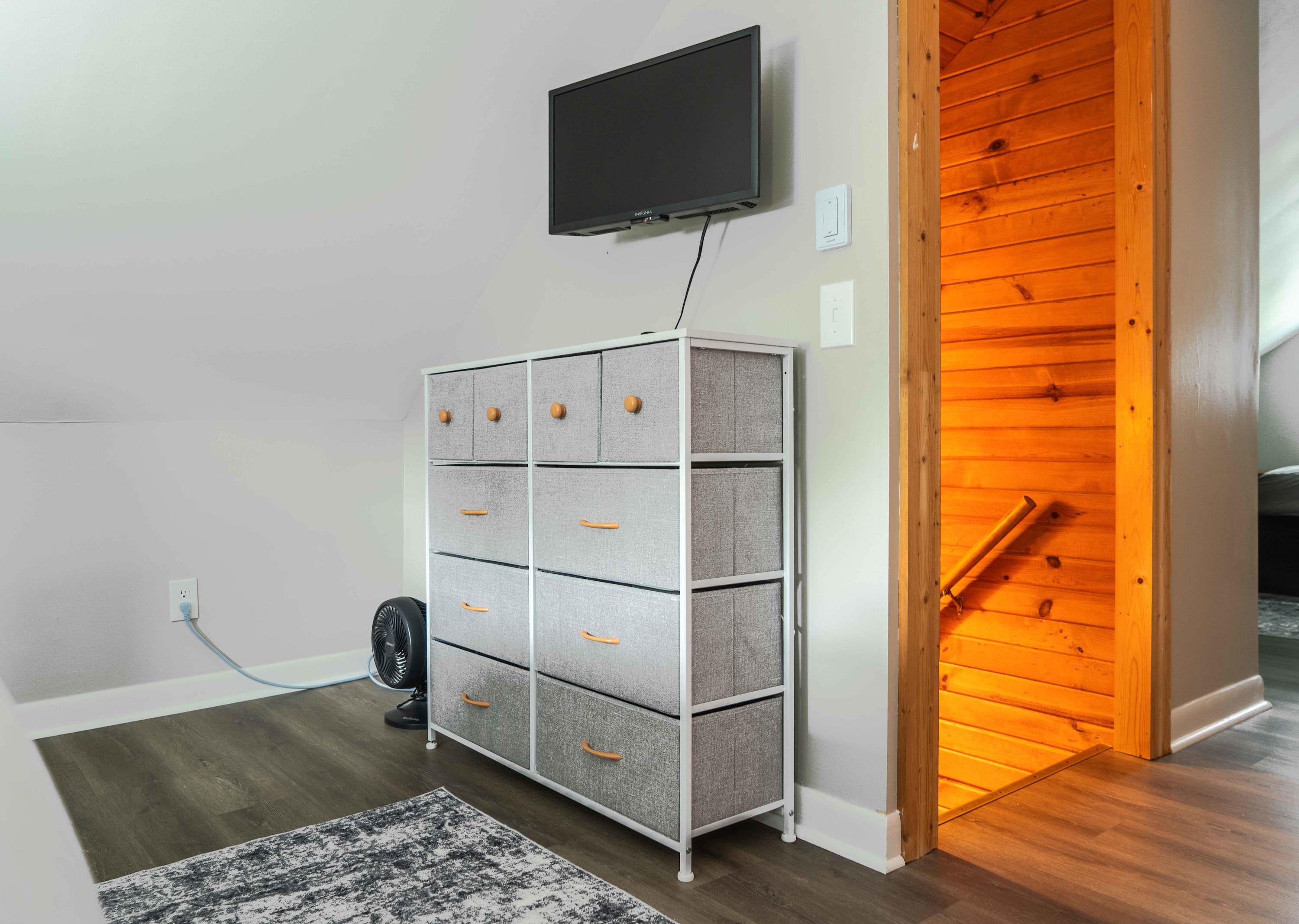 The home’s charming interior is every cabin-lover’s dream, with wood-paneled walls and ceilings embracing you in warmth and comfort. The living room provides ample leather sofa and recliner seating for evenings spent streaming all your favorite shows and movies on the smart TV. The eat-in kitchen offers everything you need to create delicious culinary delights in the convenience of home, with full sized appliances and ample countertop space and cabinetry for preparation and storage. Mealtimes are made simple with options for everyone at the table or the counter, each offering the opportunity to dine in good company.