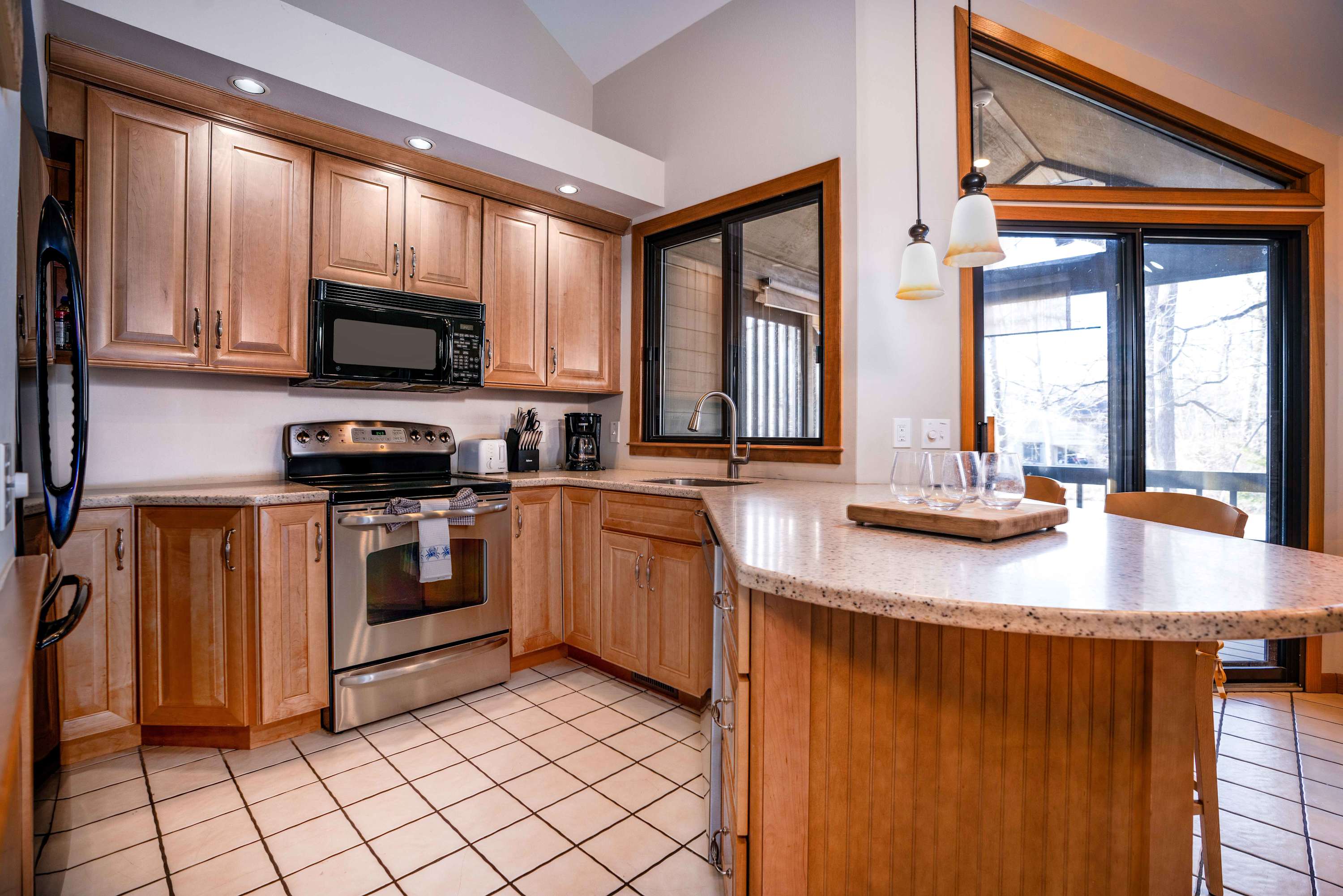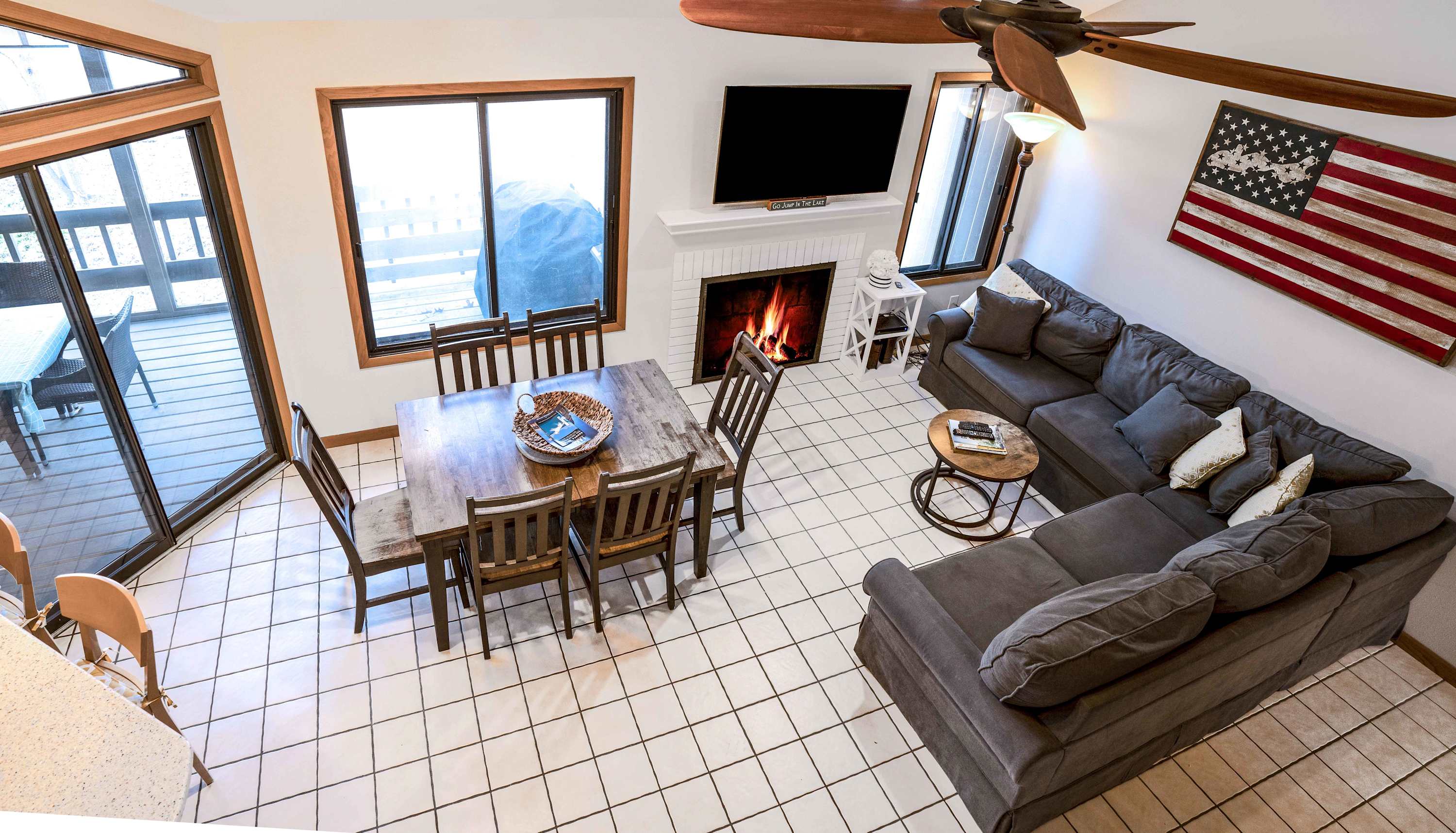 The home’s bright and airy open floor plan will be your retreat for relaxation as well as connectivity, with enough room for everyone to spread out and find their own cozy corner. Vaulted ceilings and large windows help to illuminate the space in natural light, keeping the picturesque outdoors front and center. Sink into plush sofa seating in the living room to stream your favorite episodes on the smart TV, the fireplace keeping you warm and toasty in the cooler months. The dining room table with seating for 6 is the perfect venue for mealtimes or a spontaneous game night. The modern kitchen showcases full sized appliances, granite counters, and ample cabinetry stocked with cookware and dining ware. Steps away, you’ll be back out on the home’s private balcony where you can grill up a delicious barbeque lunch or enjoy a meal al fresco. If you’re seeking some quiet time away from the group, a second living area on the home’s lower level supplies its own comfy sofa, smart TV, and fireplace where you can curl up to watch a movie or turn the pages of a new book.