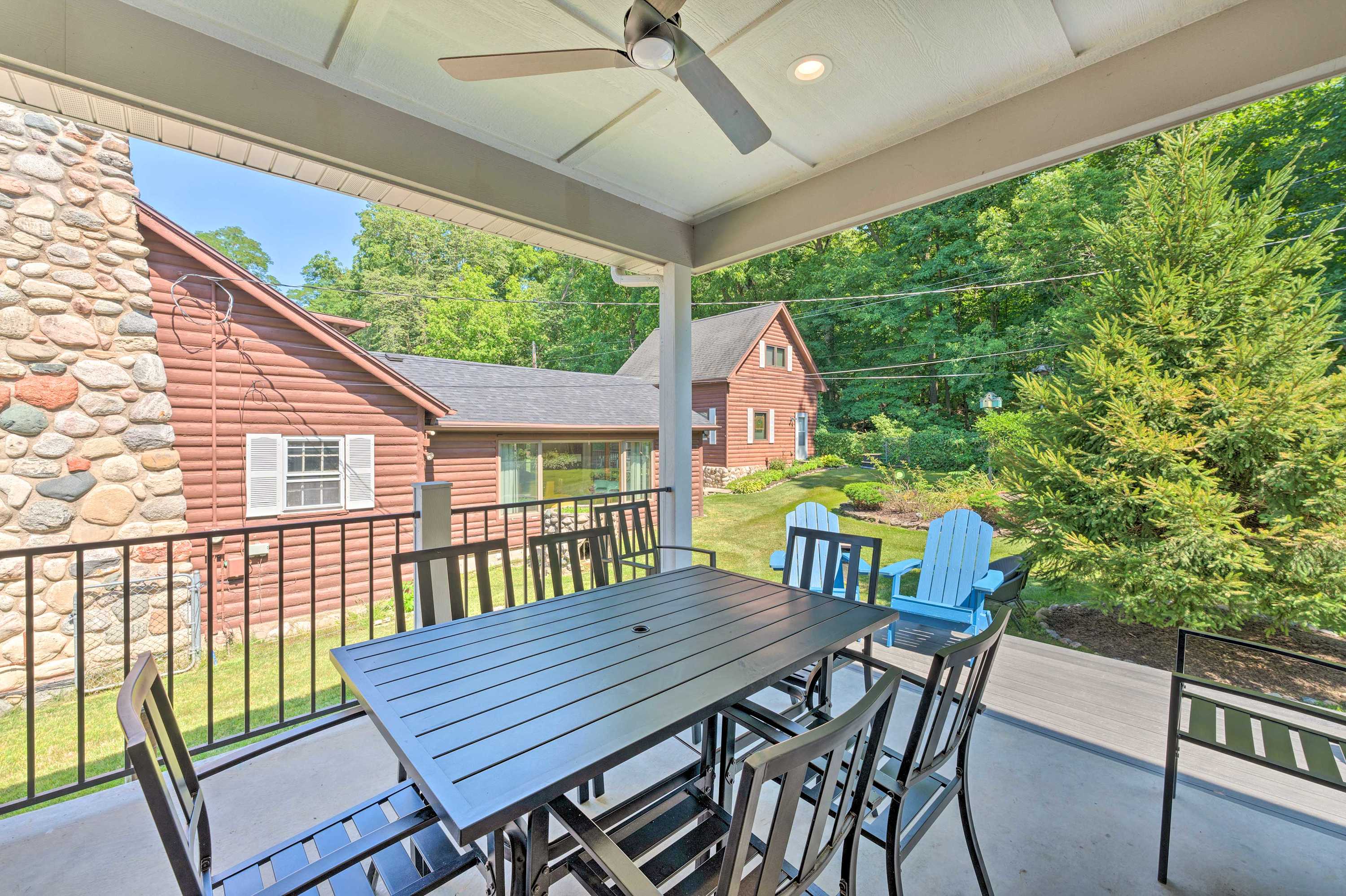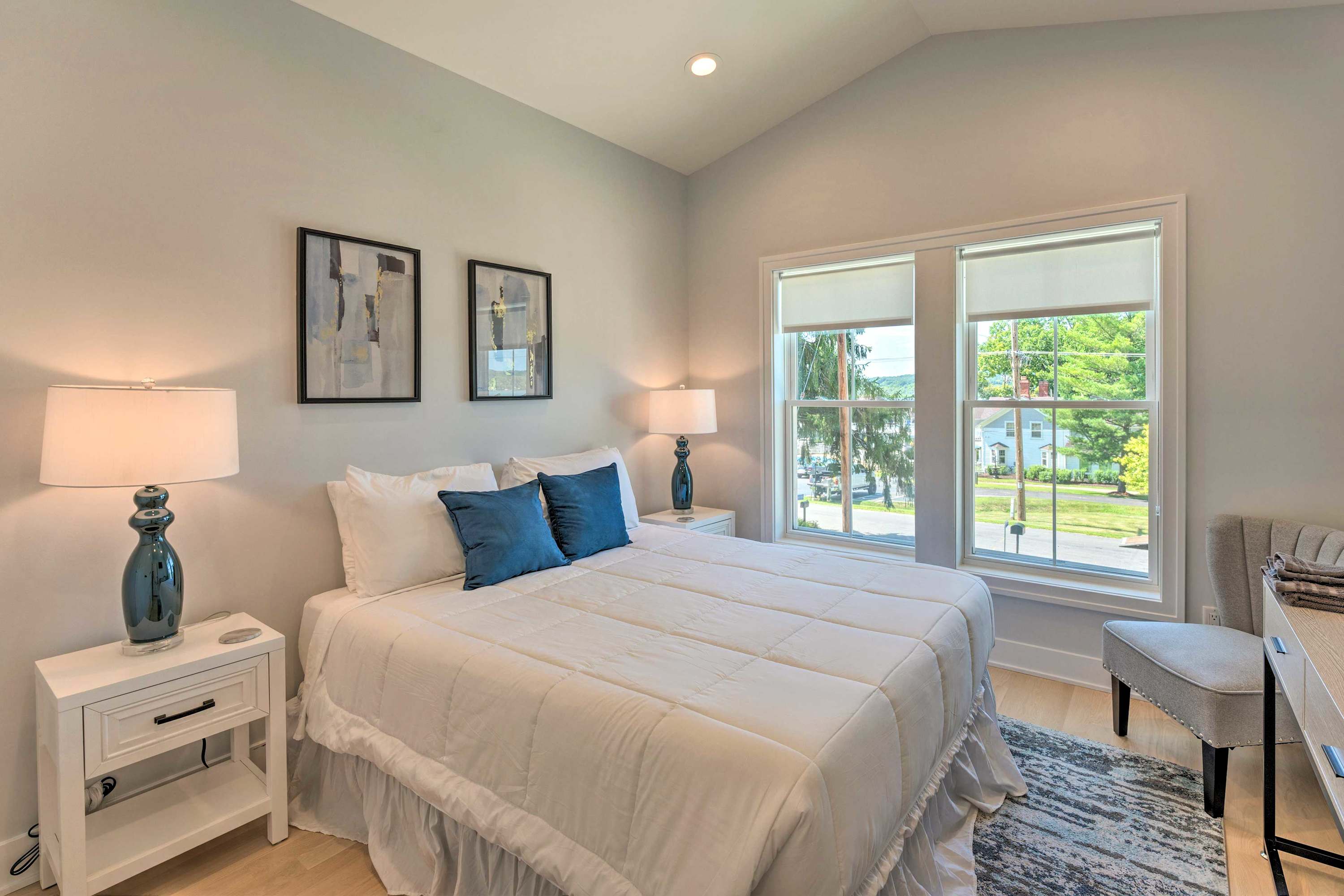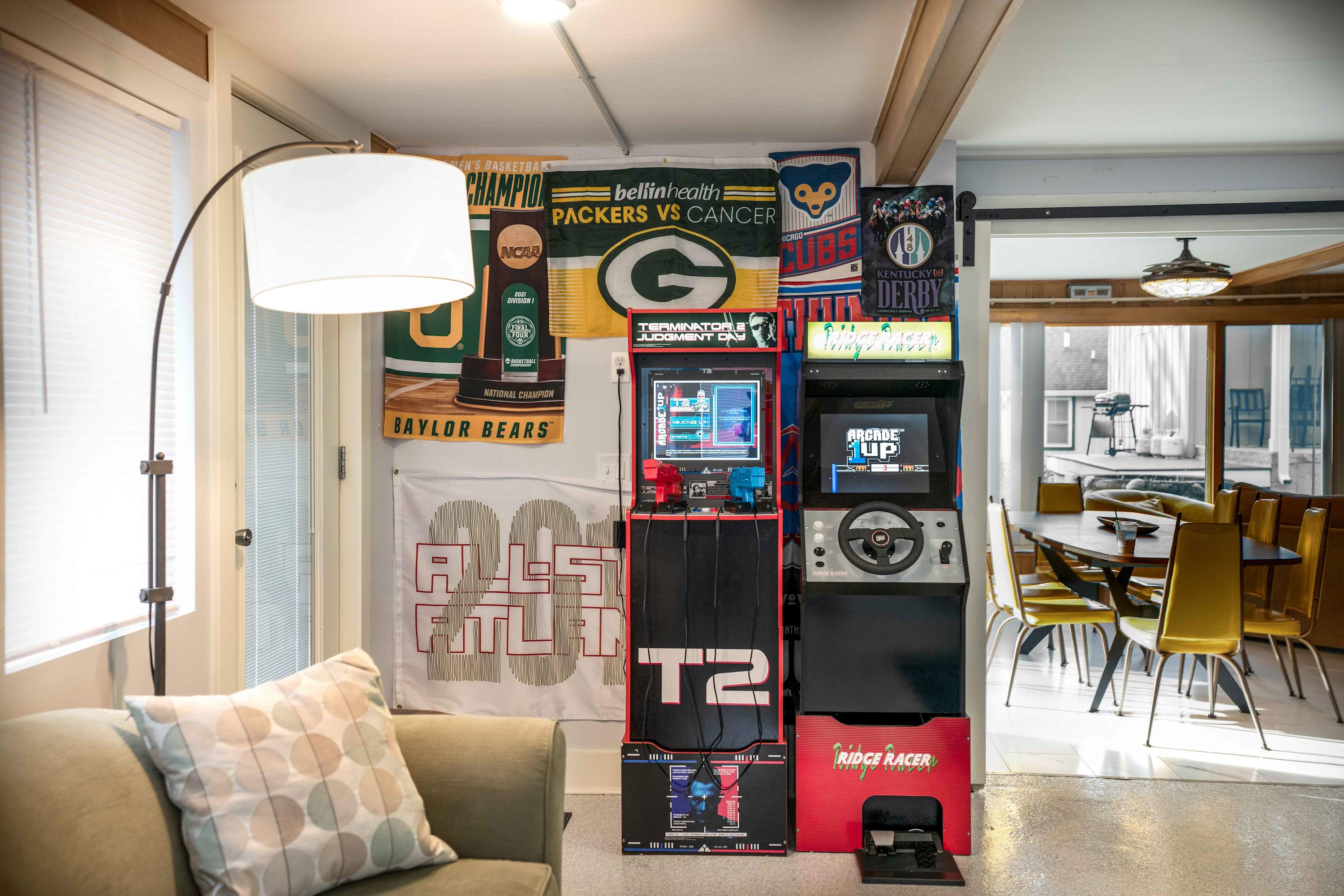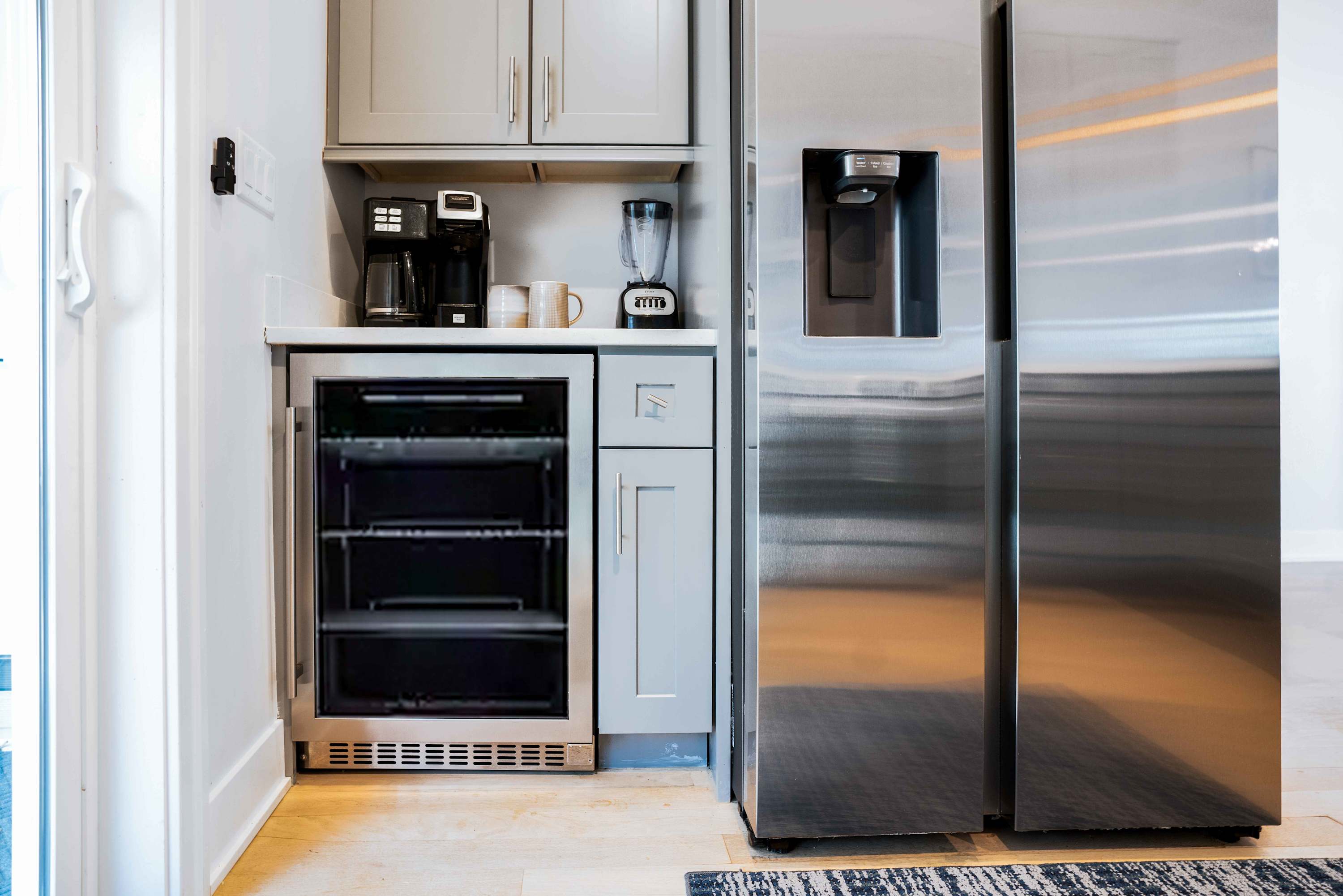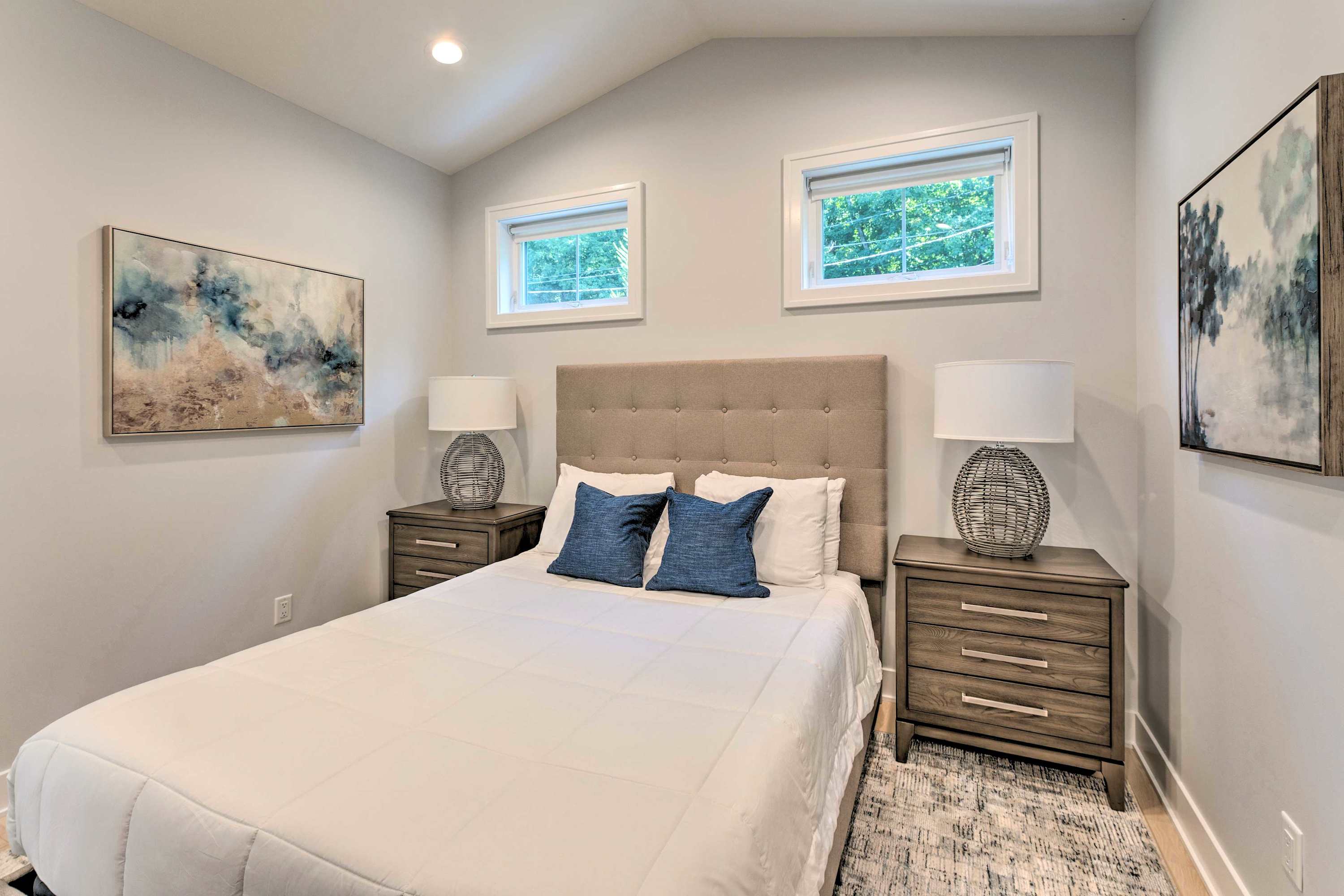 In Como Cabin, multiple spaces offer versatile options for both relaxation and entertainment, including the added bonus of a separate guest home at the back of the property. You will be immersed in the cabin vibe as soon as you step through the door, taking note of the warm wood accents and nature-inspired décor. Curl up on the plush living room sofa and armchair seating while you catch up on episodes of your favorite show on the smart TV, the electric fireplace keeping you warm and toasty. Steps away, the lounge is illuminated in natural light courtesy of the large picture windows offering views around the property. Host cocktail hour at the bar or gather the crew together for a game of cards at the chic table with seating for 8. The modern, updated kitchen showcases stainless steel appliances, stone countertops, and striking cabinetry well-stocked with cookware and dining ware for whatever your culinary aspirations.