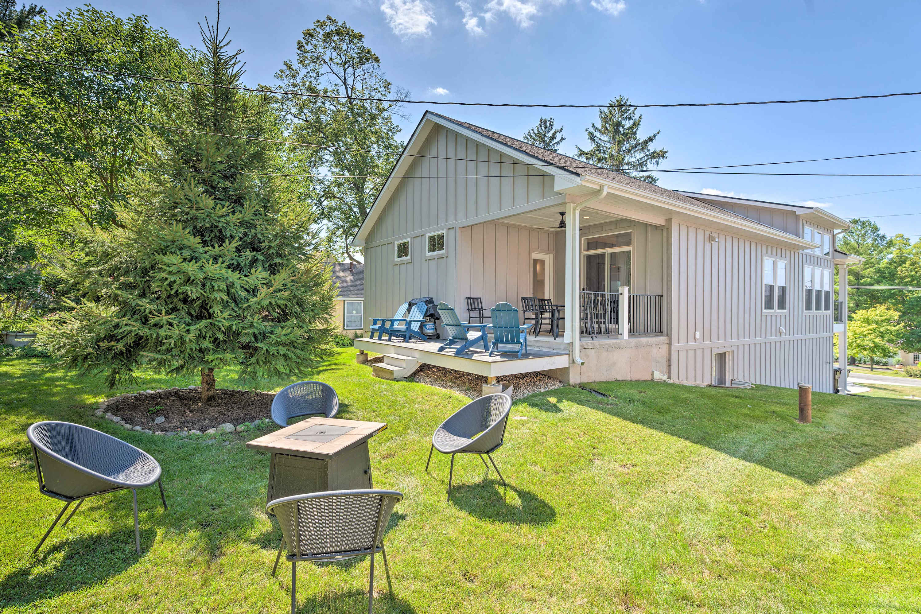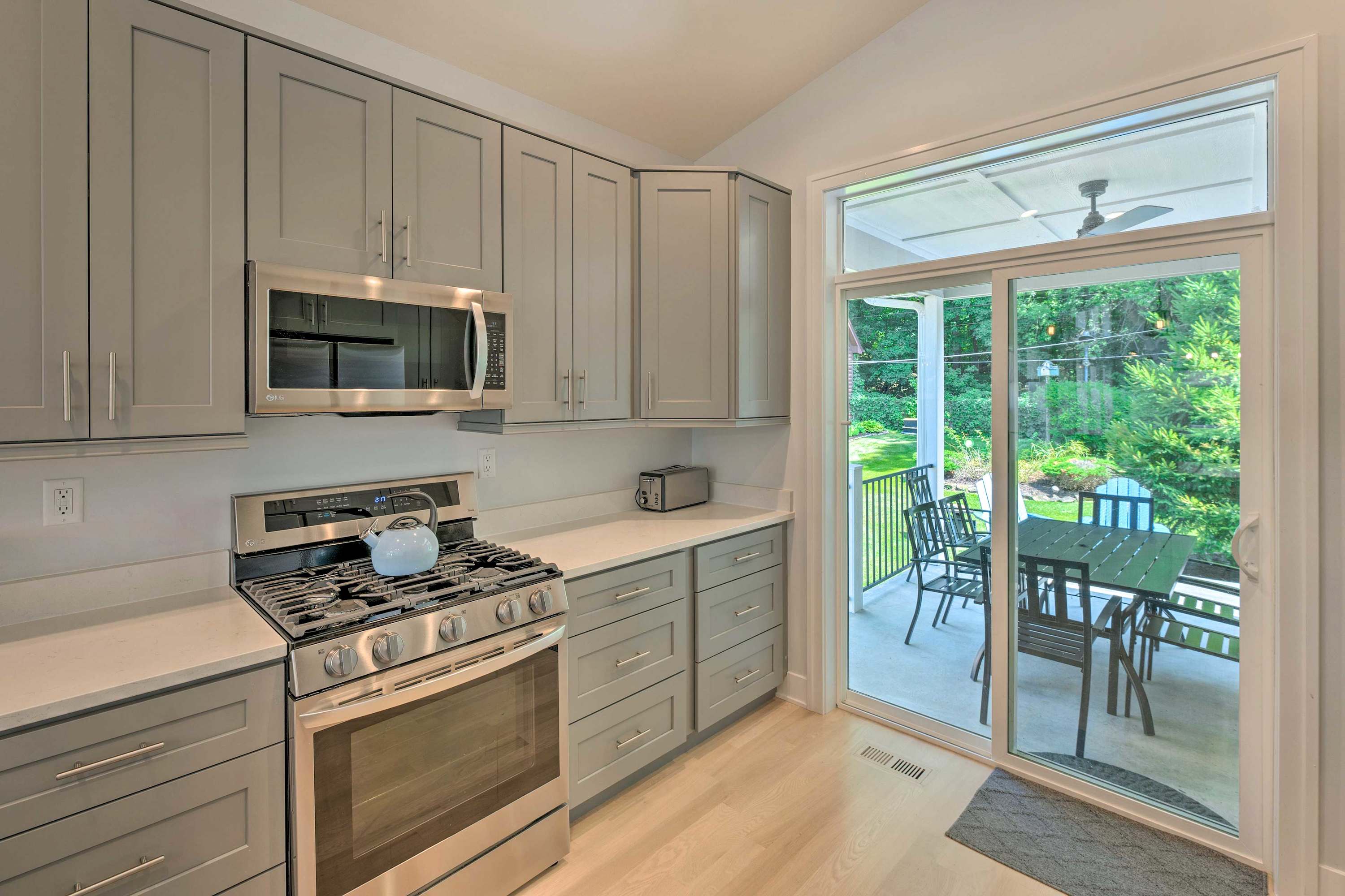Stepping into the home’s stylish interior, you’ll be greeted by soaring vaulted ceilings and large picture windows illuminating spaces in natural light. The open concept keeps conversation and connectivity flowing, never leaving anyone behind. Relax in the living room on plush sofa seating, taking in panoramic lake views while streaming episodes of your favorite show on the smart TV. The fully equipped kitchen is a chef’s dream, showcasing stainless steel appliances, glossy countertops, and sleek cabinetry stocked with cookware and dining ware for whatever your culinary aspirations. Grab a seat at the counter to help with meal preparation or enjoy a delicious spread of afternoon hors d’oeuvres. You’ll have the option of taking your meals indoors at the elegant dining table with seating for 8, or al fresco on the deck with seating for 6. End your days on the back patio gathered around the fire table, toasting marshmallows underneath the glittering sky.