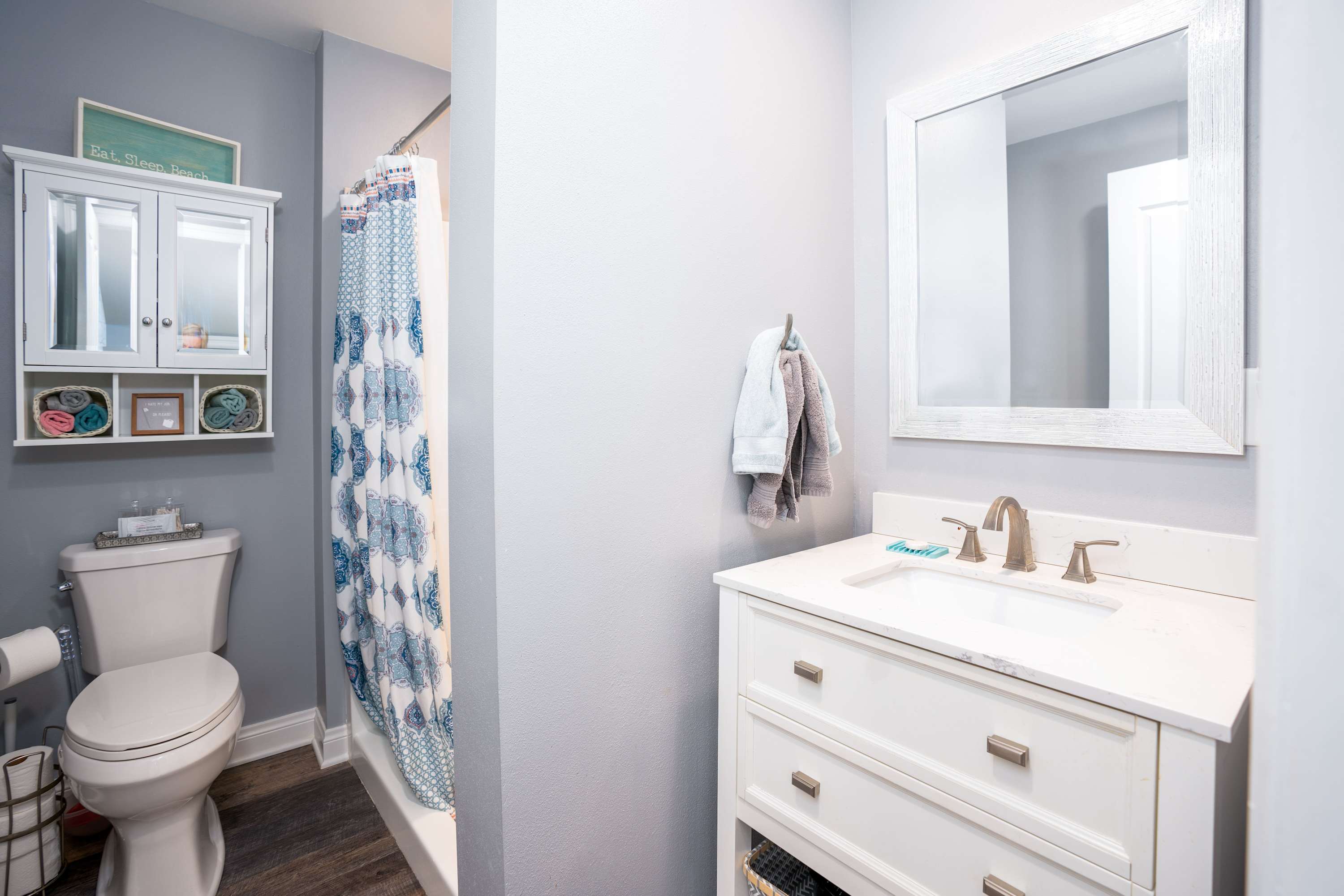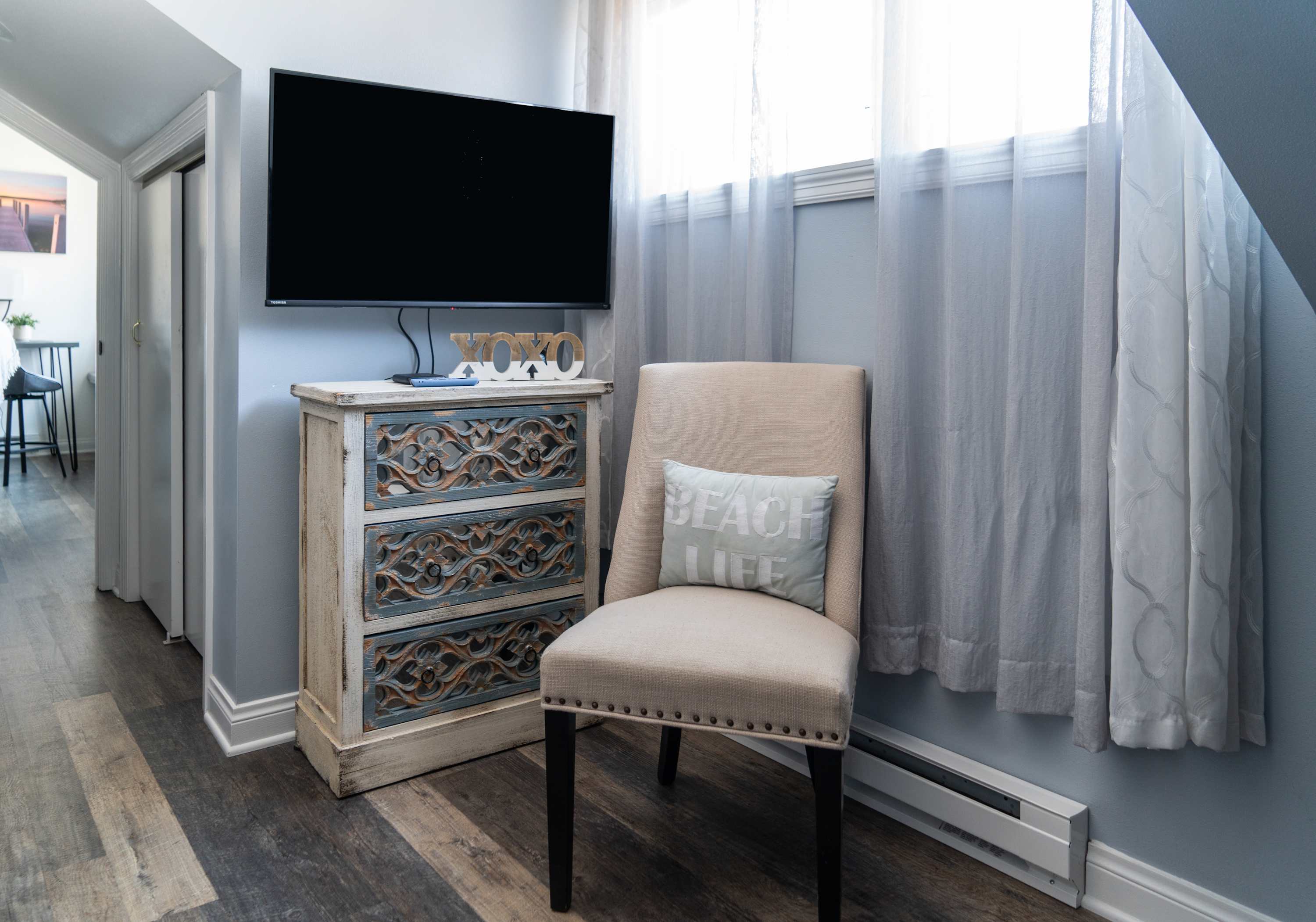 This home comfortably sleeps 2 guests in a private bedroom featuring a smart TV, spacious queen size bed with fresh linens and soft blankets for a great night’s sleep. The home’s full bathroom is an ensuite to the bedroom and includes a single vanity and walk-in shower.