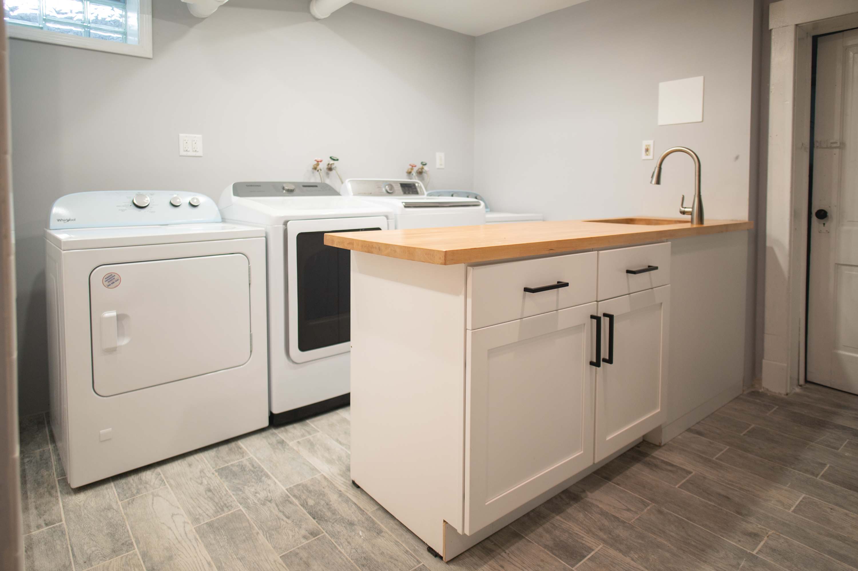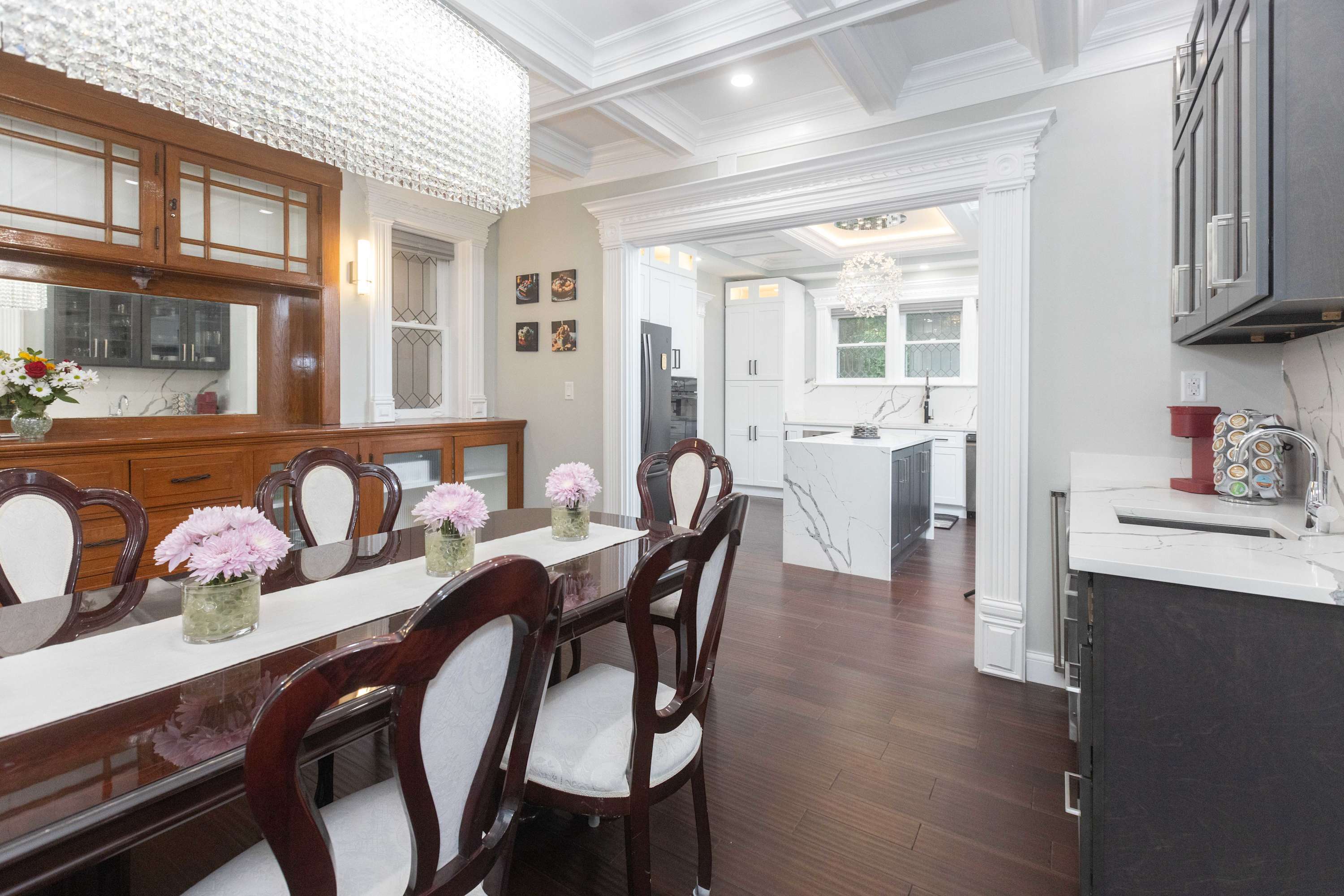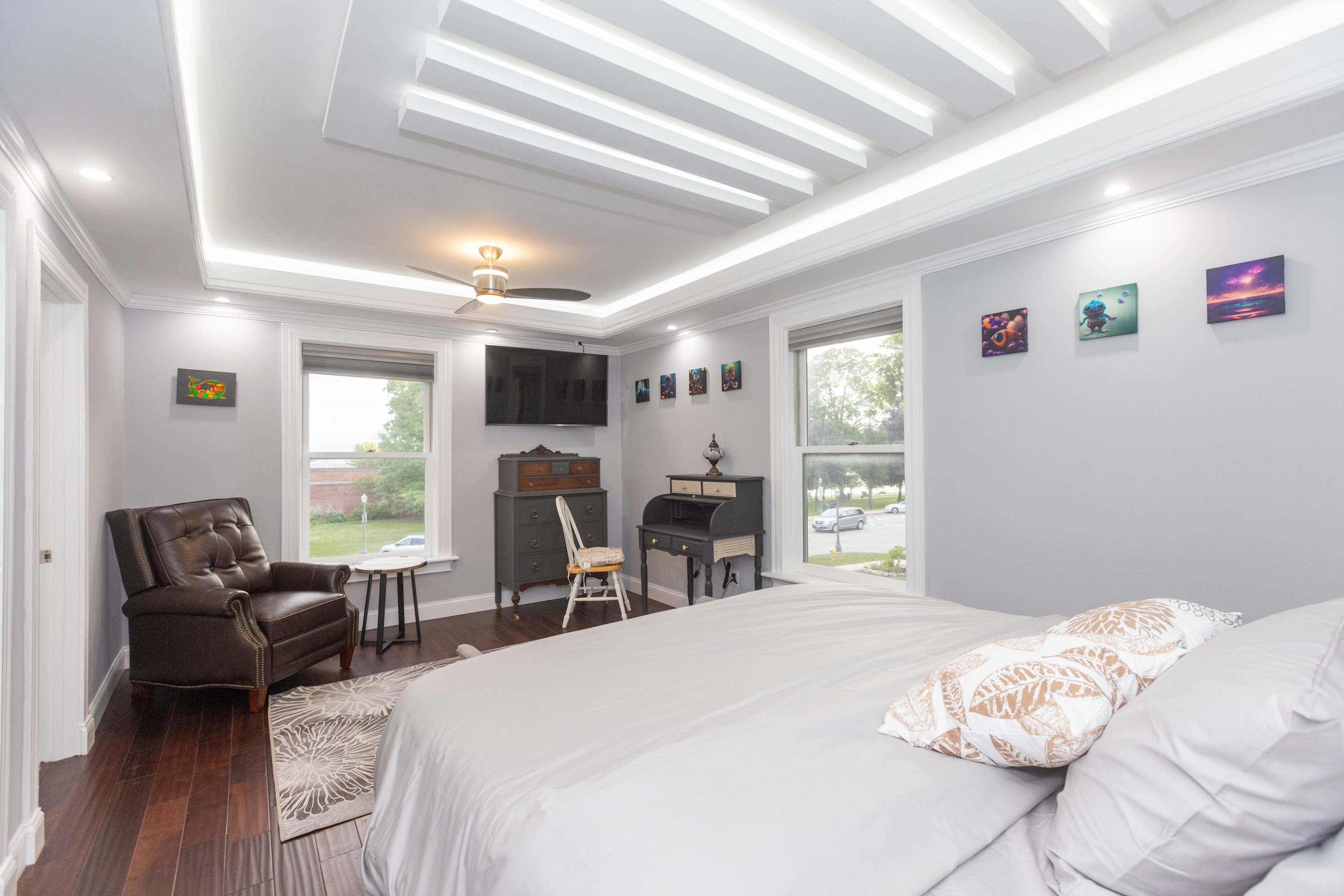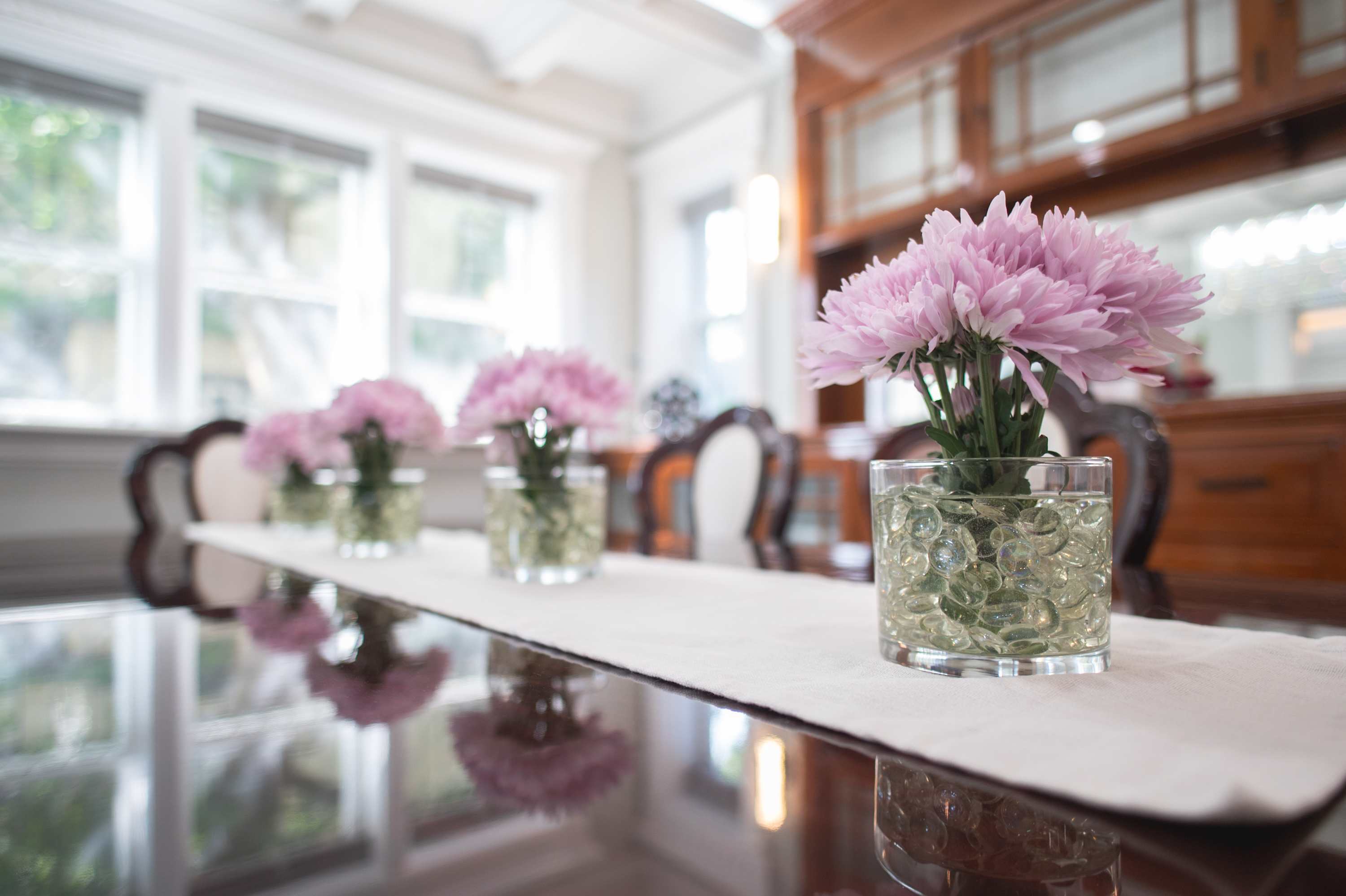 The interior of the home is as, if not more, impressive as the exterior, with gorgeous woodwork and antique detailing throughout. The bright and airy front sunroom is a wonderful place to enjoy a quiet book or your morning coffee while you watch the neighborhood come to life. Heading further indoors you’ll find a cozy living room with plush sofa seating, a mounted smart TV, and gas fireplace where you can light up the ambiance and create a warm setting for an immersive movie night during the cooler nights or months. Steps away, the formal dining room features an elegant table with enough seating for 6. Flow into the pristine kitchen, a chef’s dream with stainless steel appliances, marble countertops, and single serve coffee maker. A full suite of cookware and dining ware are ready to accommodate any of your mealtime adventures whether you decide to whip up delicious home cooked meals or present takeout from a delicious local restaurant.