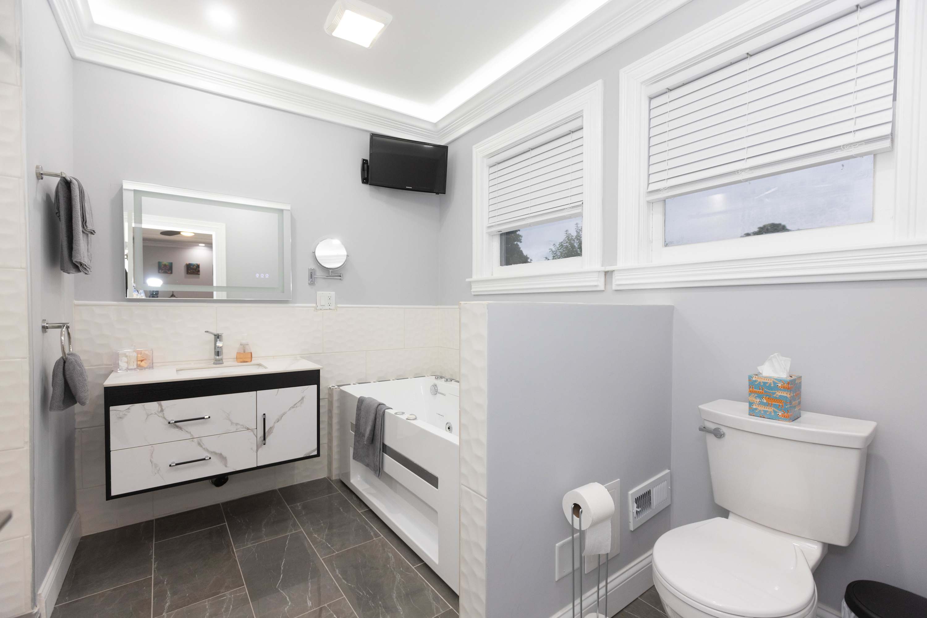 - Bedroom #1 includes a king size bed, smart TV, work desk, and ensuite bathroom with a single vanity, Jacuzzi tub, and walk-in shower.