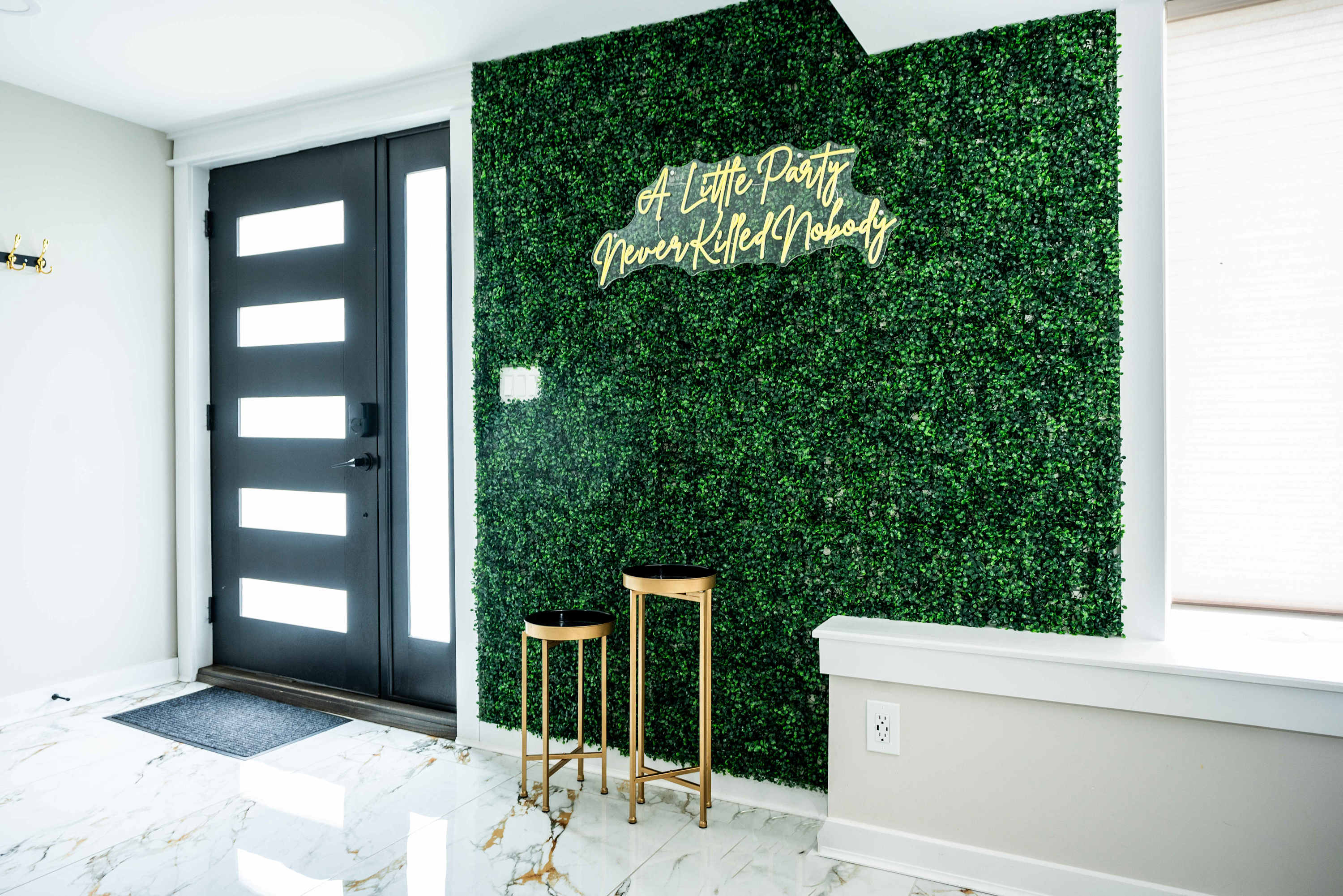 Inside, the open-concept living room, kitchen, and dining area are designed to keep everyone connected. Snap a picture with the tripod ring light and your own device in front of the neon sign & green wall - after all, A Little Party Never Killed Nobody!