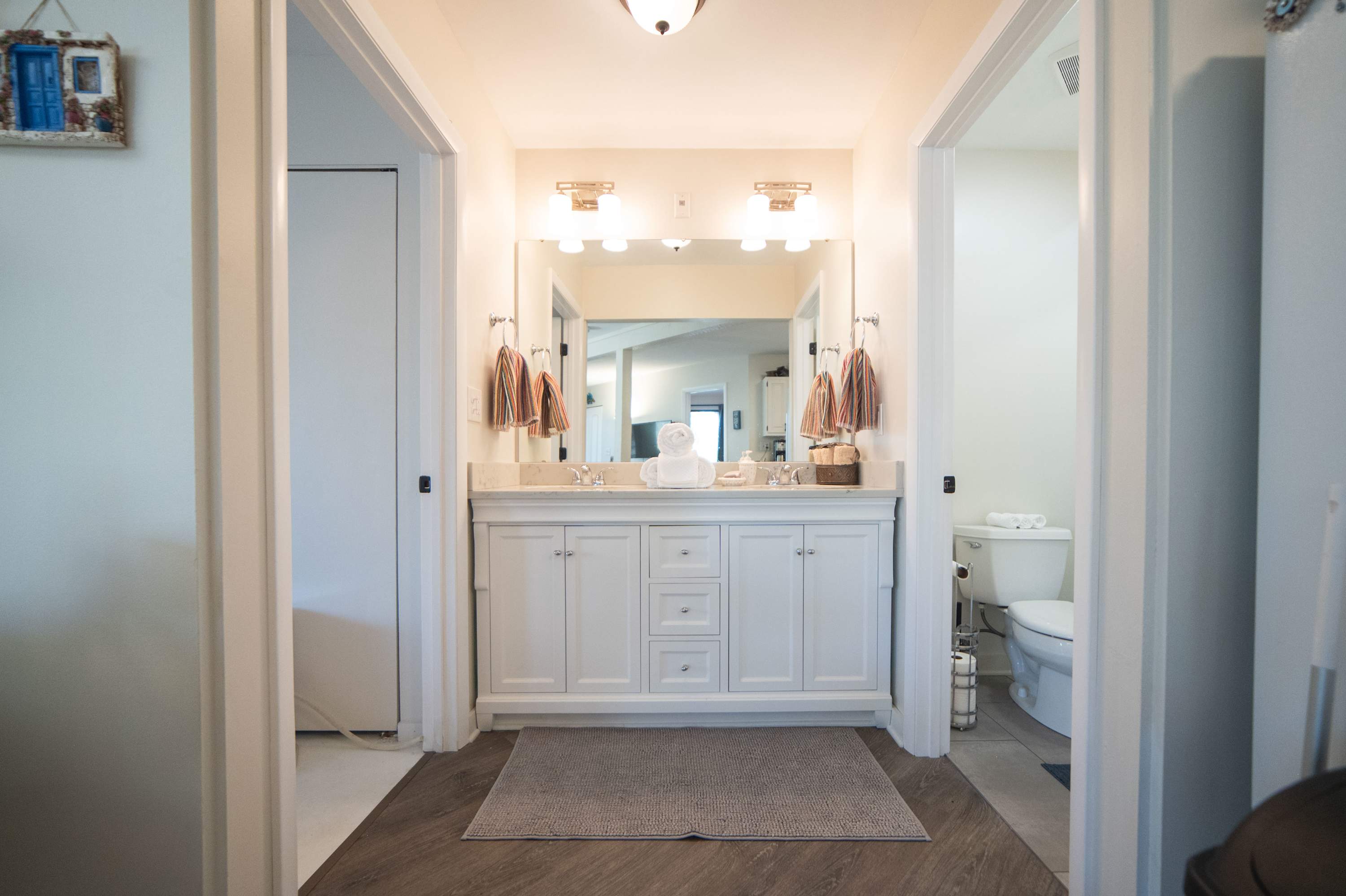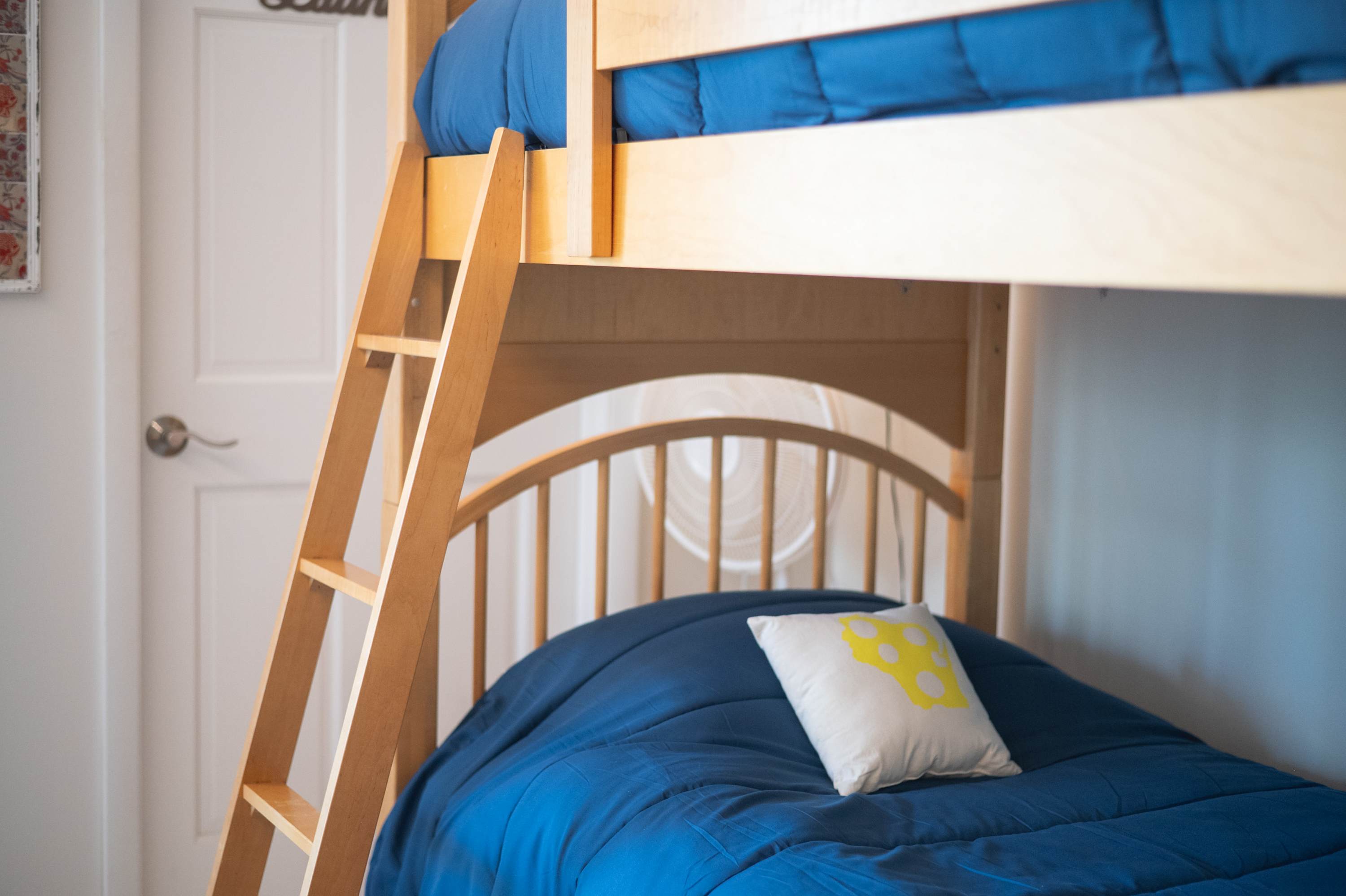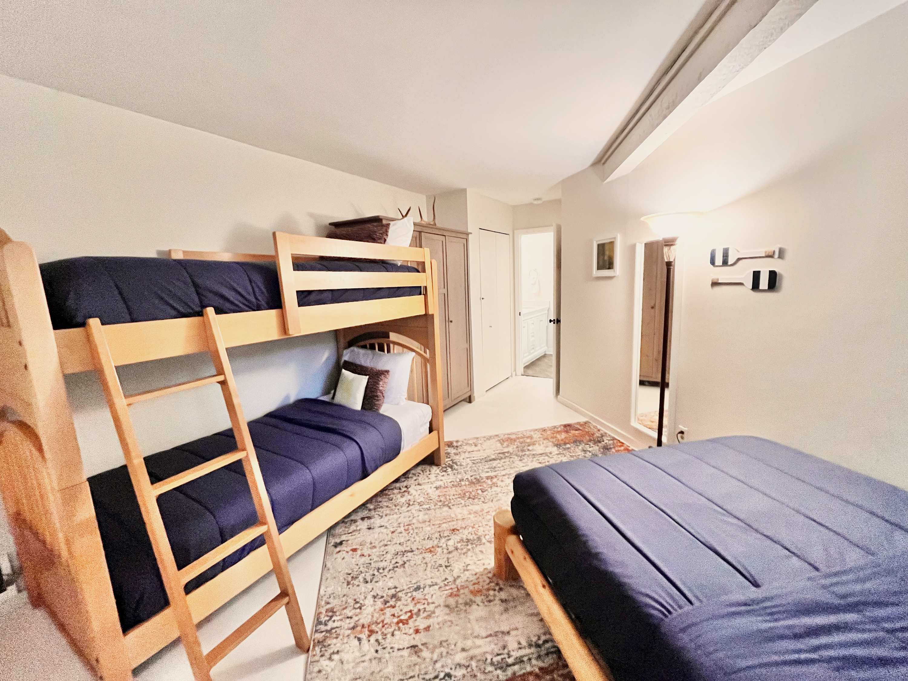 Bedroom #2 includes full size bed and 2 twin size beds in bunk format. This room also provides access to the home’s deck.