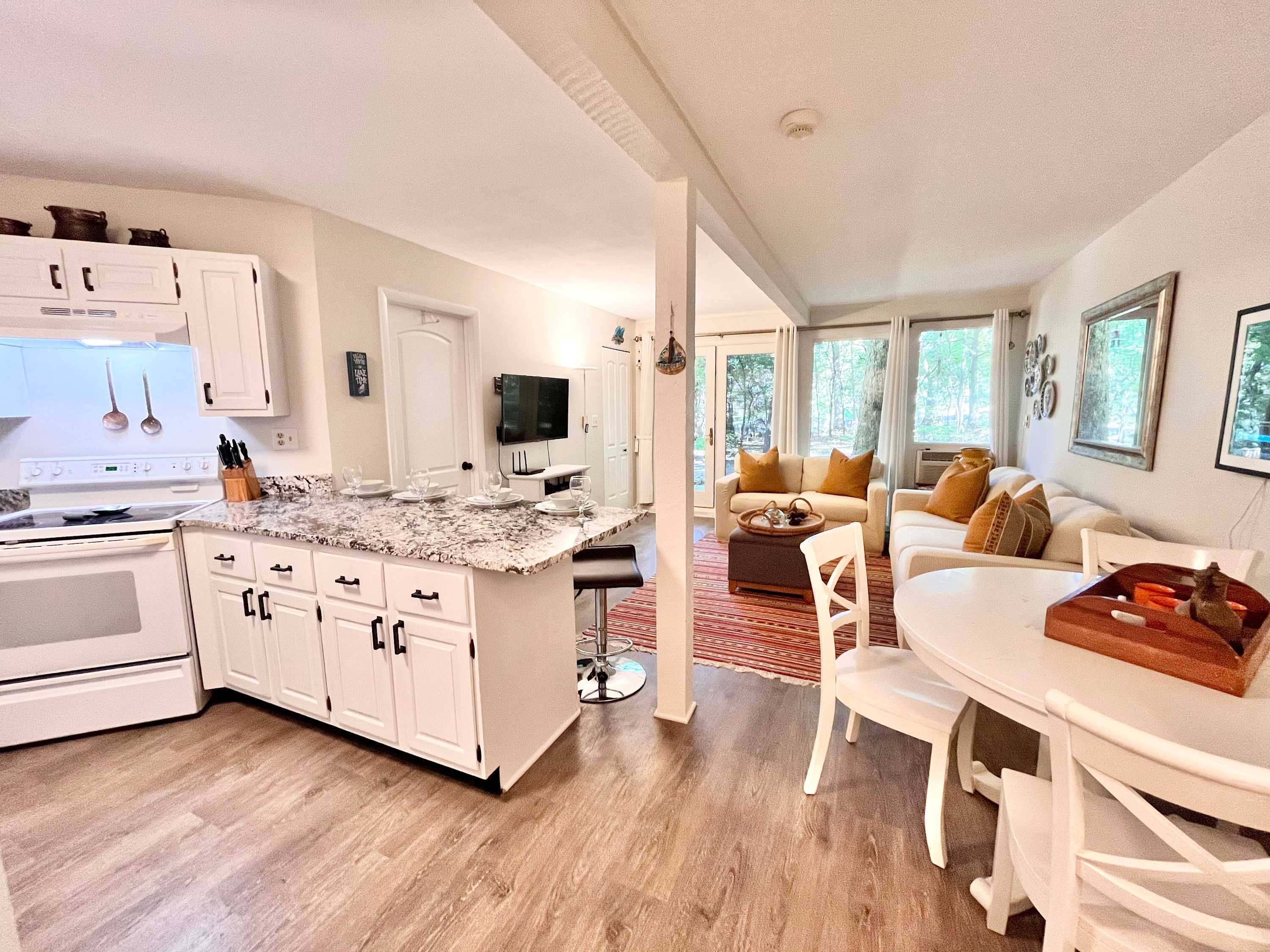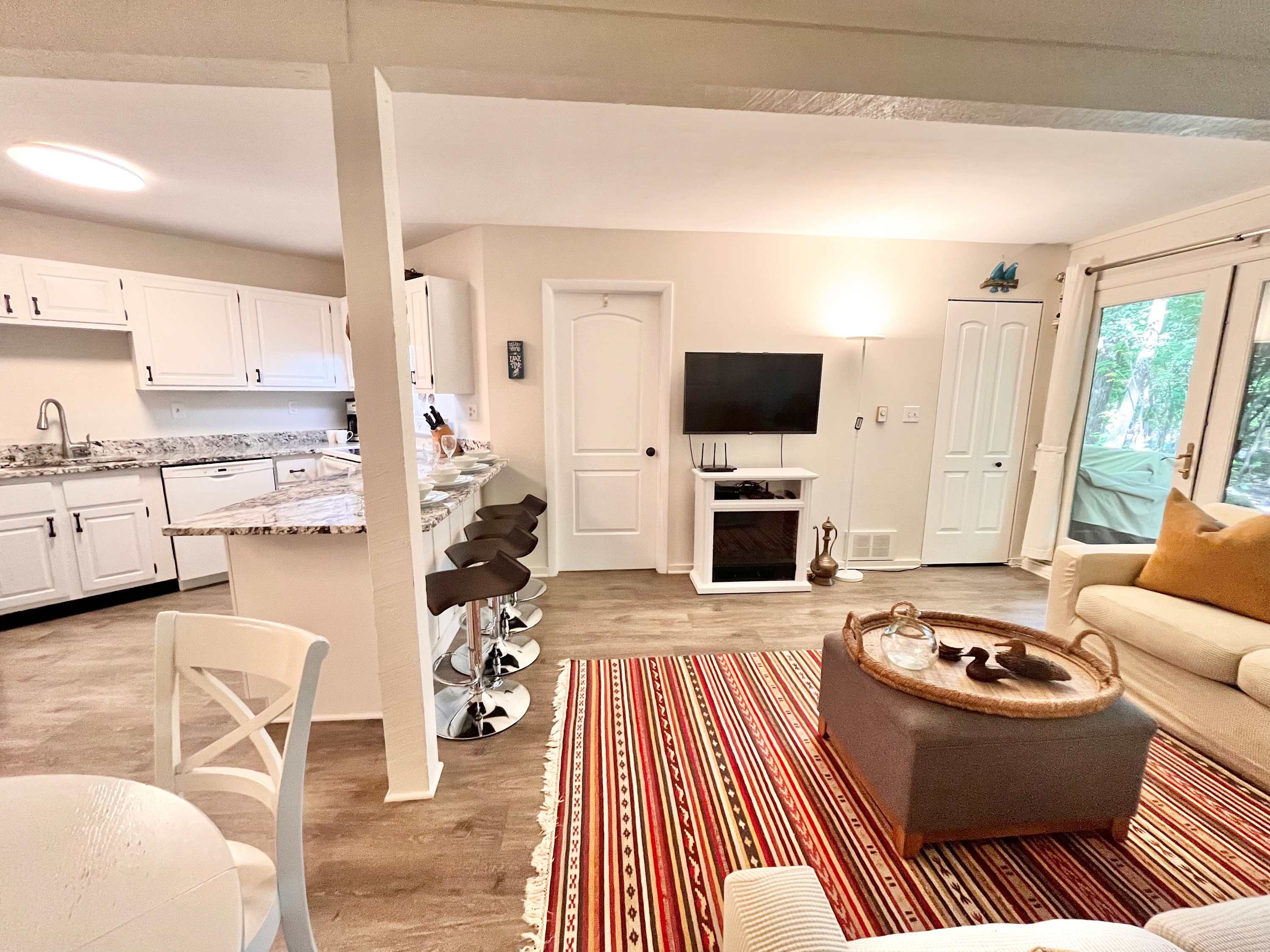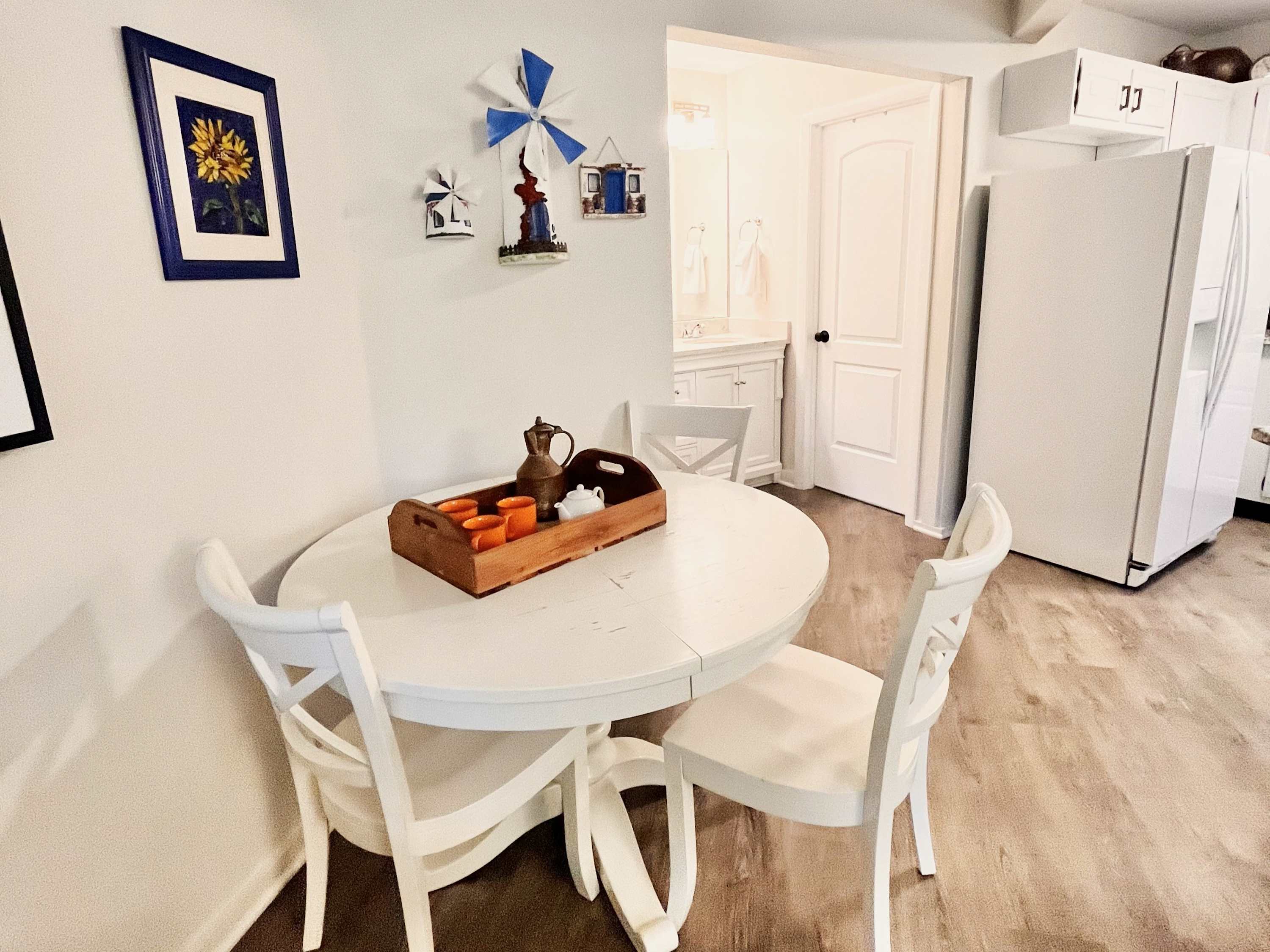 Relax after a long day exploring the area on the covered patio furnished with comfortable outdoor sofa seating while you enjoy the sun and fresh air. The café table for 2 is the perfect place for your morning coffee as you plan the agenda ahead. Indoors, the naturally lit and open living room features plush sofa seating with a mounted TV and electric fireplace when you need a warmup during the cooler nights and months. In the dining room, a high-top table offers seating for 4 with additional kitchen counter seating for another 4 just steps away. Whether you’re sitting down for a formal meal or a quick bite before heading out the door, these spaces can accommodate either. Speaking of meals, the kitchen features bright white cabinetry and shiny countertops, well-equipped with all standard appliances, a drip coffee maker, cookware, and dining ware for homecooked meals or preparing takeout from a delicious new restaurant.