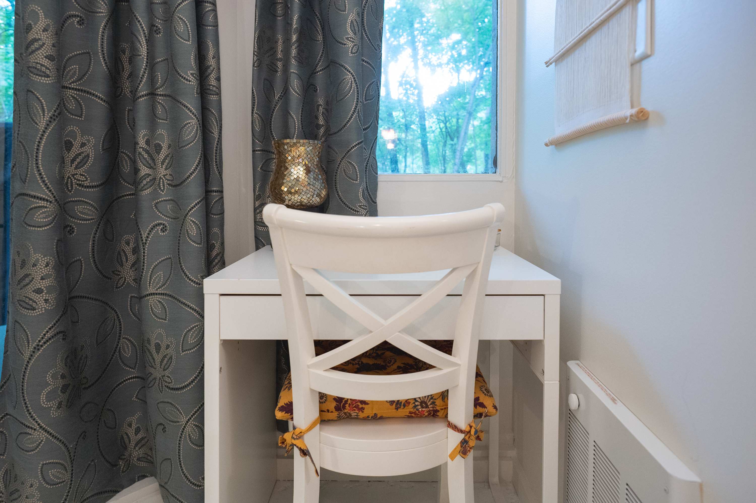 Bedroom #1 includes a king size bed, private deck access, and a small desk that can serve as a private workspace.
