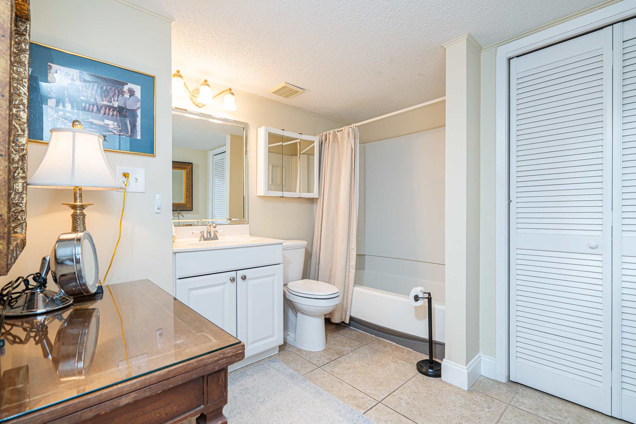 Guest Bathroom (located at end of hallway): Shower/Tub combo and Vanity seating area