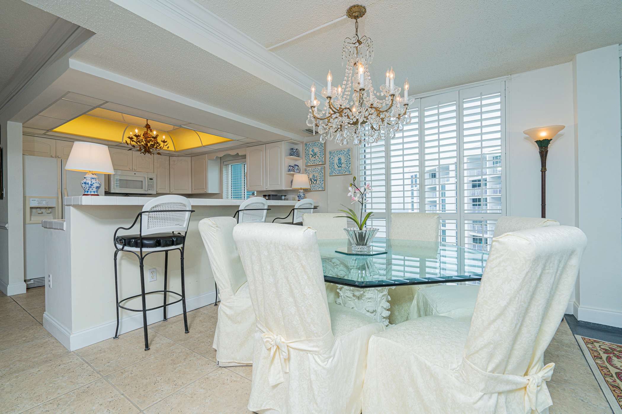 Elegant dining area featuring a six-seat dining table with comfortable, slipcovered chairs—perfect for shared meals or game nights. This space is accented by a beautiful chandelier. Making it ideal for gathering and entertaining during your stay.
