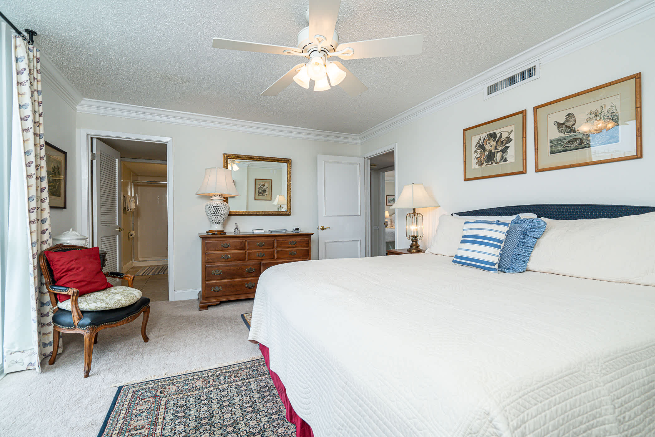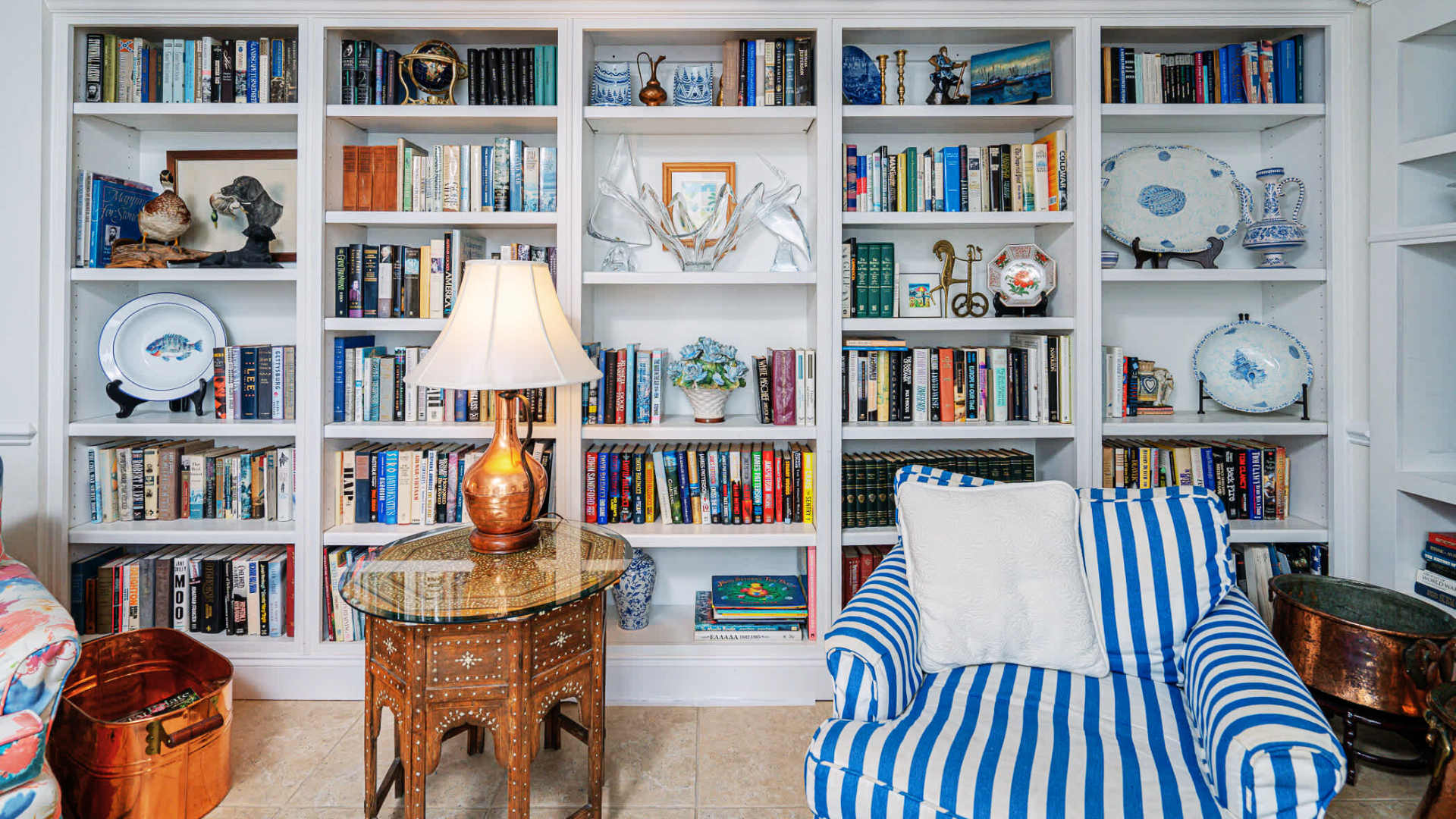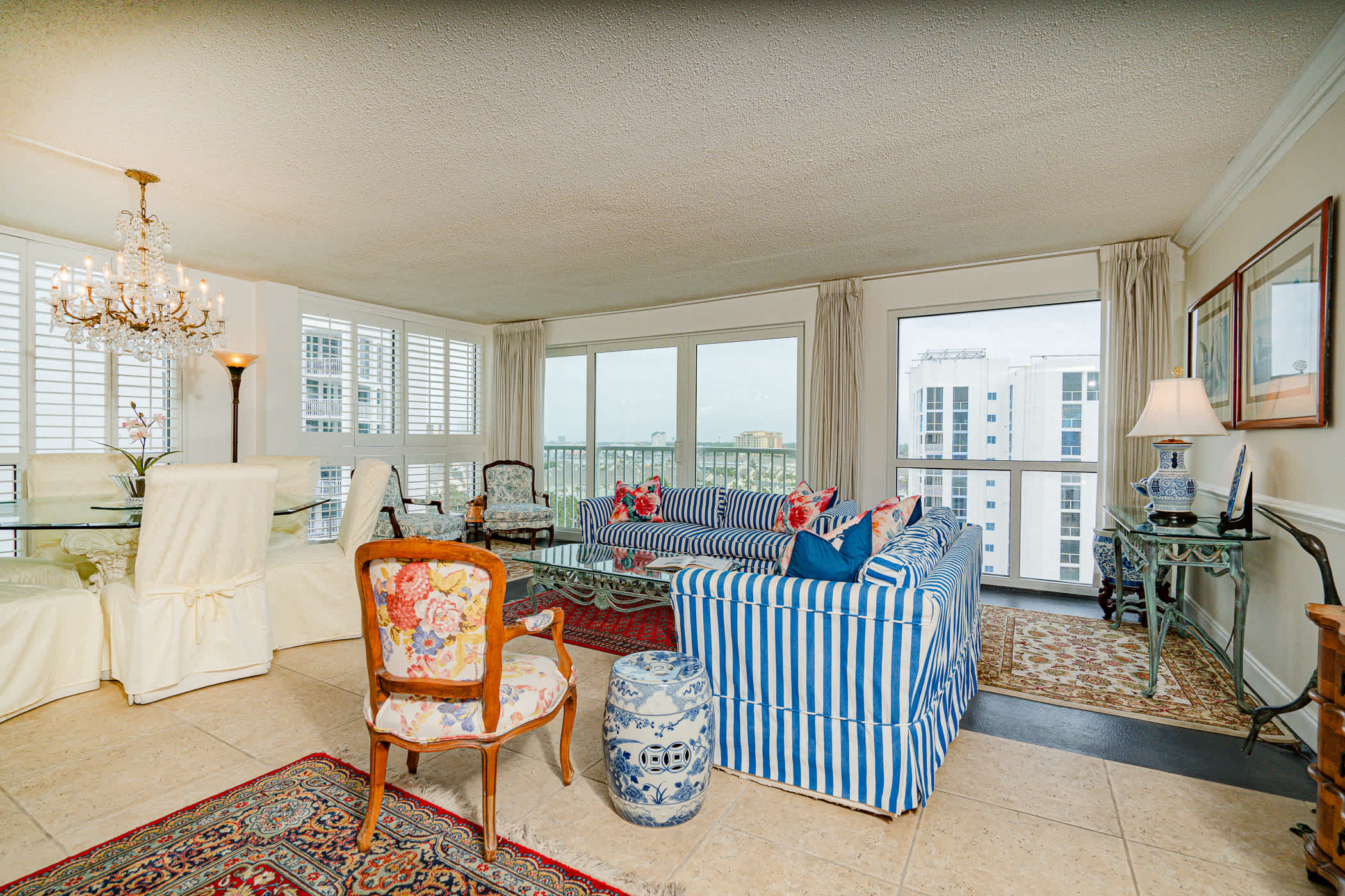 Relax in a bright, beach‑inspired living room featuring stunning Gulf views. Enjoy comfortable striped and floral seating, a fully stocked bookshelf, and a Smart Television.