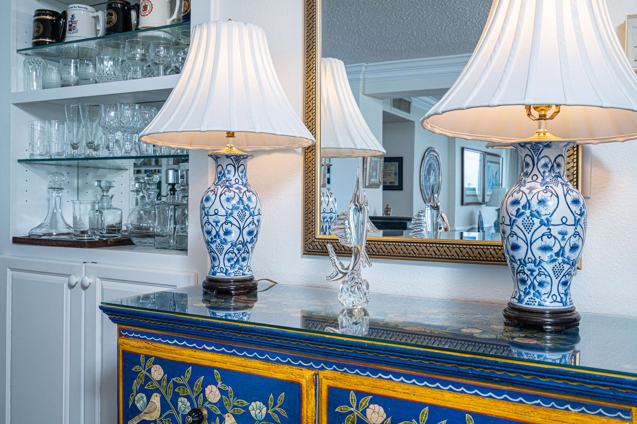 Enjoy a stylish built‑in bar with mirrored shelving, glassware, and elegant décor. Guests are welcome to use the bar and all available glassware during their stay.