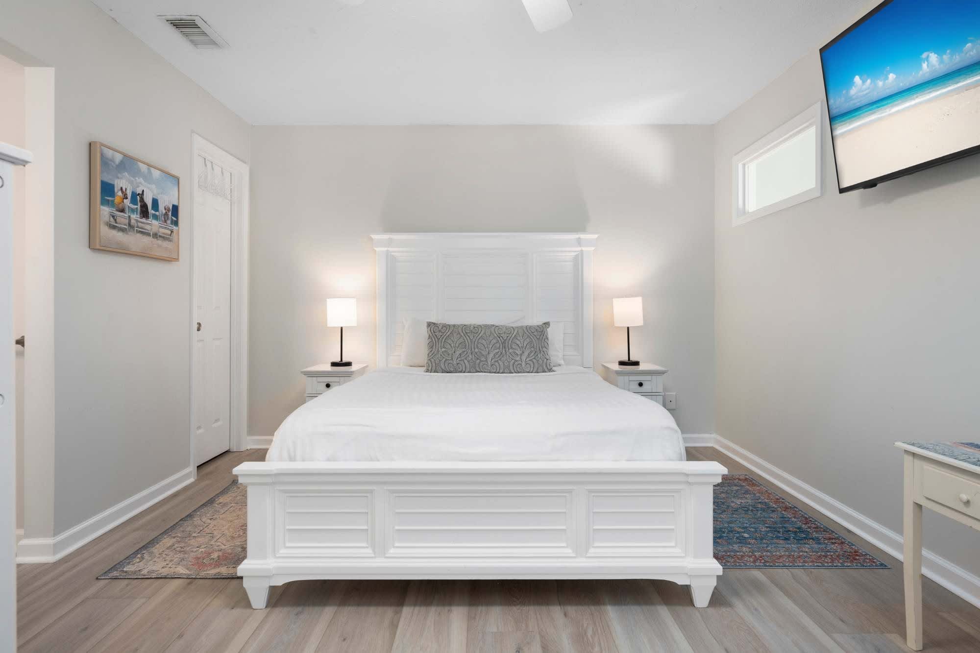 This inviting primary suite features a king‑size bed, ceiling fan and a Smart TV with cable, creating a relaxed space to unwind. The bedroom includes a shared ensuite bathroom (also accessible from the common area) with a single vanity and a shower/tub combo. Thoughtful touches like a dresser for storing clothes and a closet with luggage racks make the space both functional and comfortable.