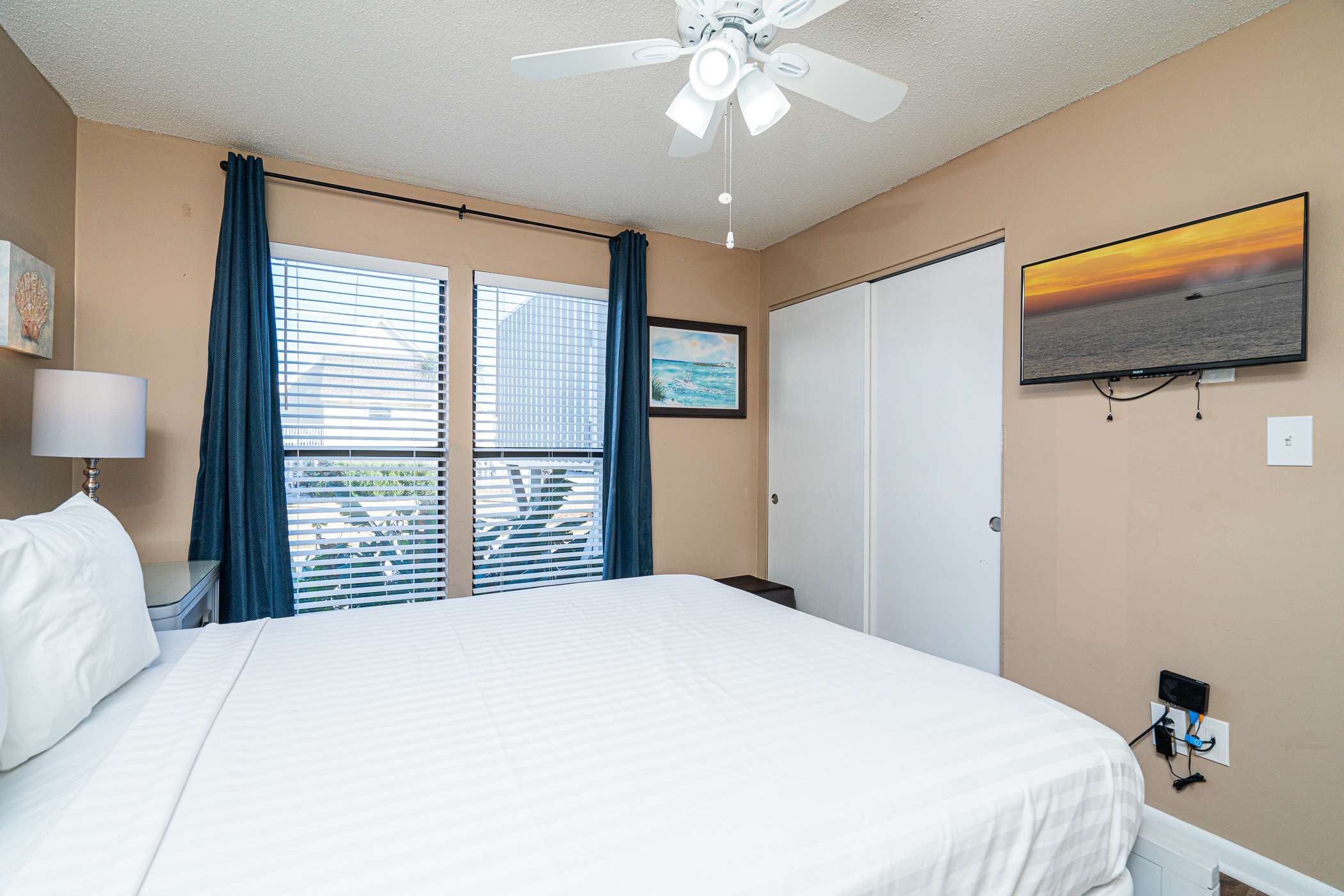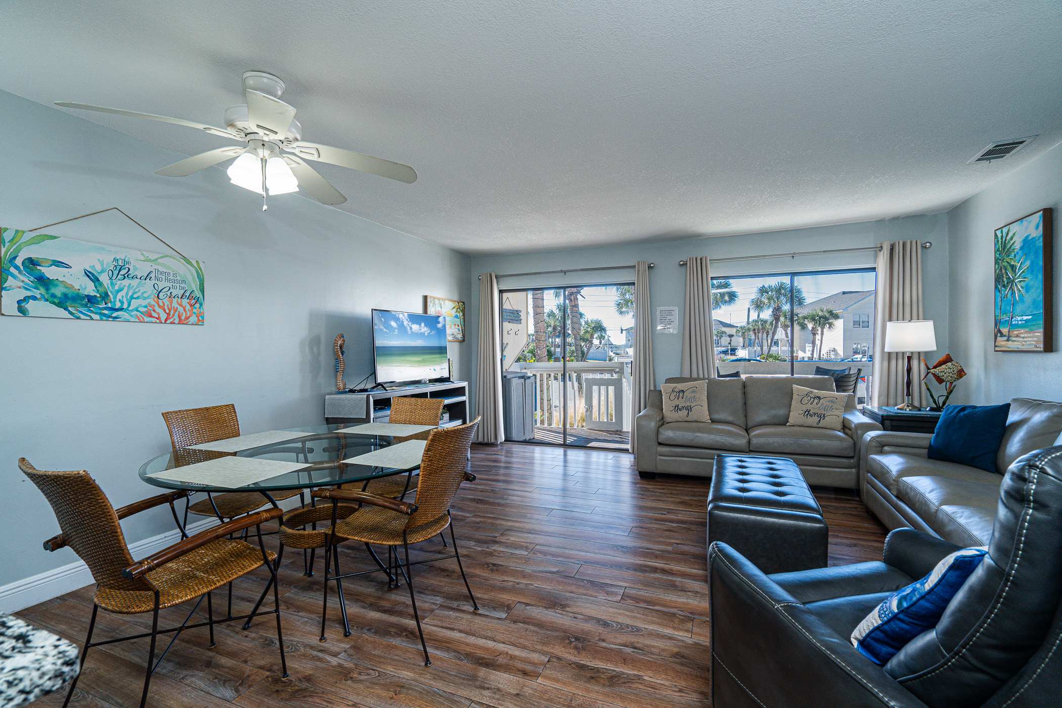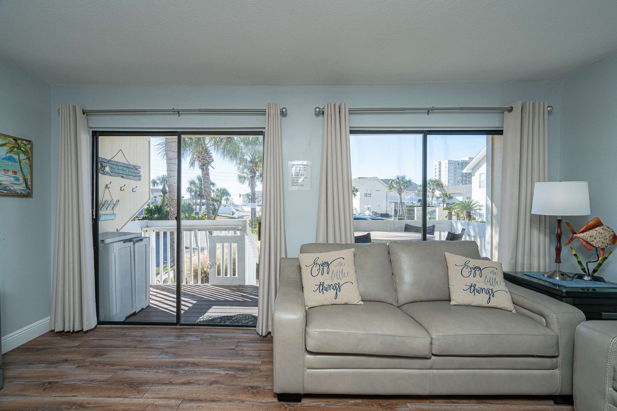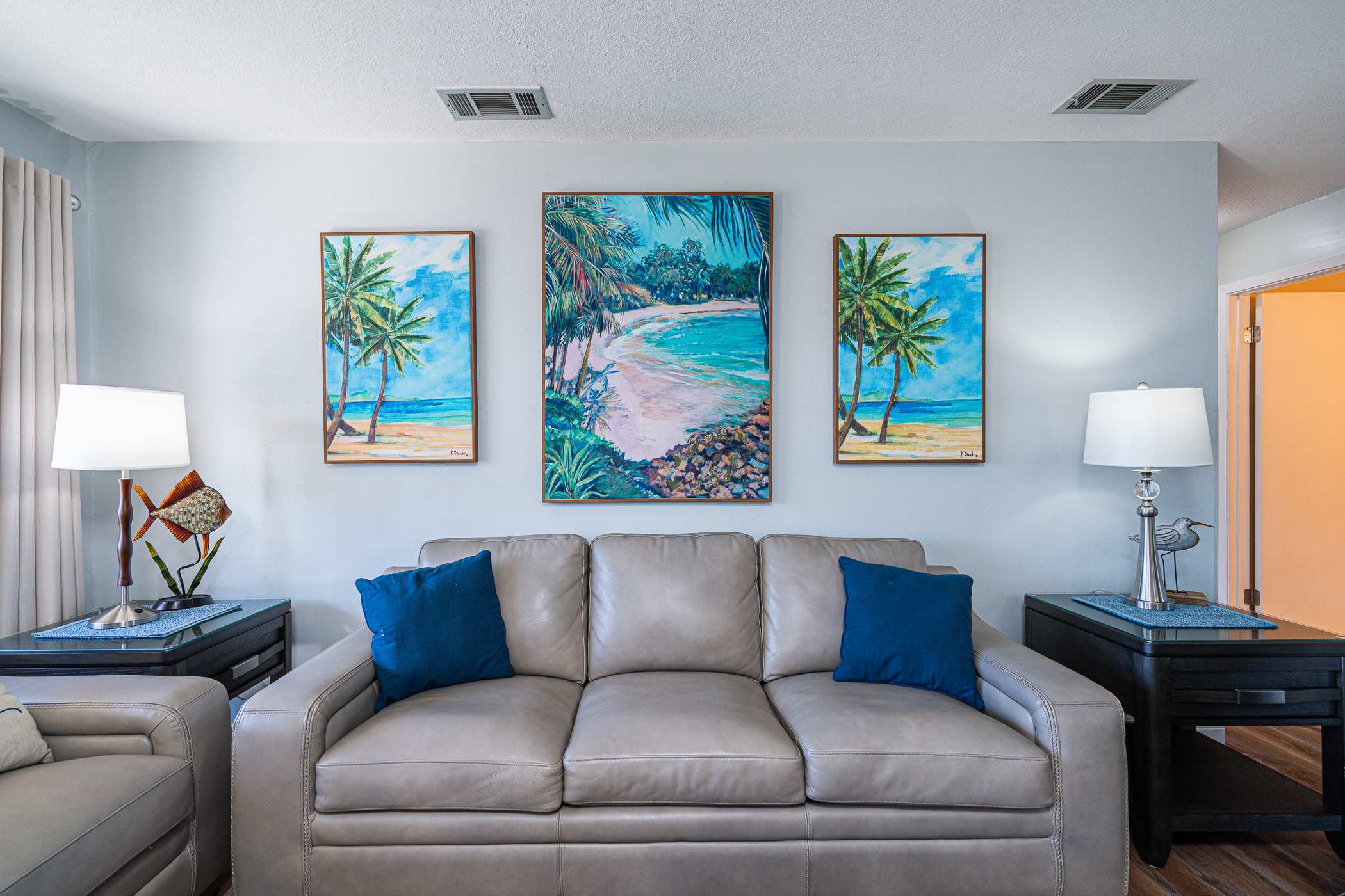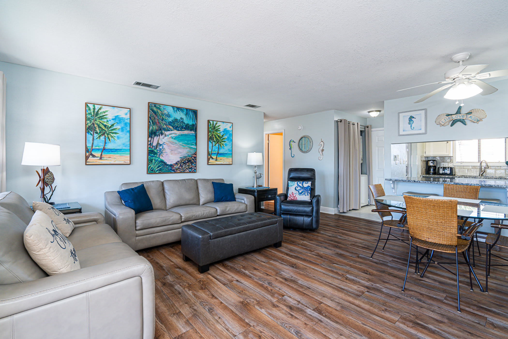 Coastal Décor & Relaxed leather Furnishings, embrace a laid-back vibe as soon as you walk in. Sink into the inviting leather sofa to catch up on your favorite shows or simply unwind after a day in the sun.