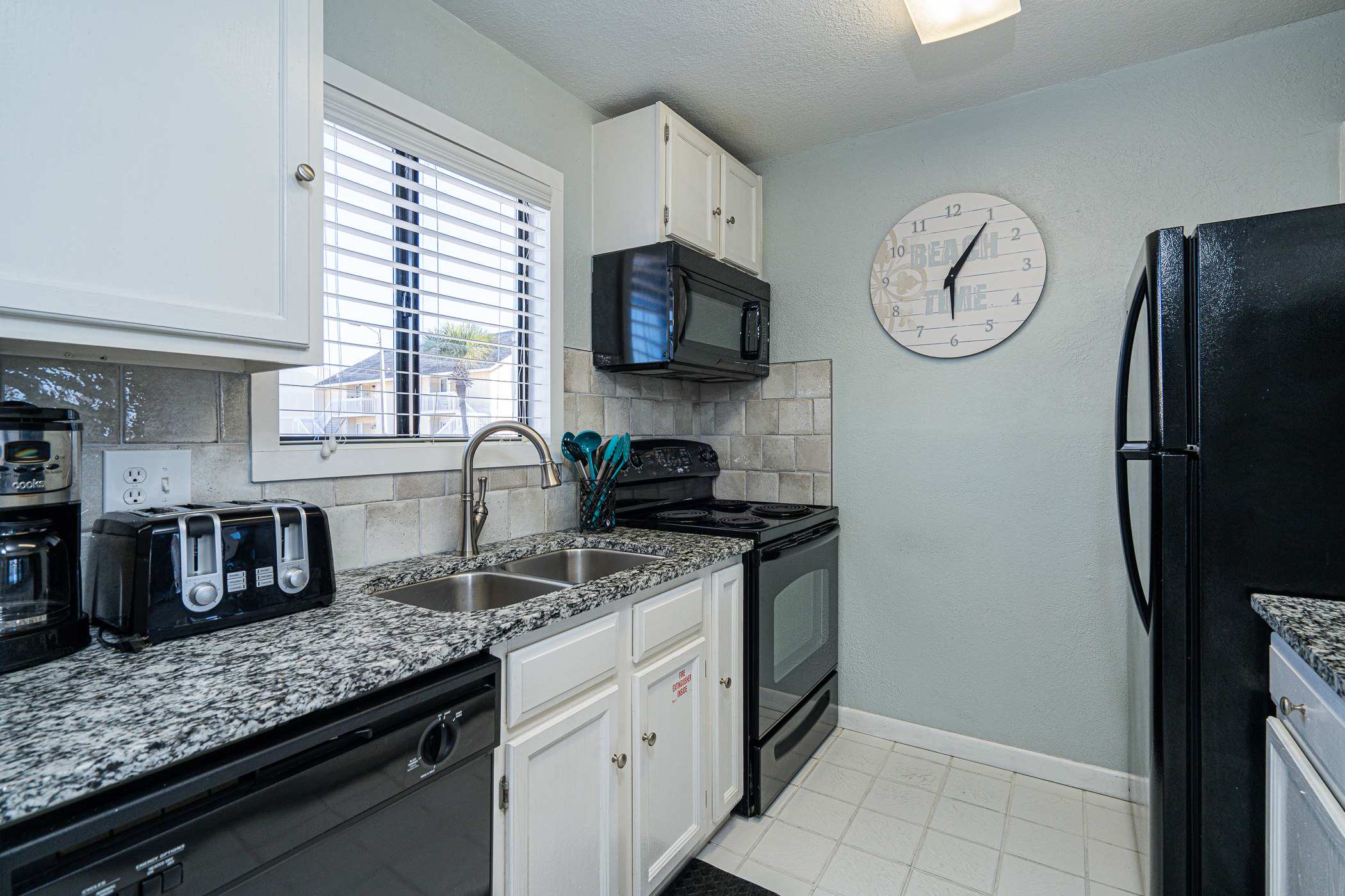 Fully Equipped, featuring all-black appliances, glossy countertops, and sleek cabinetry stocked with cookware and dining ware. A dining table that seats four and a breakfast counter that seats two, providing multiple seating options.