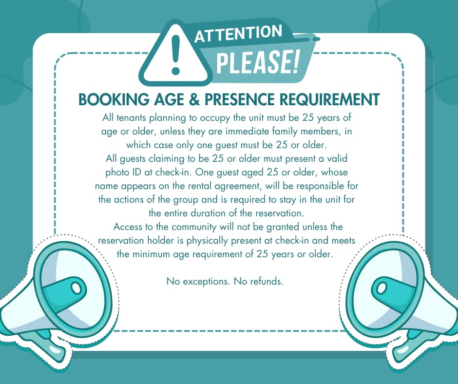 Guest Age & Presence Requirement: All tenants planning to occupy the unit must be 25 years of age or older, unless they are immediate family members, in which case only one guest must be 25 or older. All guests claiming to be 25 or older must present a valid photo ID at check-in. One guest aged 25 or older, whose name appears on the rental agreement, will be responsible for the actions of the group and is required to stay in the unit for the entire duration of the reservation. Access to the community will not be granted unless the reservation holder is physically present at check-in and meets the minimum age requirement of 25 years or older. No exceptions. No refunds.