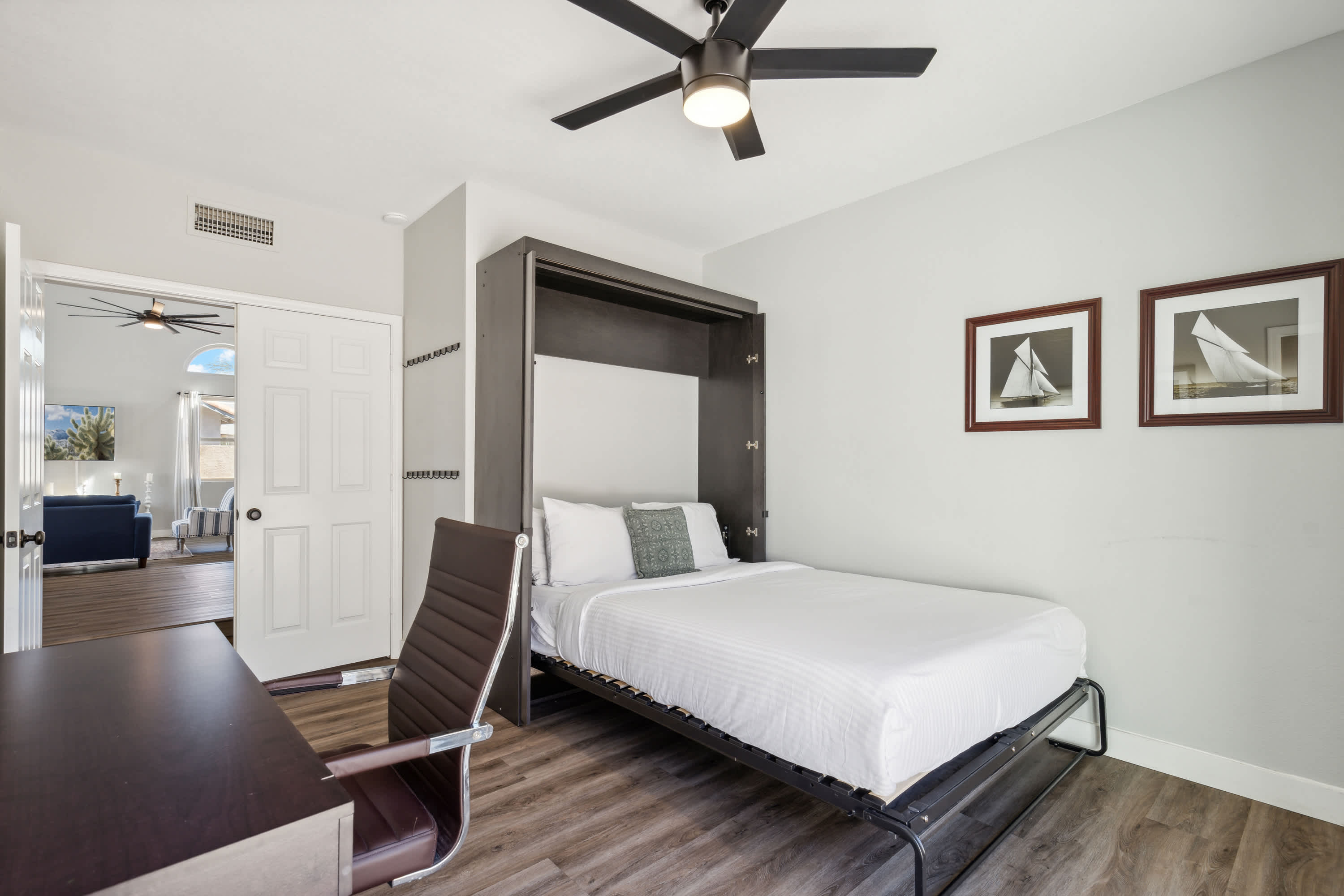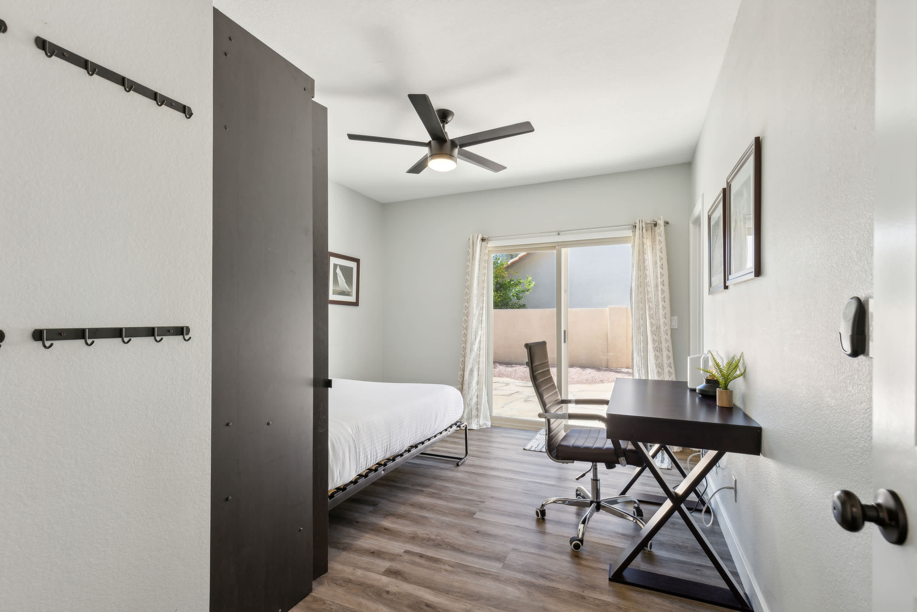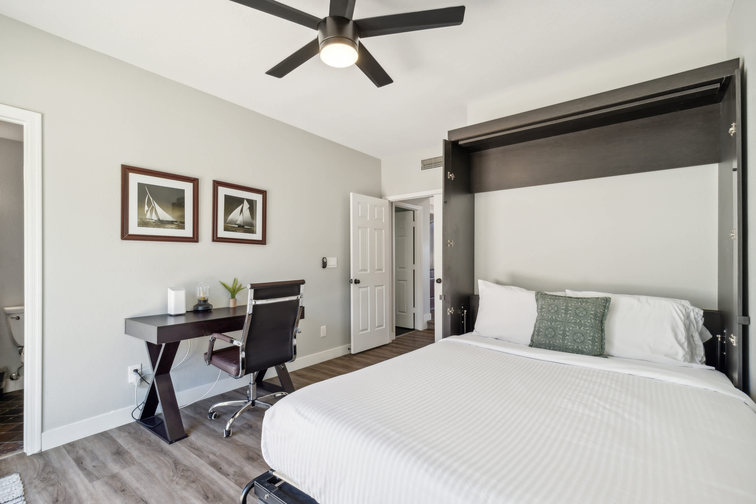 Bedroom #1 (downstairs) includes a queen-size Murphy bed, patio access, and workspace with desk, chair, and ensuite bathroom.