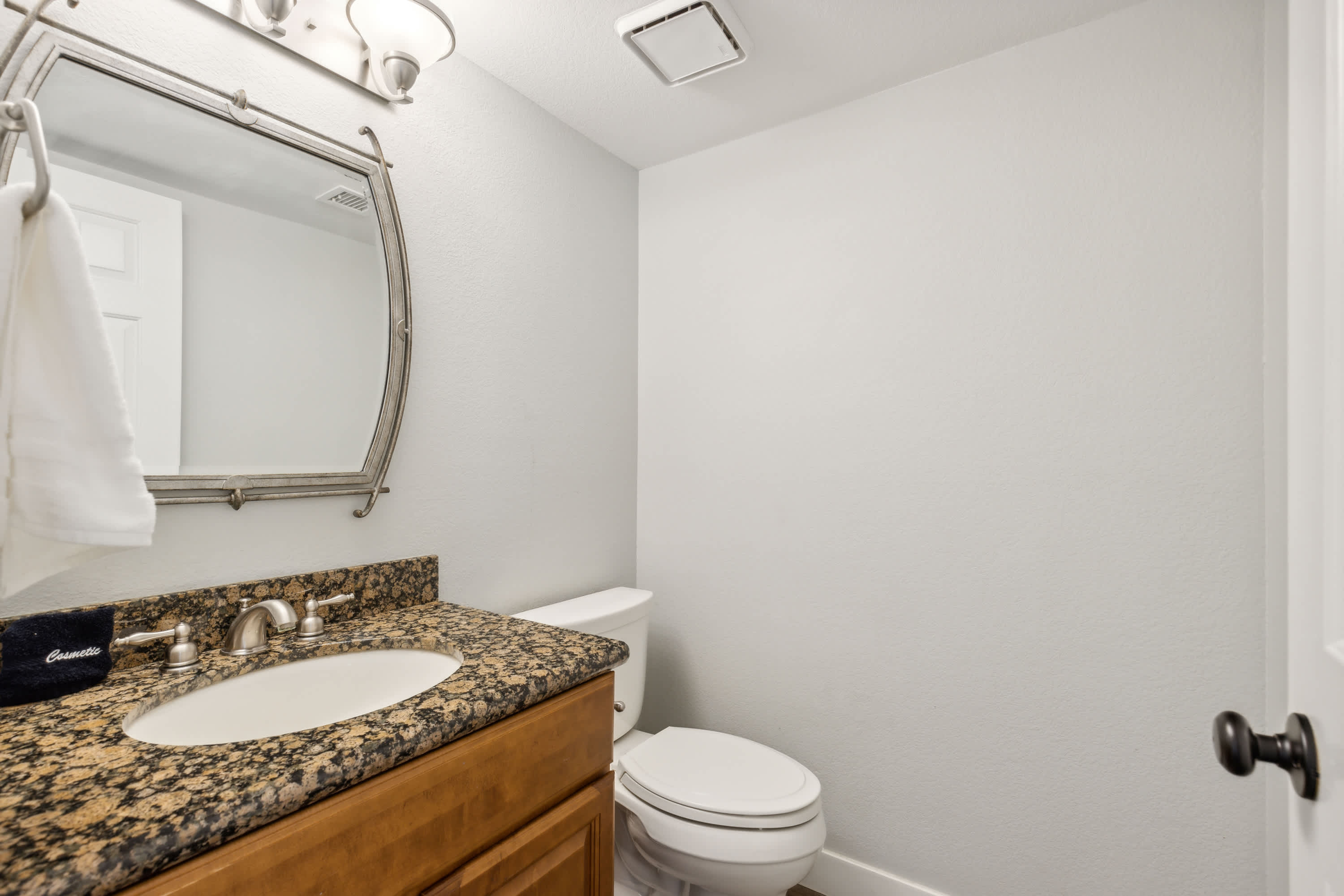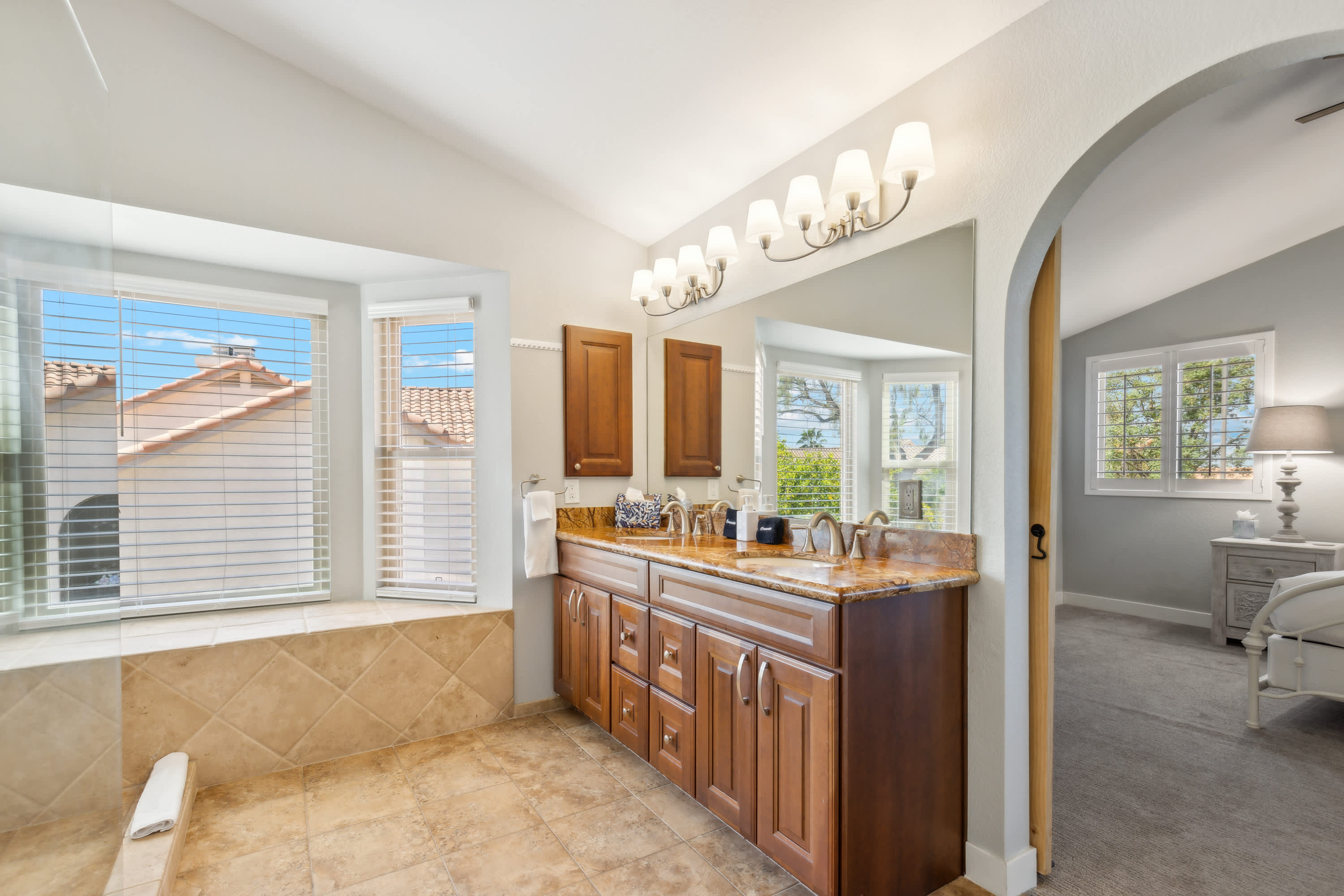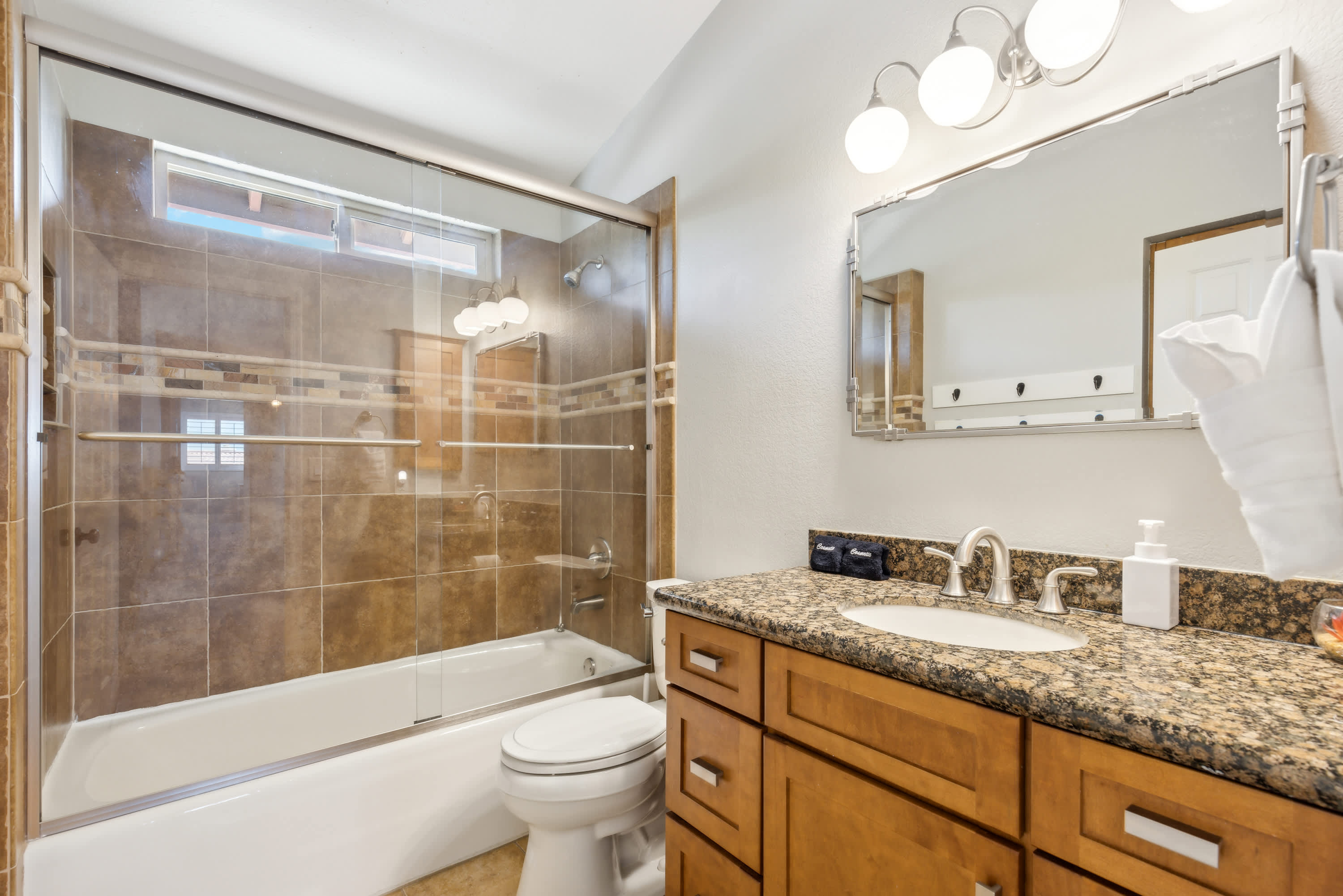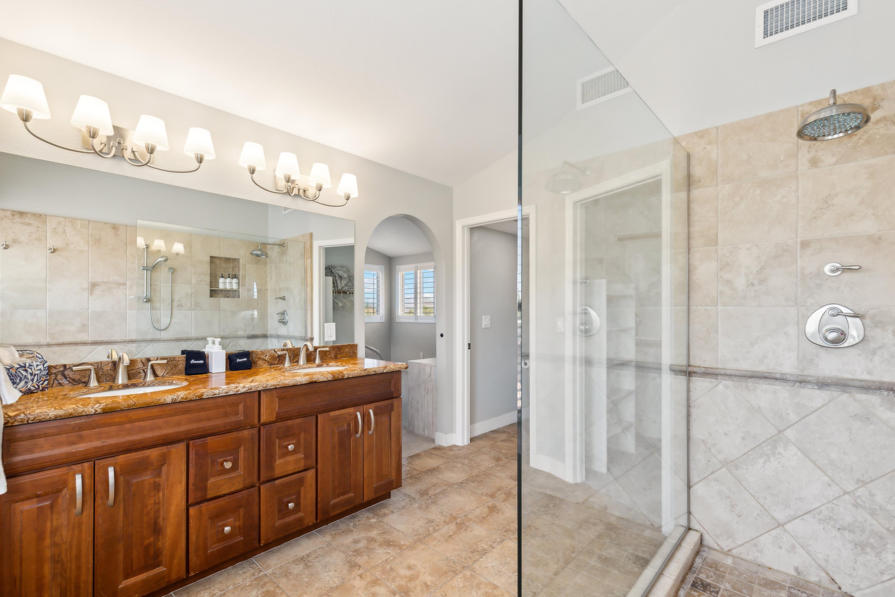 The home also includes a half bathroom as well as 2 additional full guest bathrooms, the first with a single vanity and glass walk-in shower and the second with a single vanity and glass shower/tub combo.