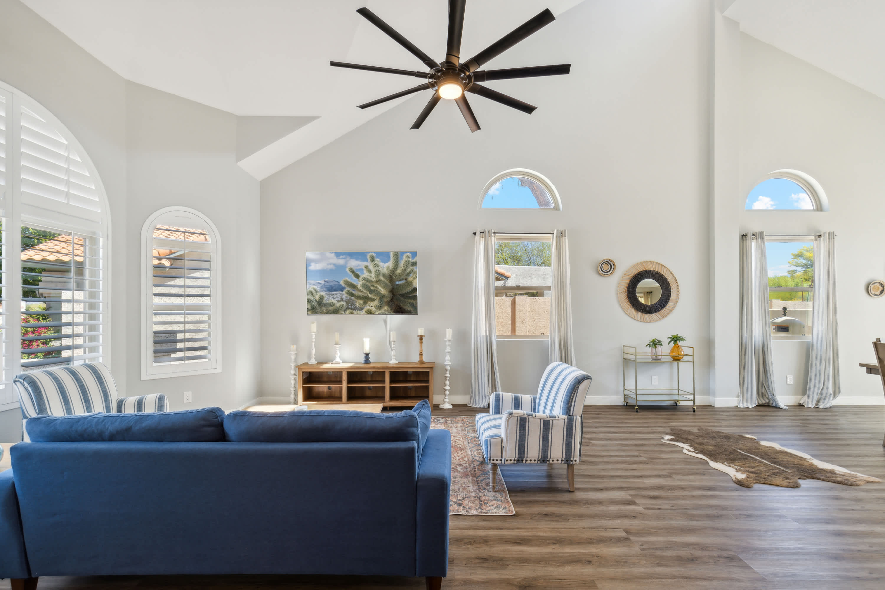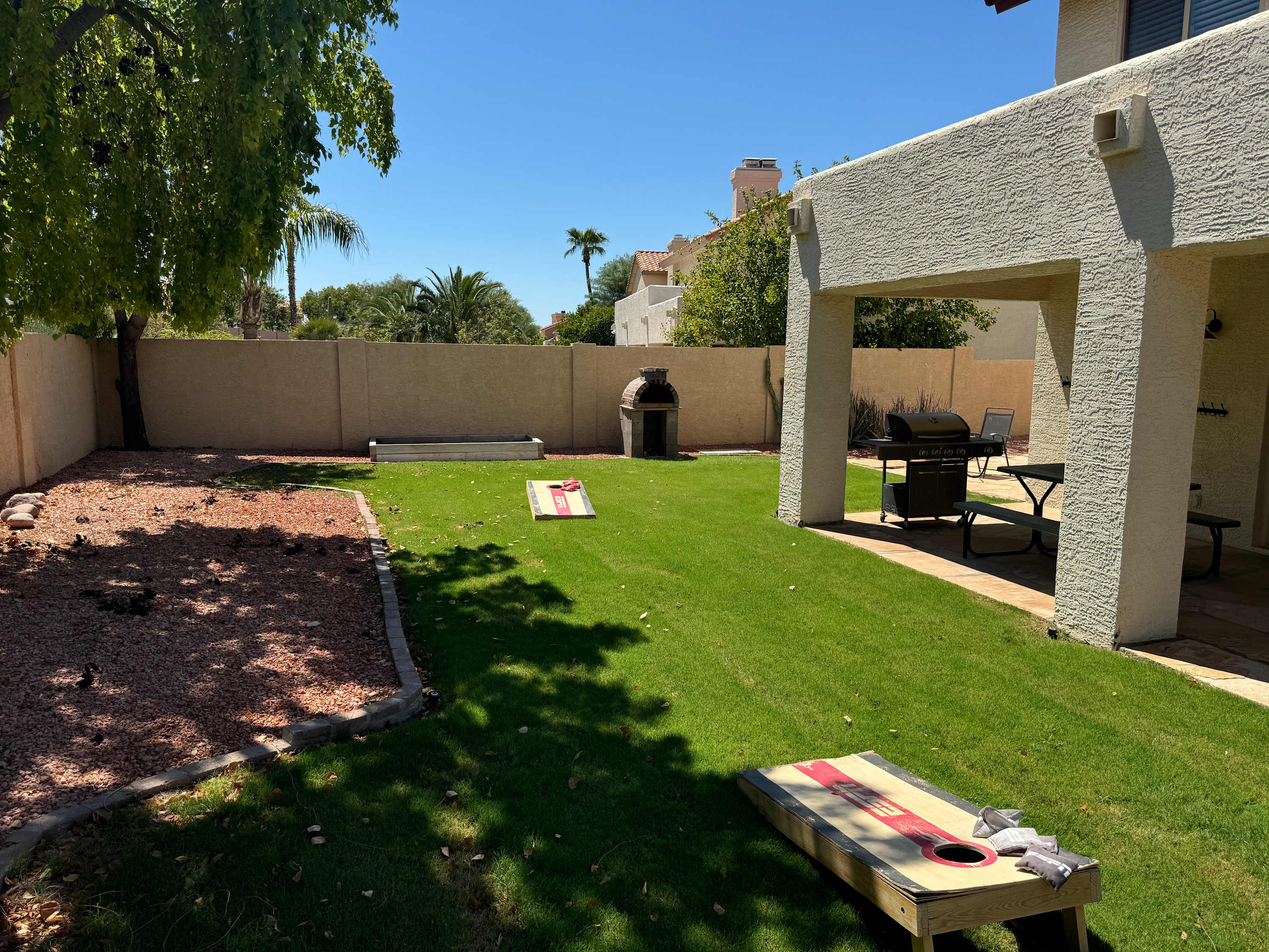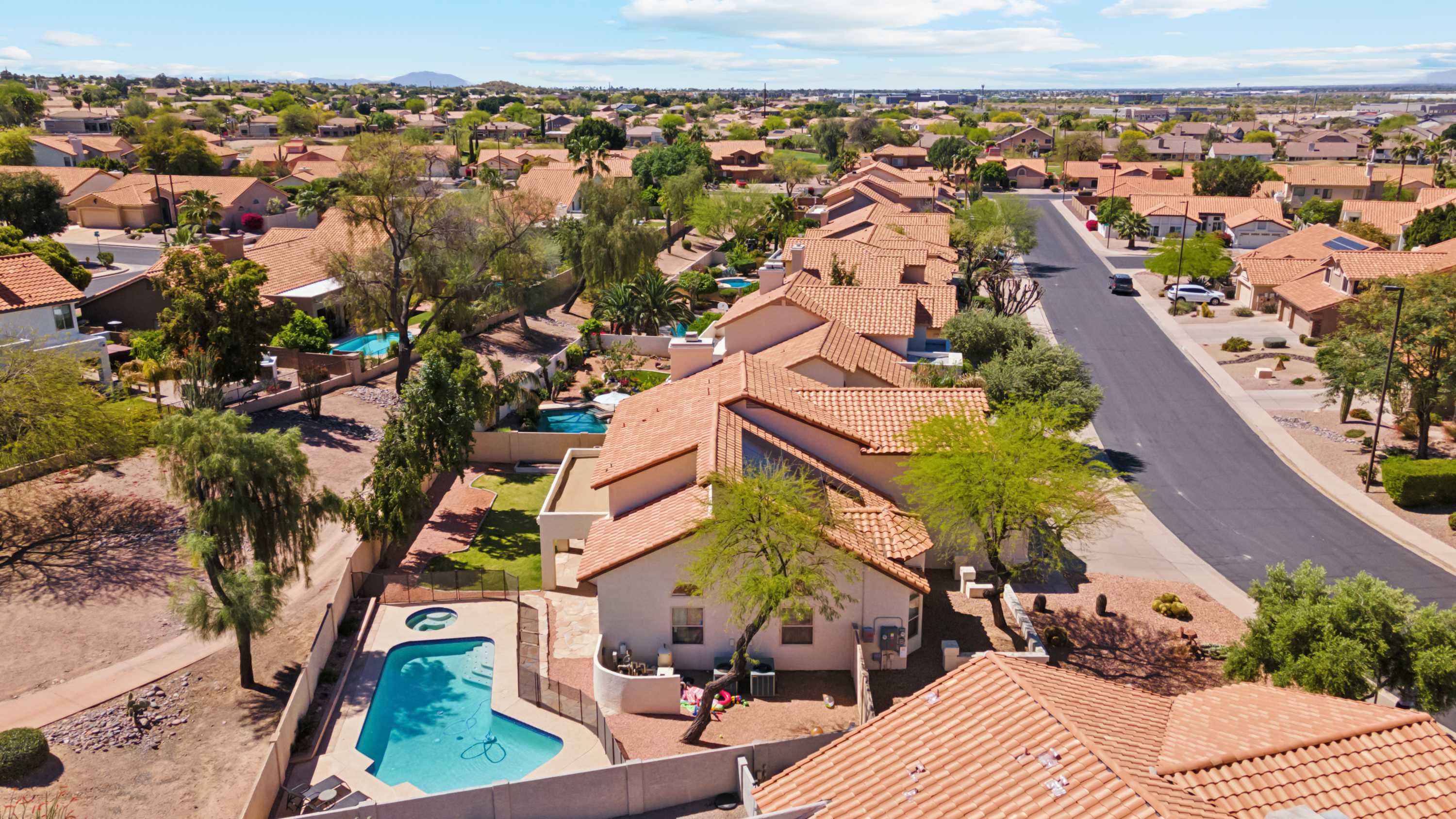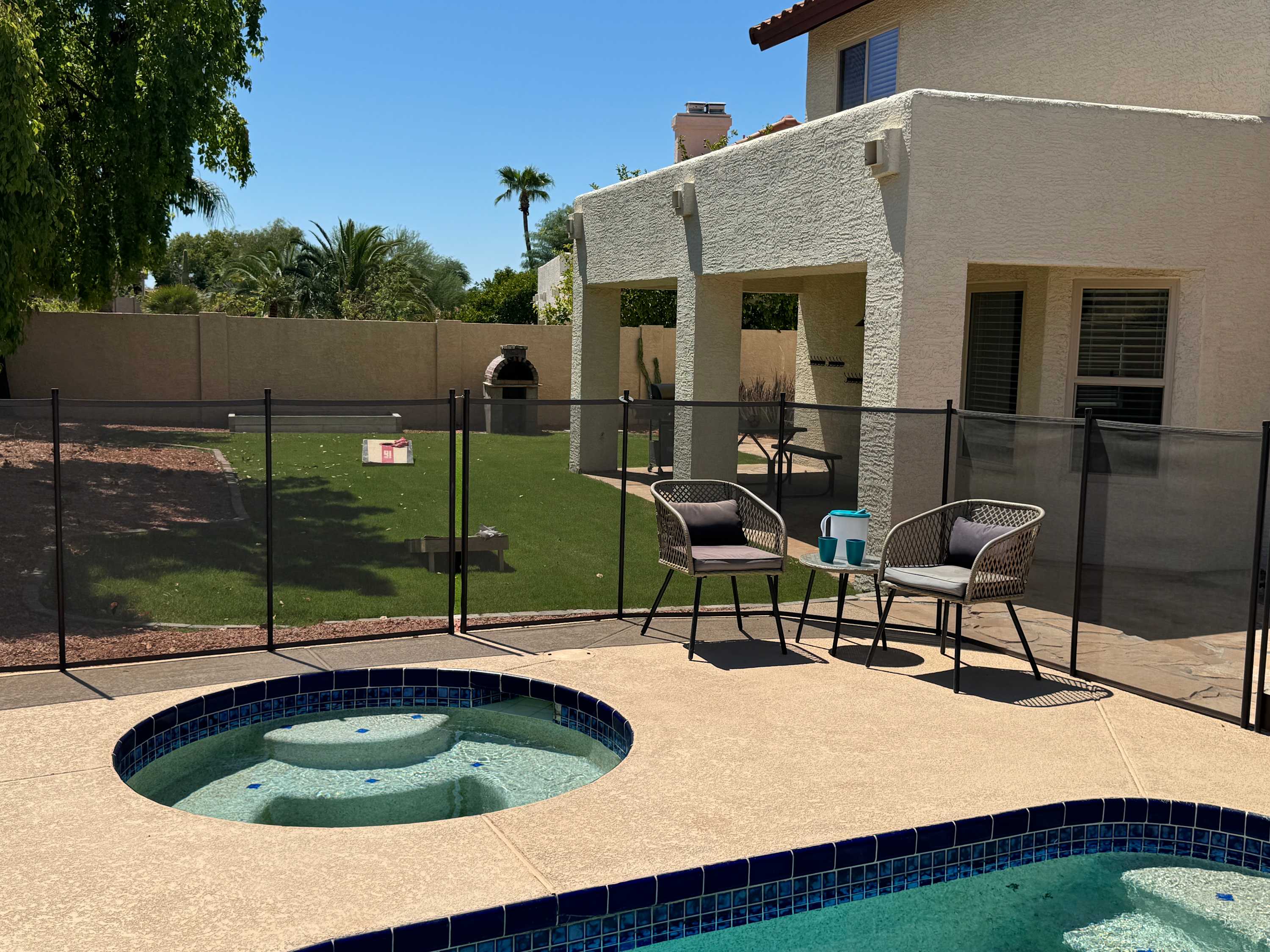 The home itself is a destination in its own right, beginning with the golf-course facing spacious backyard offering a sparkling inground pool, shaded patio, and grassy lawn where your furry friends can stretch their paws. Spend your days basking in the plentiful Arizona sun, taking breaks to cool off with a swim or splash in the pool and allowing the warm air to dry you back off. Dine al fresco on an authentic barbeque lunch fresh from the grill at the picnic table as you take relief from heat.