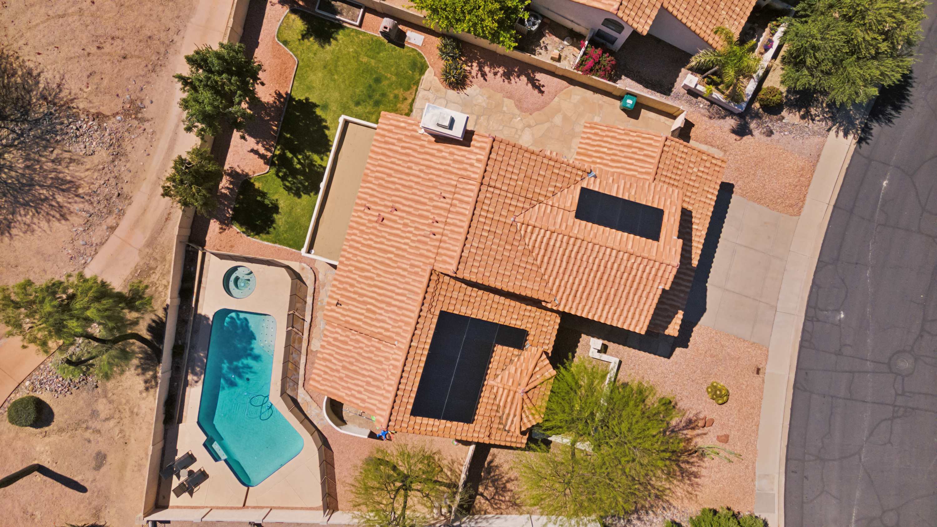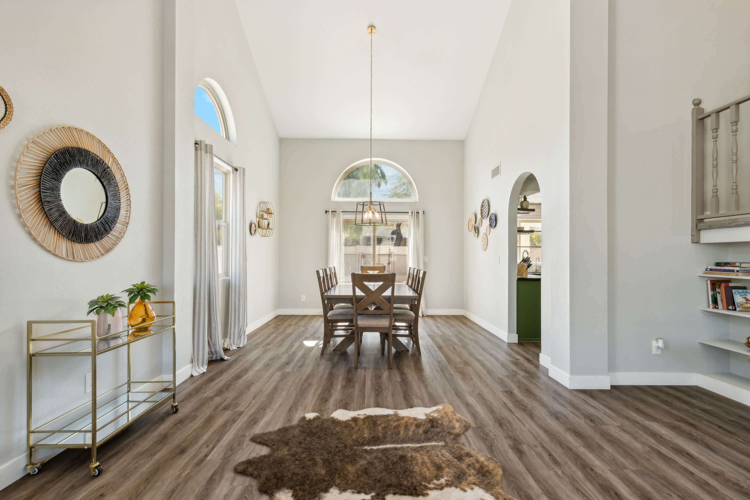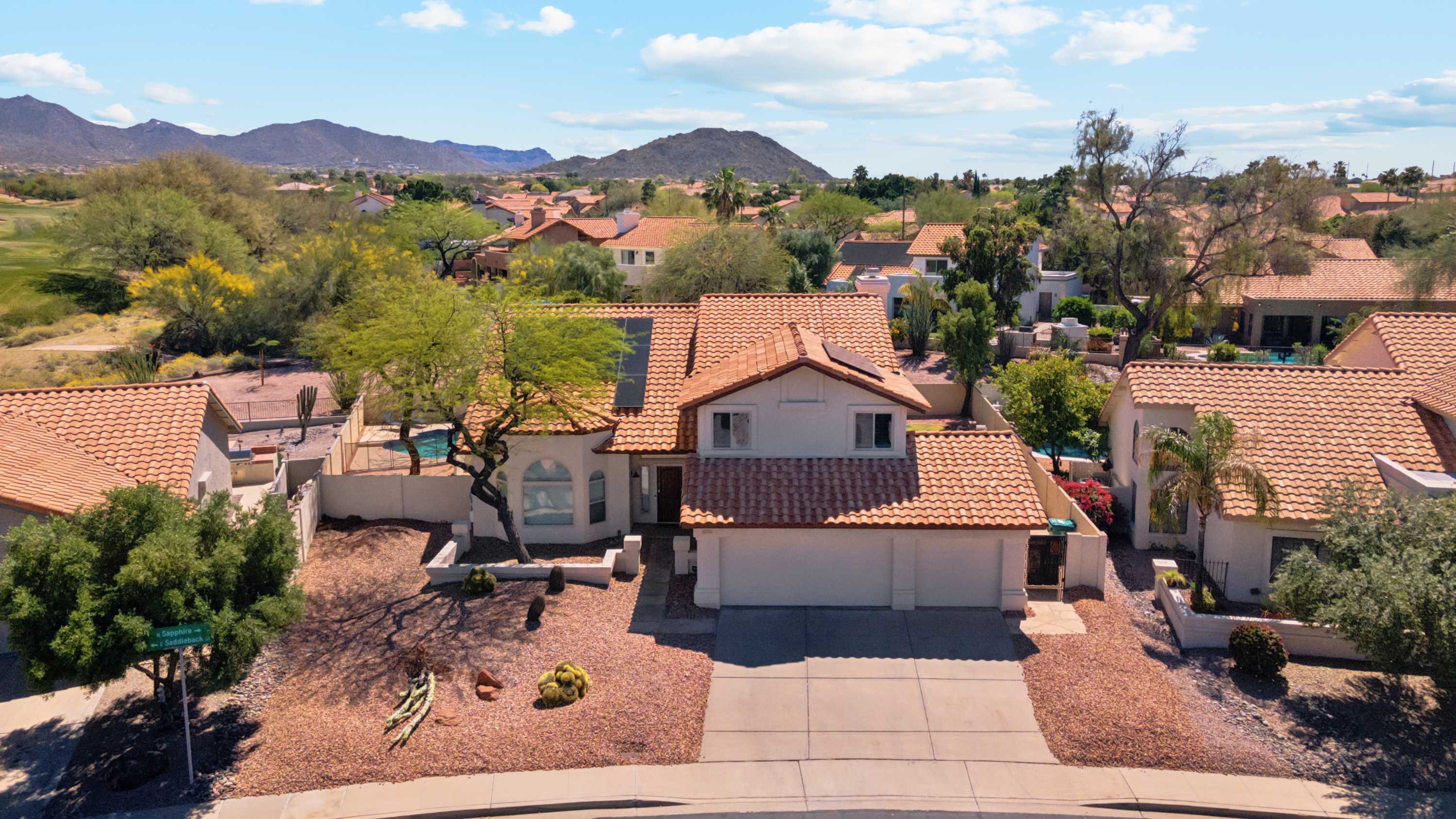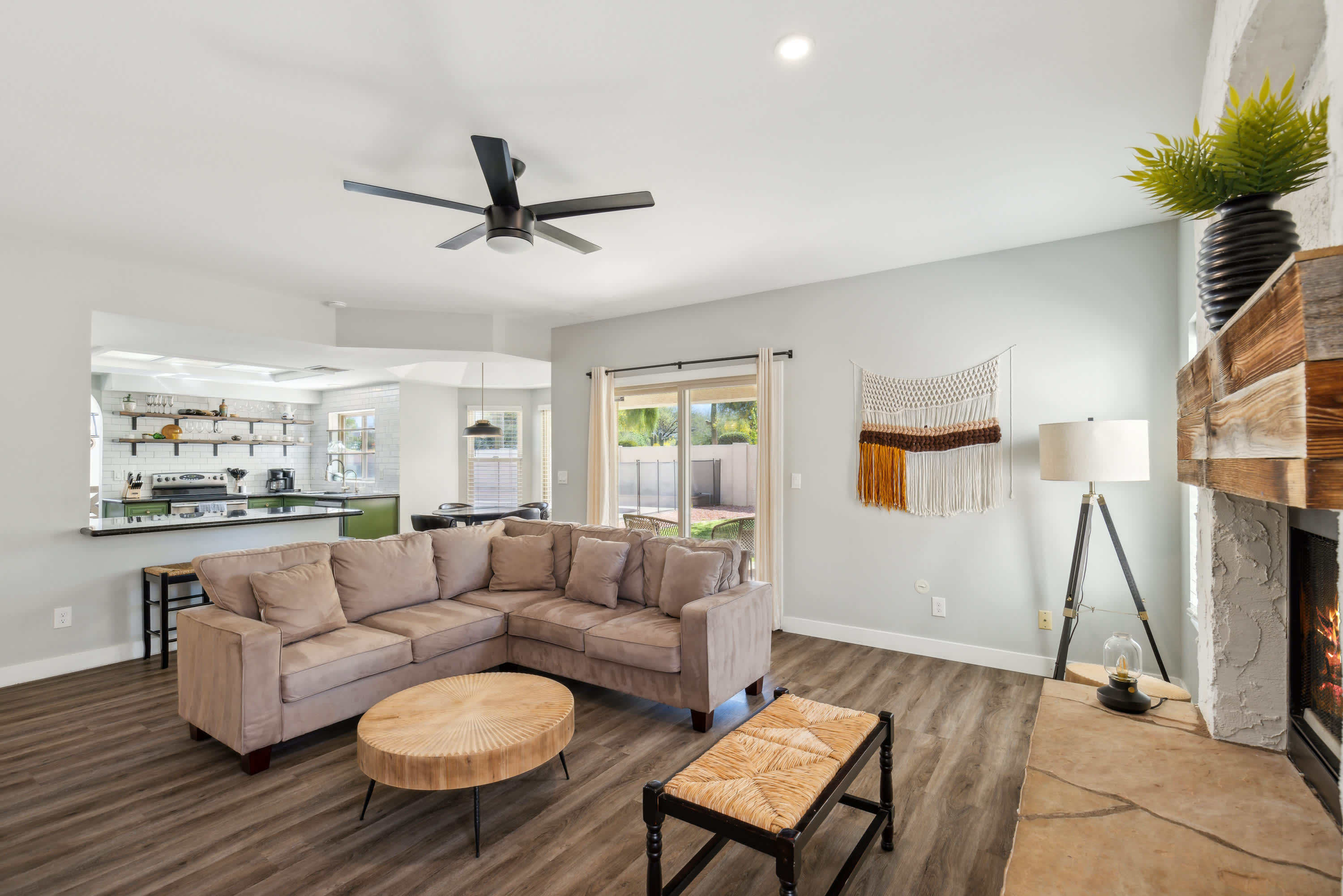 The home itself is a destination in its own right, beginning with the golf-course facing spacious backyard offering a sparkling inground pool, shaded patio, and grassy lawn where your furry friends can stretch their paws. Spend your days basking in the plentiful Arizona sun, taking breaks to cool off with a swim or splash in the pool and allowing the warm air to dry you back off. Dine al fresco on an authentic barbeque lunch fresh from the grill at the picnic table as you take relief from heat.