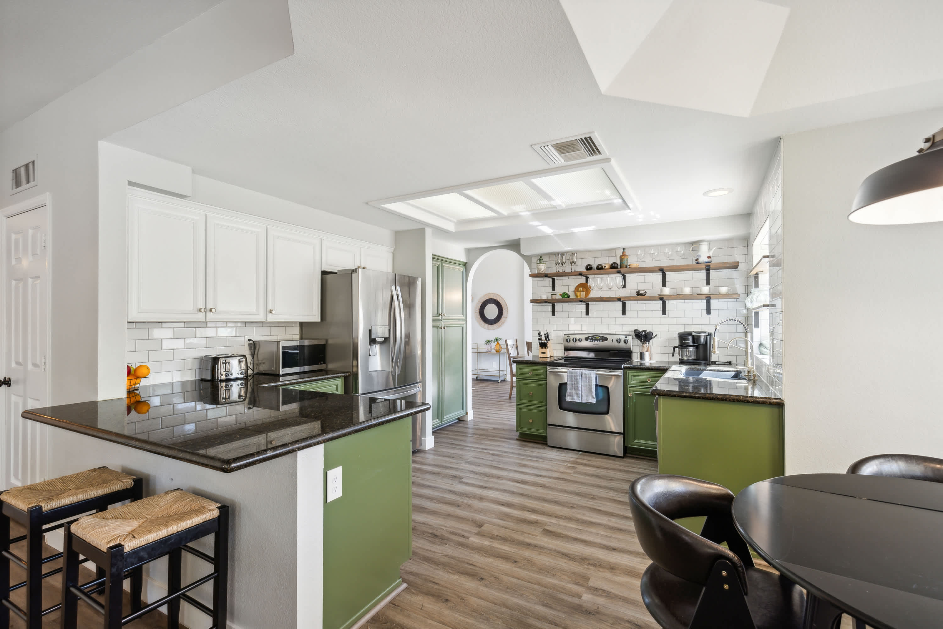 Heading indoors, soaring vaulted ceiling sit overtop modern spaces filled with an abundance of natural light, contemporary furnishings, and sophisticated décor. Relax in the living room on plush sofa and armchair seating while you binge episodes of your favorite shows on the smart TV. The open floorplan leads you into the dining room where a chic table seats 8 for formal meals or a spontaneous family game night. From here, find your way into the fully equipped kitchen, a chef’s delight showcasing stainless steel appliances, glossy black countertops, and olive-green cabinetry stocked with everything you need to create culinary creations ranging from sandwiches to family style meals and everything in between. A breakfast nook seats 4 for lighter meals or sipping your morning coffee as you plan out the day’s adventures. Beyond the kitchen, a second living area offers a comfortable L-shaped sofa and mounted smart TV so no one ever has to argue over what to watch. The fireplace will keep you warm and toasty during cooler nights, setting the perfect ambiance for a cozy movie night.