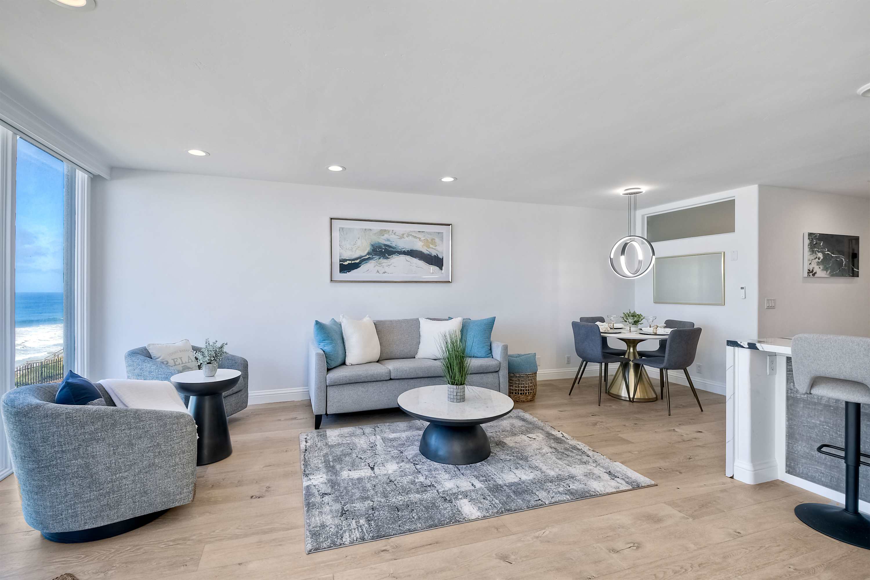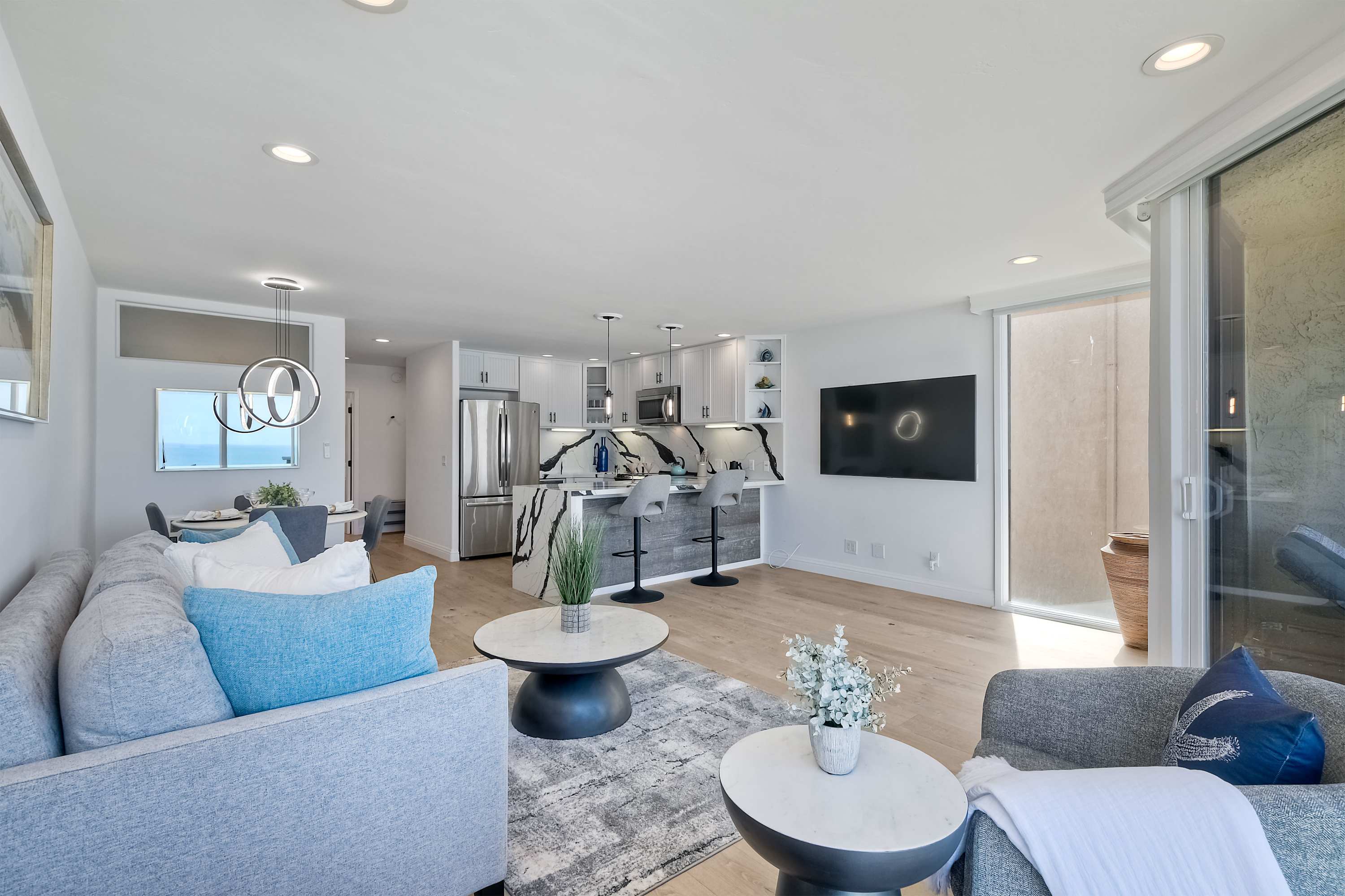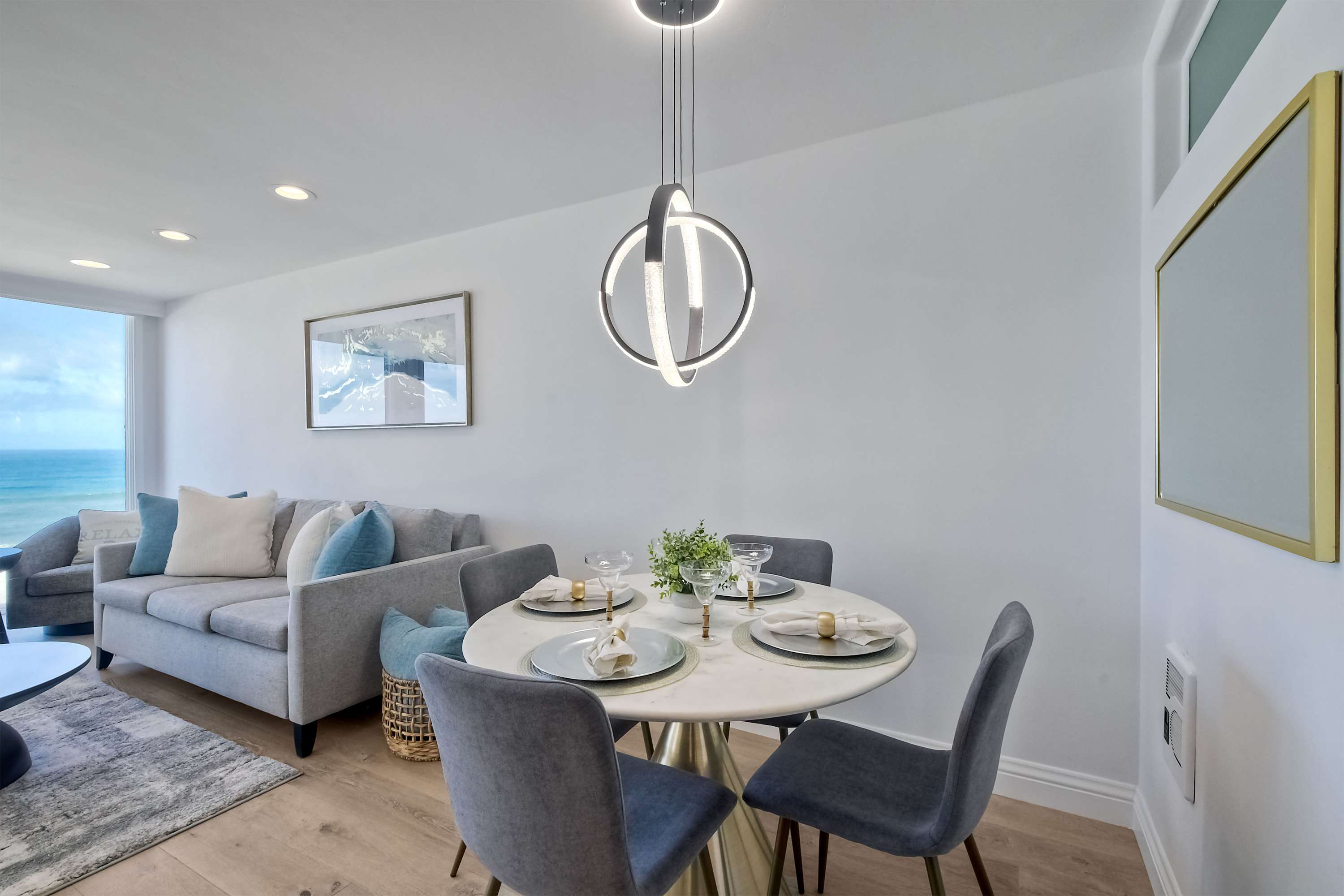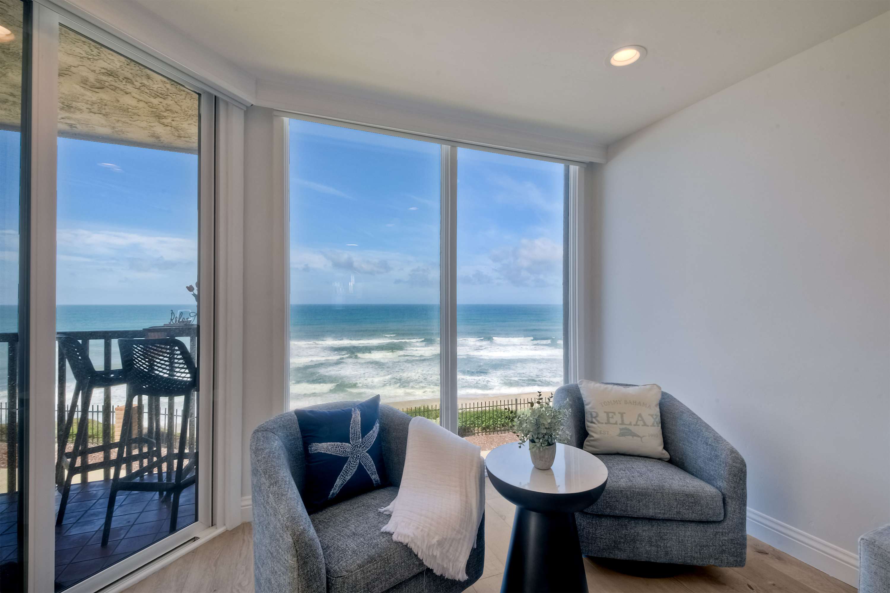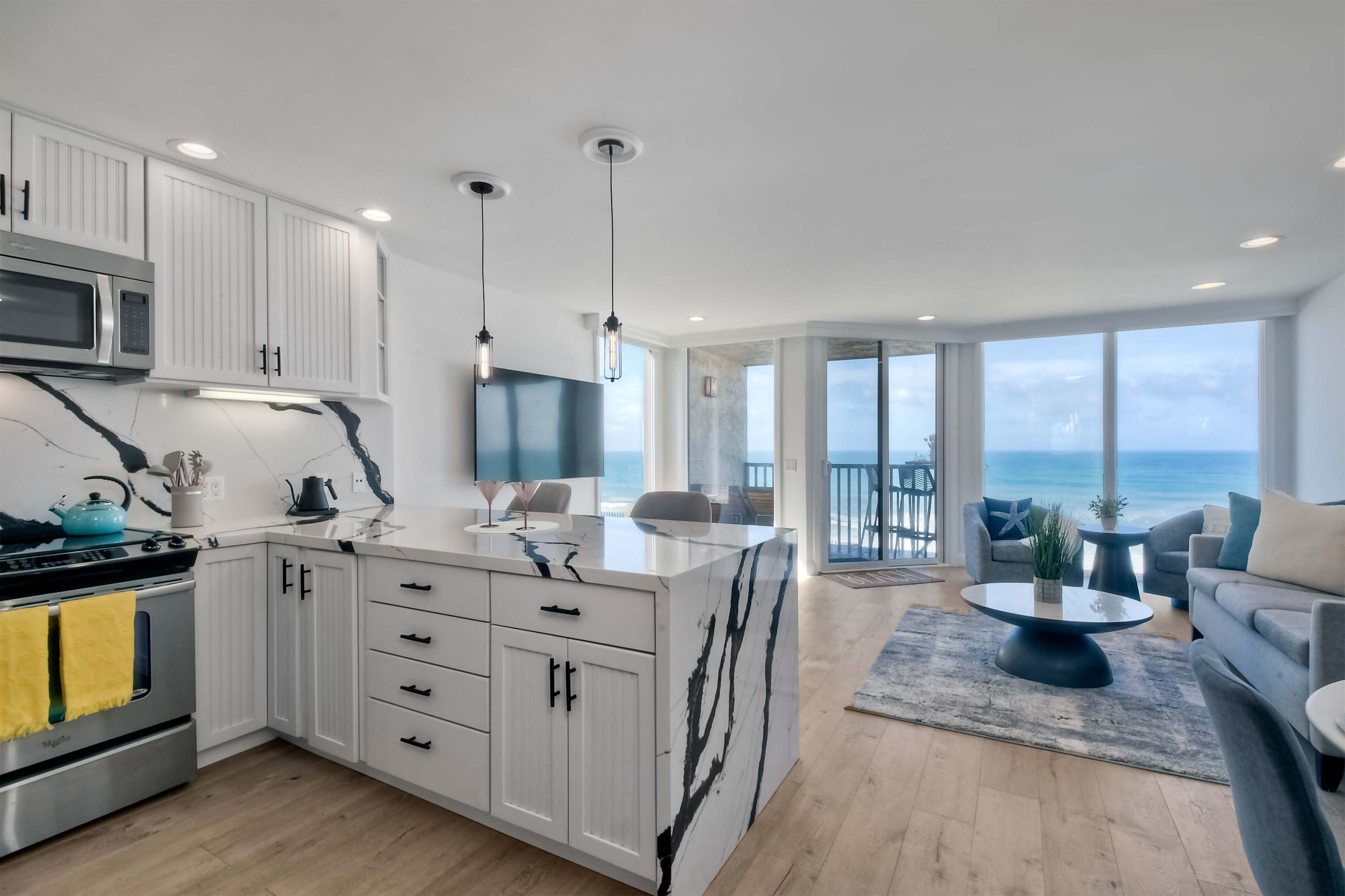 Indoors, the home’s modern interior offers an impressive relief from the heat, expertly curated with contemporary furnishings and sophisticated décor. The open floor plan keeps the ocean vistas front and center, the floor-to-ceiling windows illuminating the room in natural light. Curl up on plush living room sofa or armchair seating to stream episodes of your favorite shows on the large, mounted smart TV while you allow the gentle ocean breeze to flow freely throughout the home. Steps away, the designer kitchen showcases stainless steel appliances, stunning stone waterfall countertops, and sleek white cabinetry stocked with all the comforts of home. Gather together for formal dining at the table with seating for 4 or grab a high-top stool at the counter for a casual bite or a quick breakfast before jetting out the door. The Keurig coffee maker is sure to be your first stop in the morning, best taken back out on the balcony to enjoy a moment of serenity as you make your plans for the day.