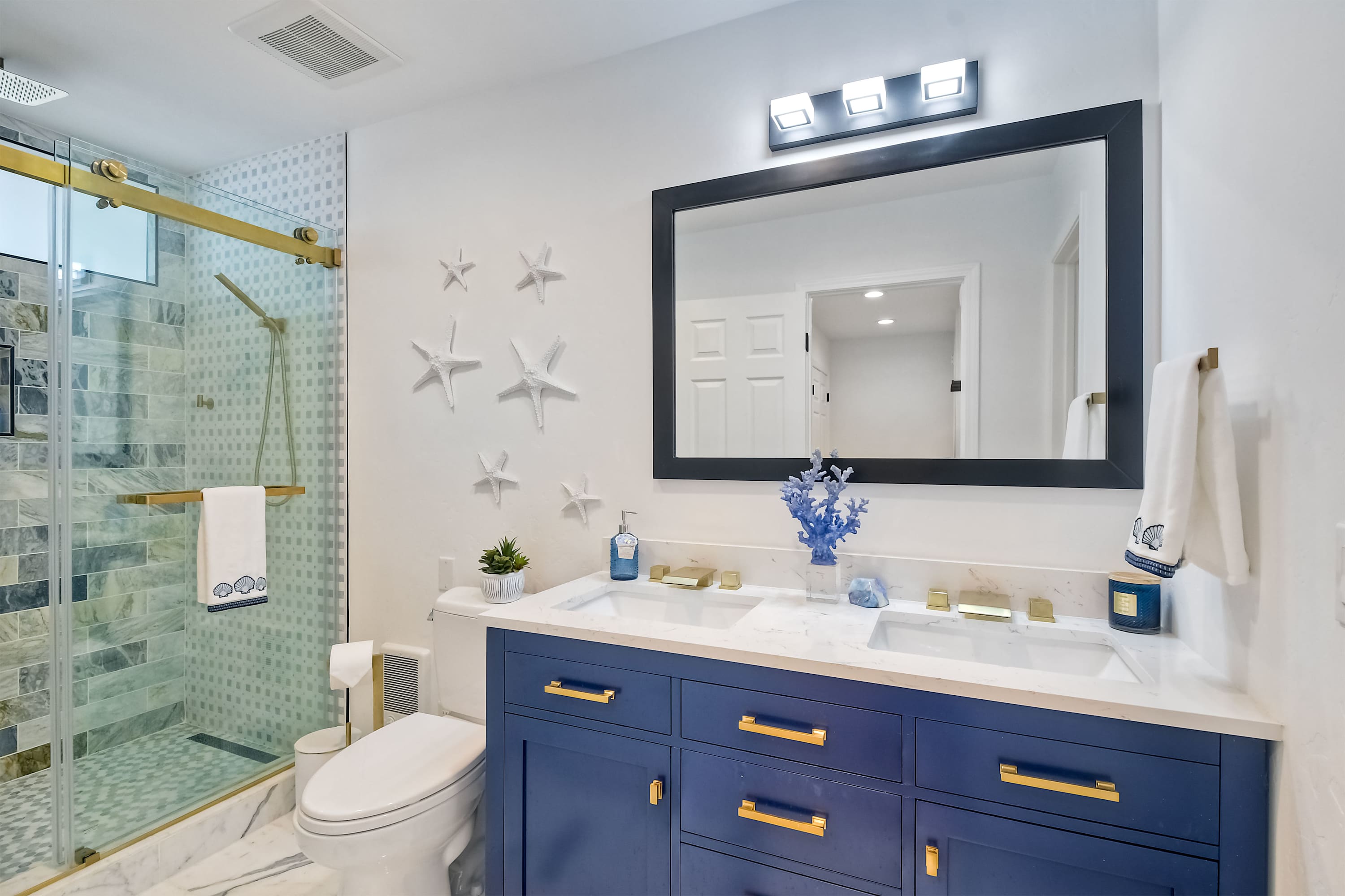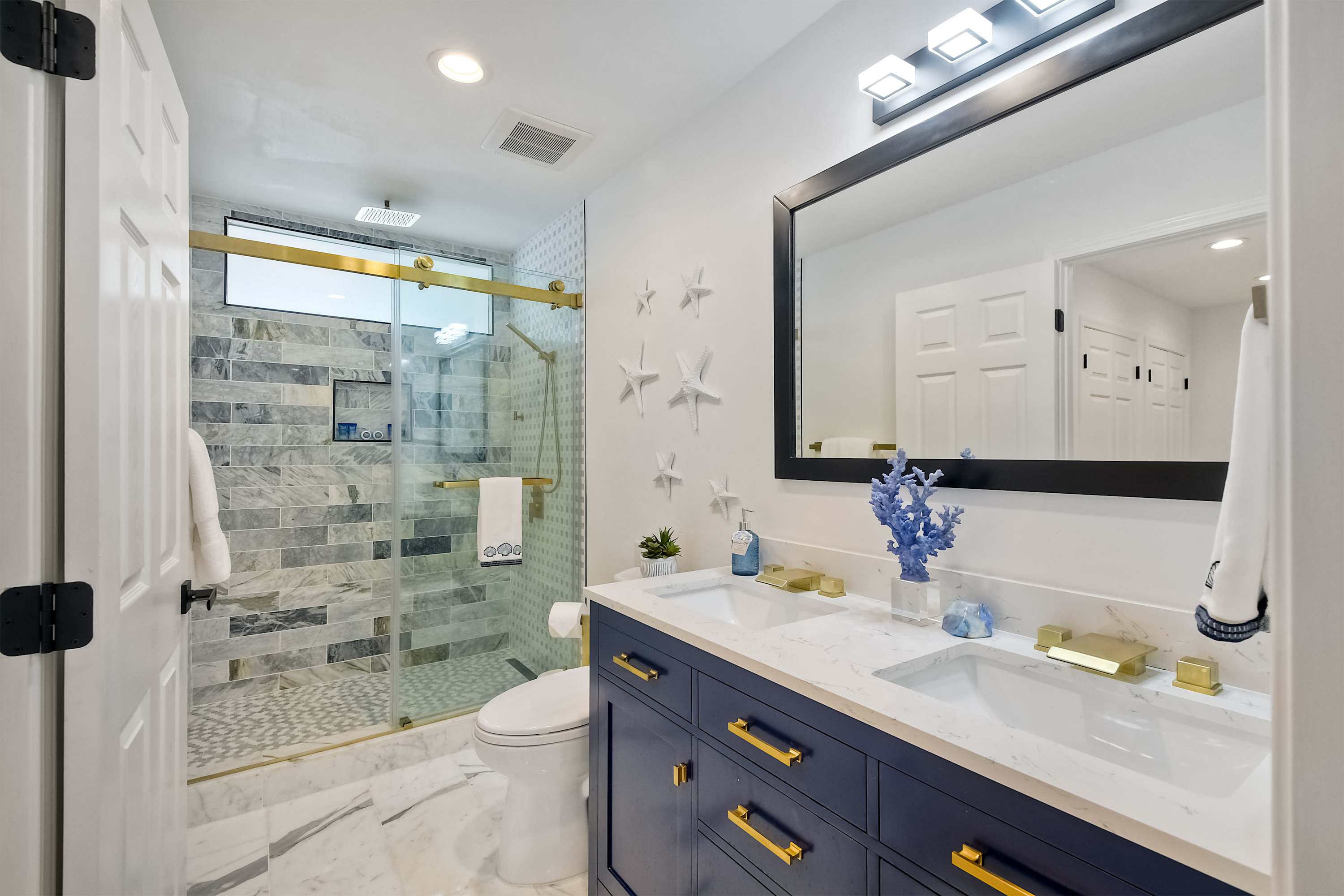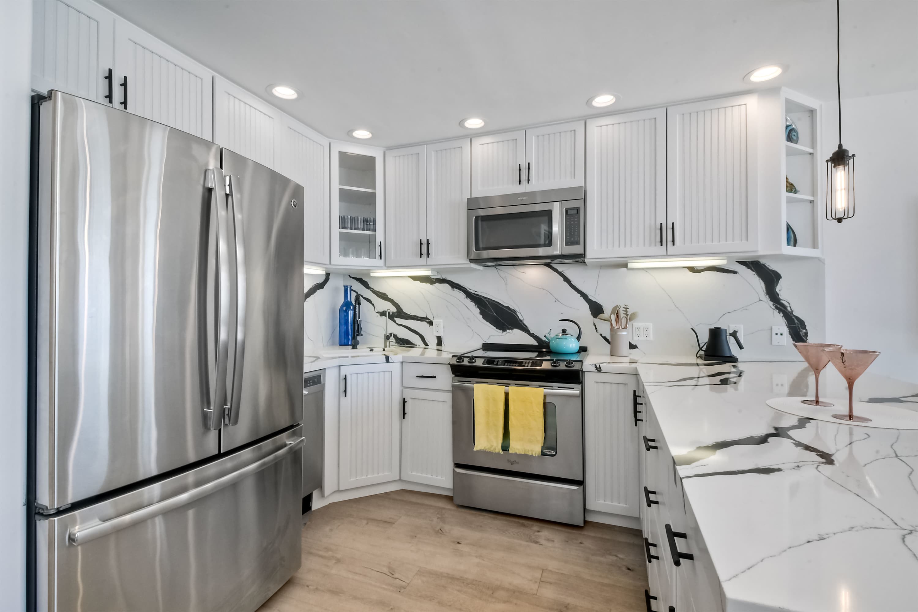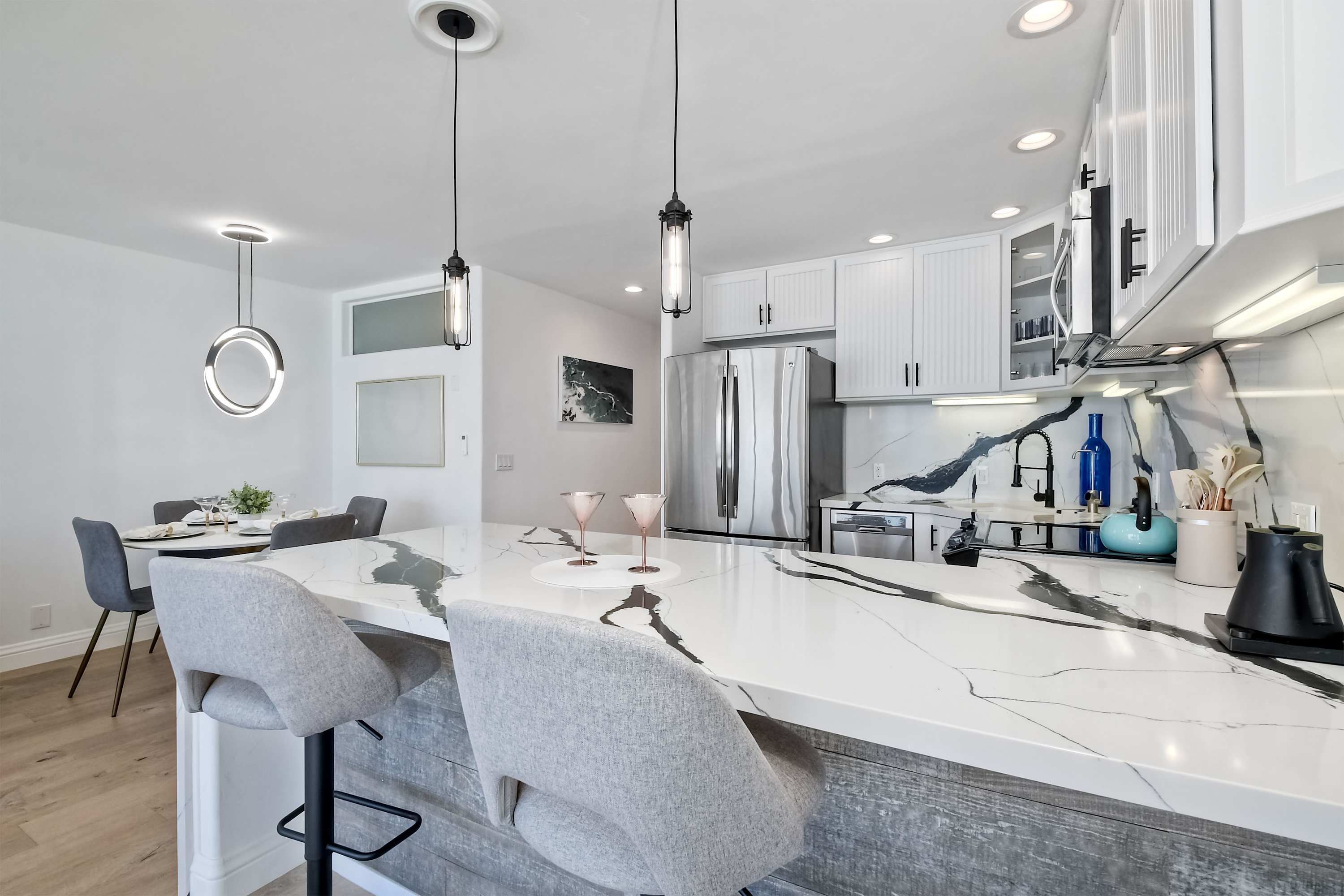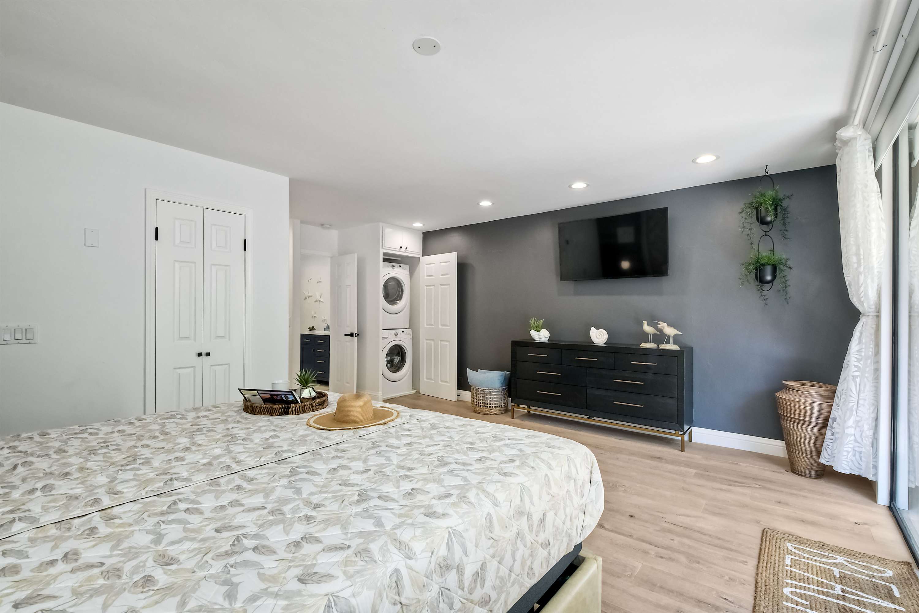 Indoors, the home’s modern interior offers an impressive relief from the heat, expertly curated with contemporary furnishings and sophisticated décor. The open floor plan keeps the ocean vistas front and center, the floor-to-ceiling windows illuminating the room in natural light. Curl up on plush living room sofa or armchair seating to stream episodes of your favorite shows on the large, mounted smart TV while you allow the gentle ocean breeze to flow freely throughout the home. Steps away, the designer kitchen showcases stainless steel appliances, stunning stone waterfall countertops, and sleek white cabinetry stocked with all the comforts of home. Gather together for formal dining at the table with seating for 4 or grab a high-top stool at the counter for a casual bite or a quick breakfast before jetting out the door. The Keurig coffee maker is sure to be your first stop in the morning, best taken back out on the balcony to enjoy a moment of serenity as you make your plans for the day.