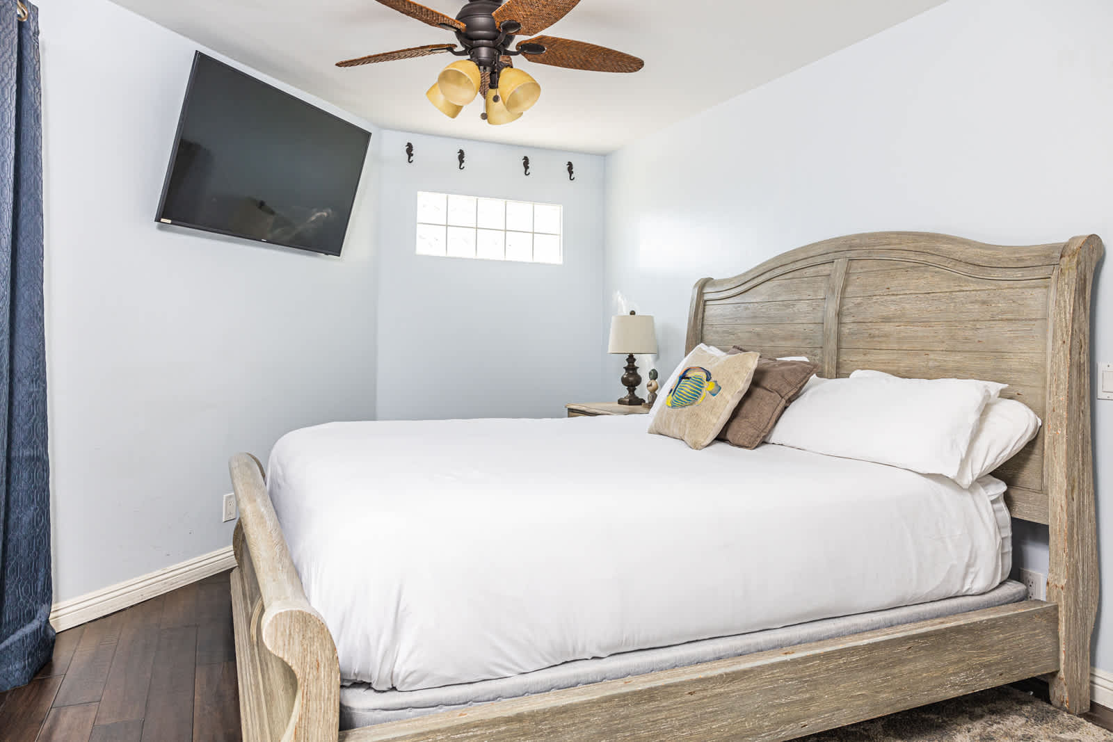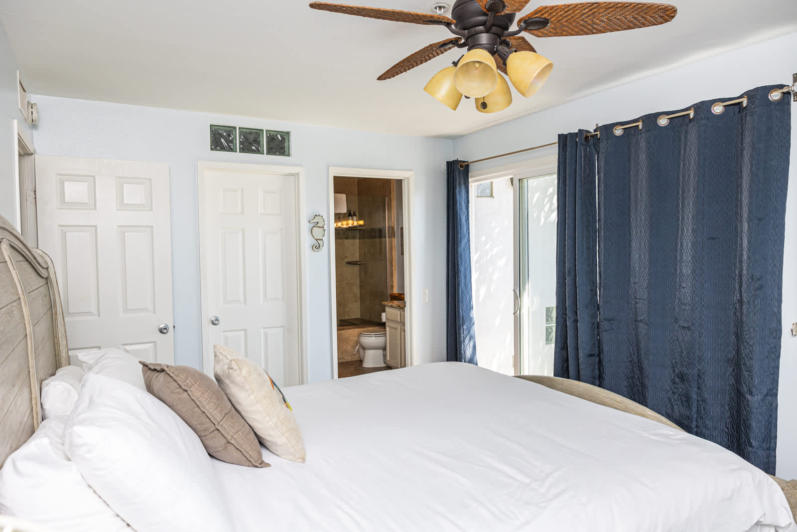 Bedroom #1 includes a California king size bed, TV, balcony access, and ensuite bathroom with a single vanity and walk in shower.