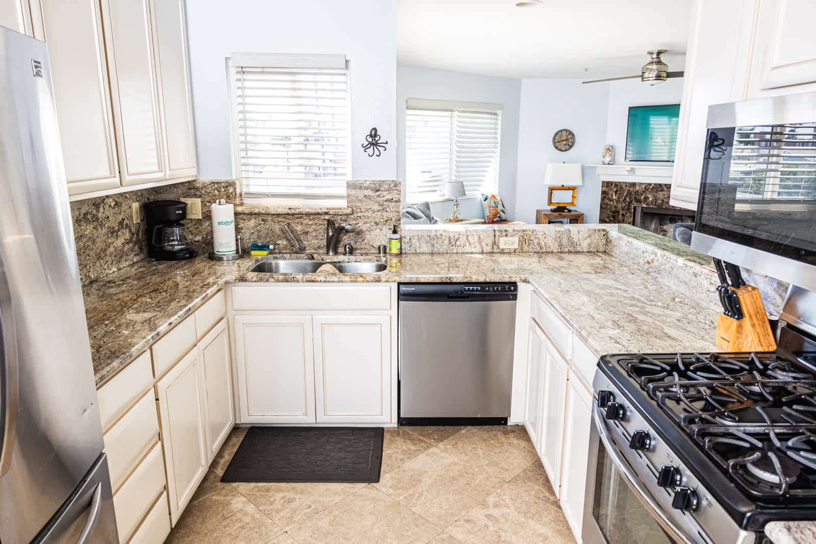 The home’s luxurious interior has been expertly curated to maximize your stay, with spaces designed to help you relax and unwind after days exploring the great outdoors. The great room is illuminated in natural light, complete with comfortable sofa seating, a mounted cable TV, and showpiece stone fireplace. Step out onto the newly furnished balcony to enjoy the incredible views and fresh breeze while you sip on your morning coffee or a refreshing afternoon cocktail. Back indoors, lose yourself in the pages of a good book in the second living room, complete with its own sofa and mounted TV for a more immersive entertainment experience. The modern kitchen has everything you need to satisfy your culinary desires, equipped with stainless steel appliances, stone countertops, and cabinetry stocked with cookware and dining ware. Gather for communal dining around the table with seating for 8, afterward breaking out the cards for a competitive night of games and laughter.
