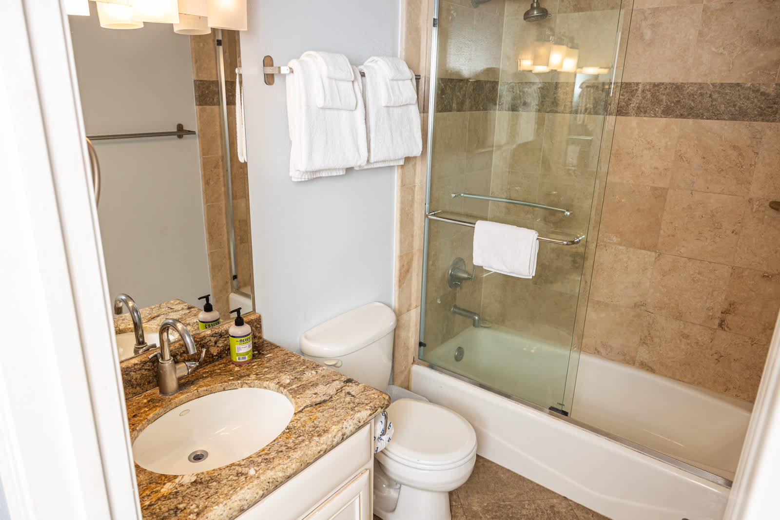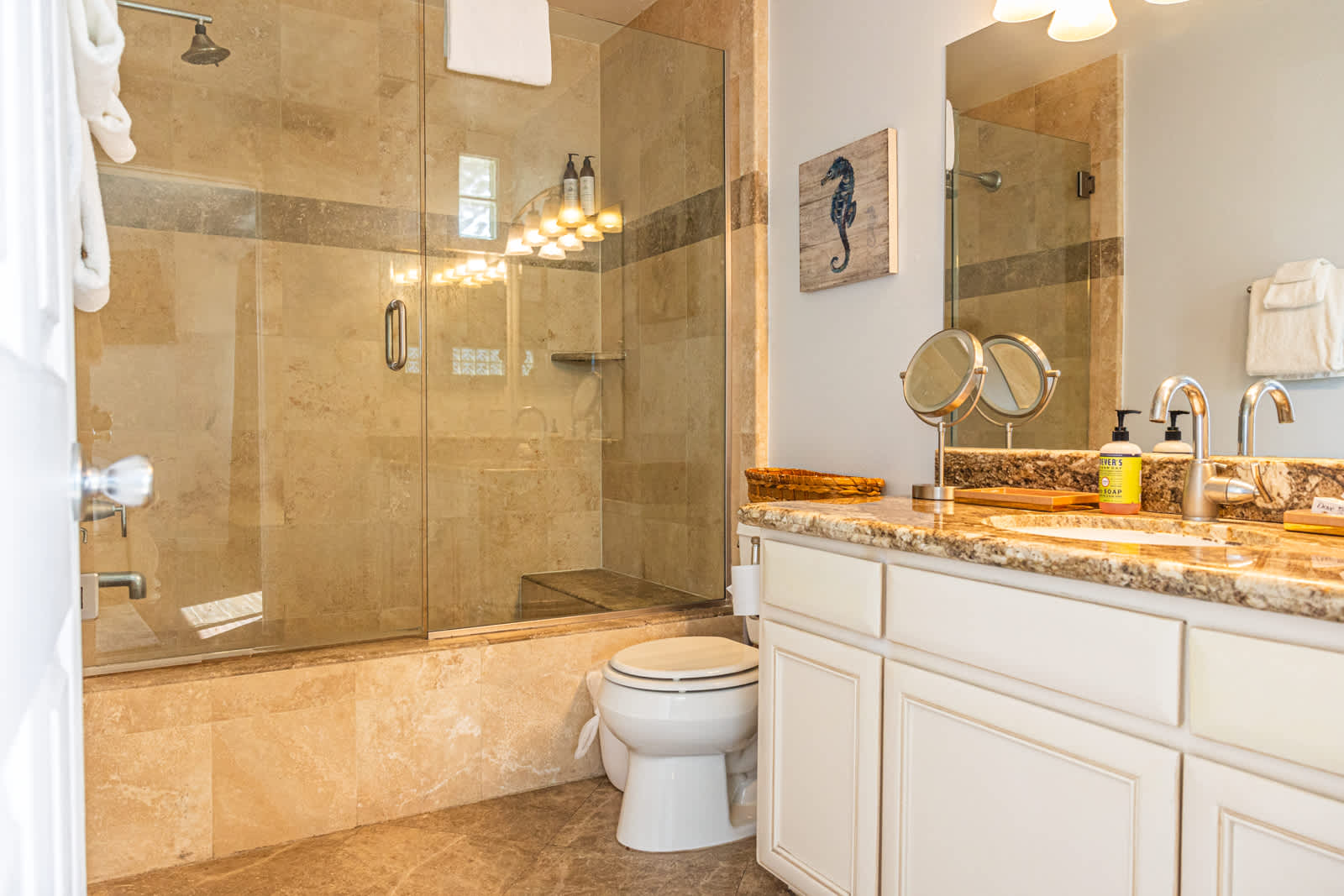 The home also includes a half bathroom as well as an additional full guest bathroom with a single vanity and shower/tub combo.