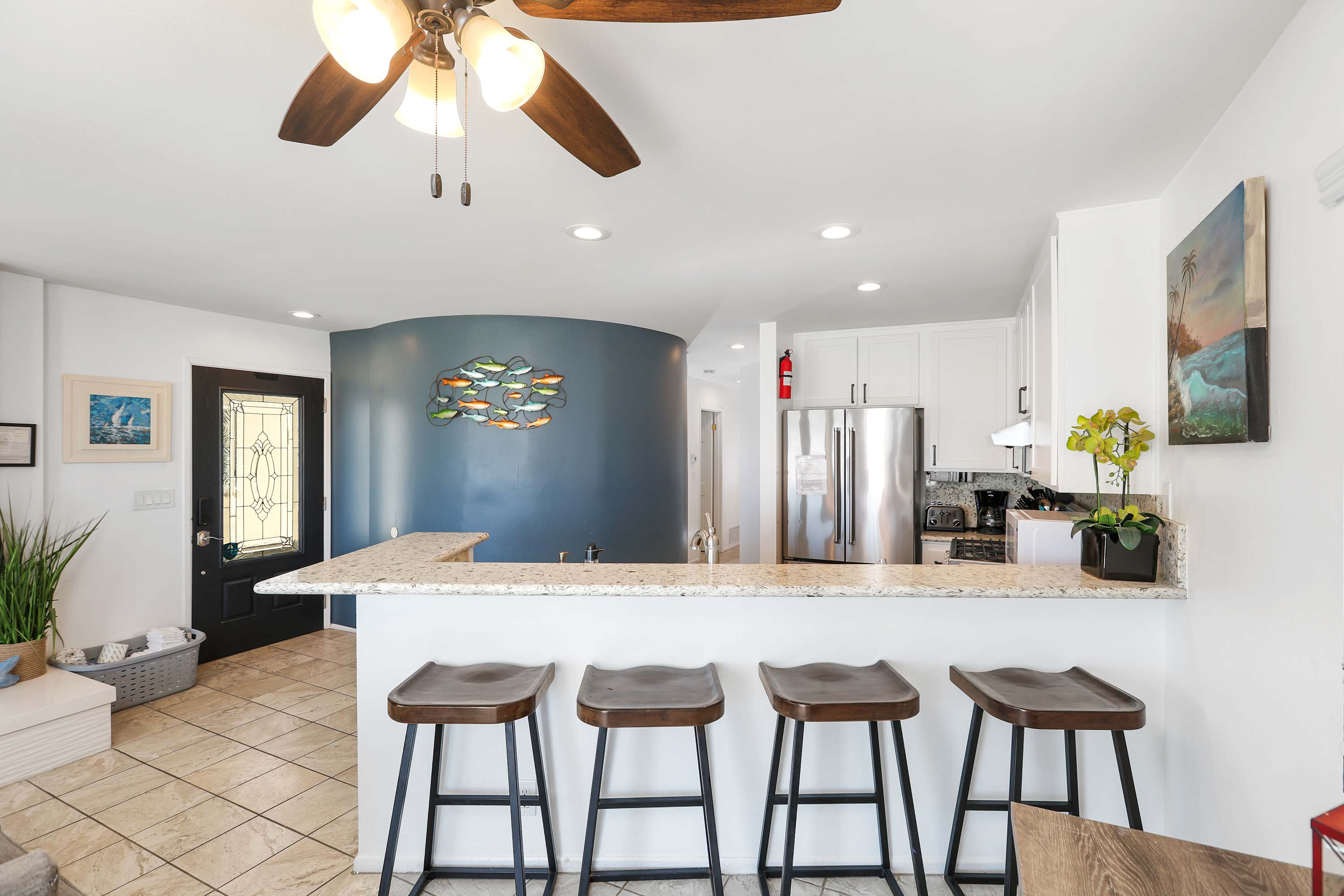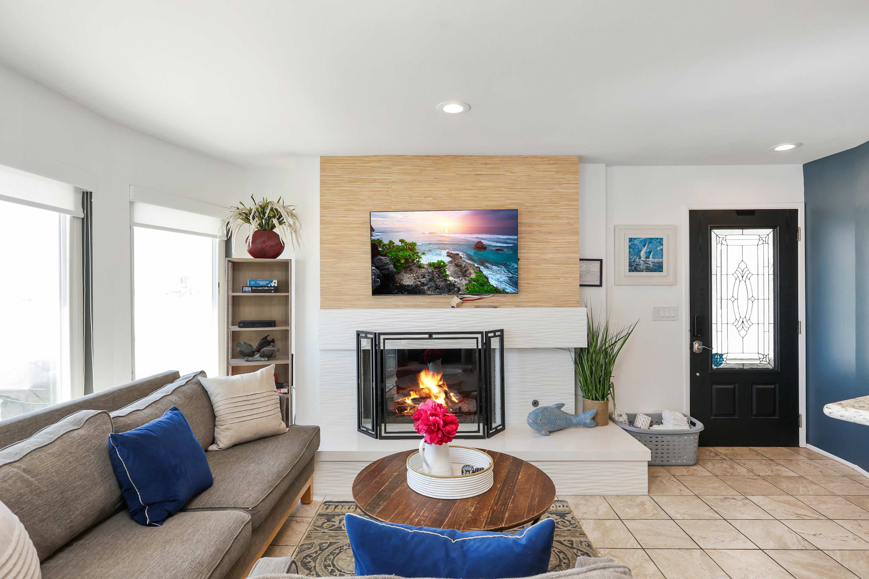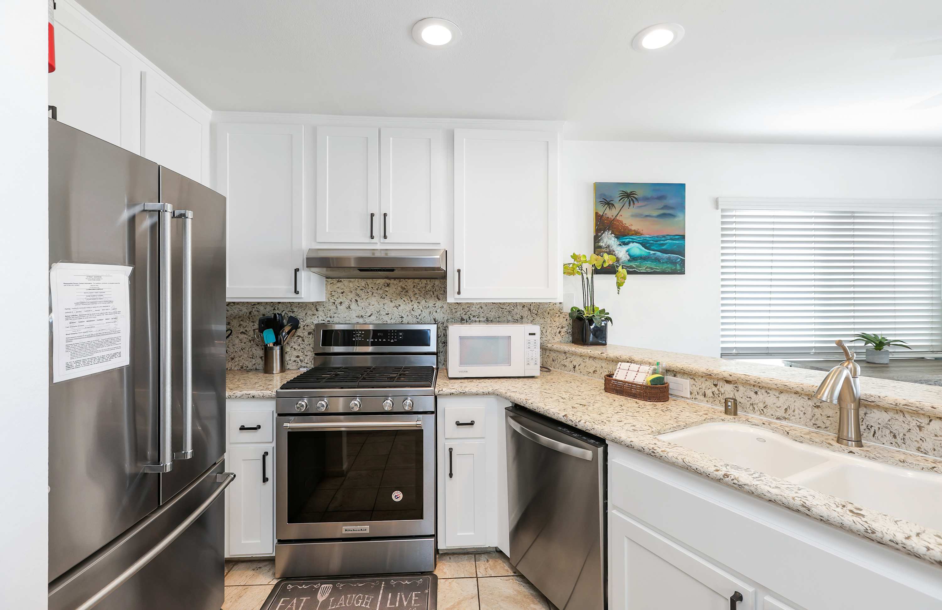 Indoors, serene coastal-inspired spaces envelop you in comfort and style, creating the ideal space for relaxation and rejuvenation between sun-soaked adventures. Curl up on the cushy sofa and loveseat in the living room to stream episodes of all your favorite shows on the smart TV, the gas fireplace keeping things cozy during the cooler nights. Steps away, the modern kitchen comes fully stocked for all your mealtime needs, featuring brand-new appliances, glossy stone countertops, and sleek cabinetry for storing all your snacks and goodies. Snag a high-top stool at the counter to snack on a spread of appetizers or take your meal with a view at the table for 2.