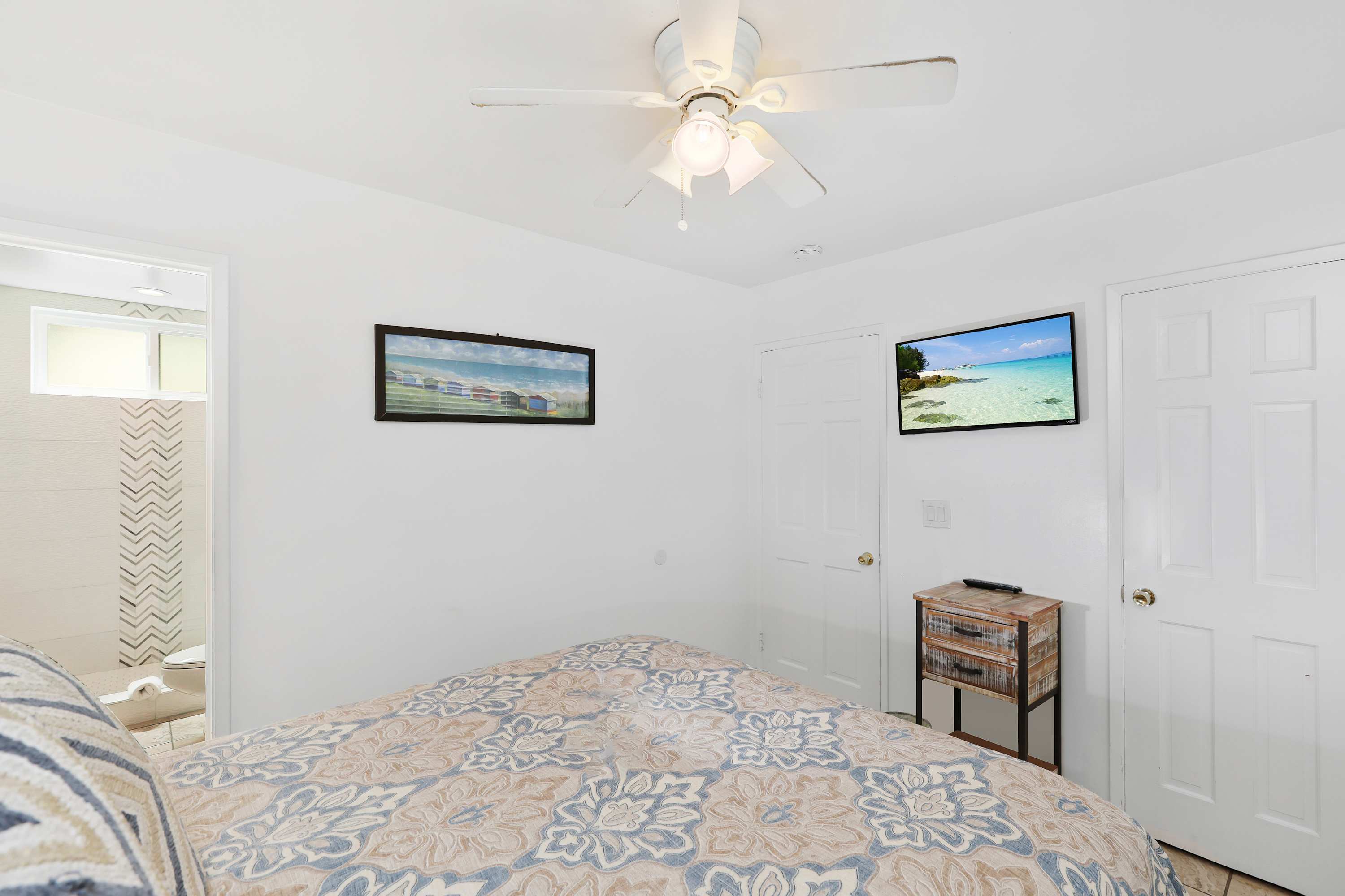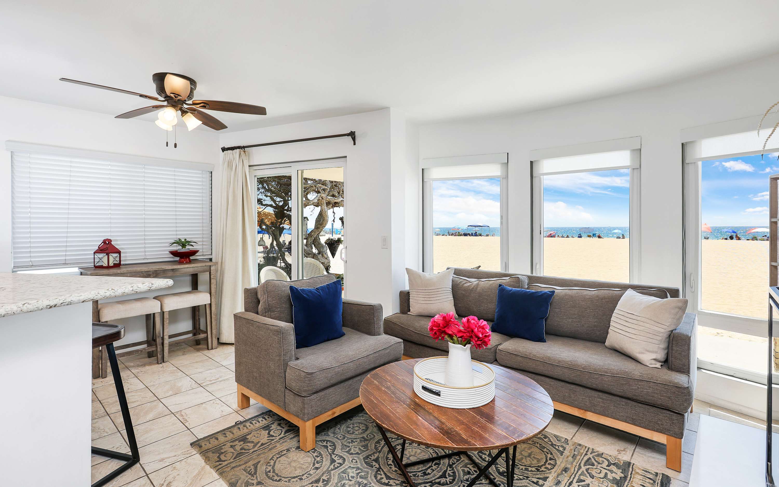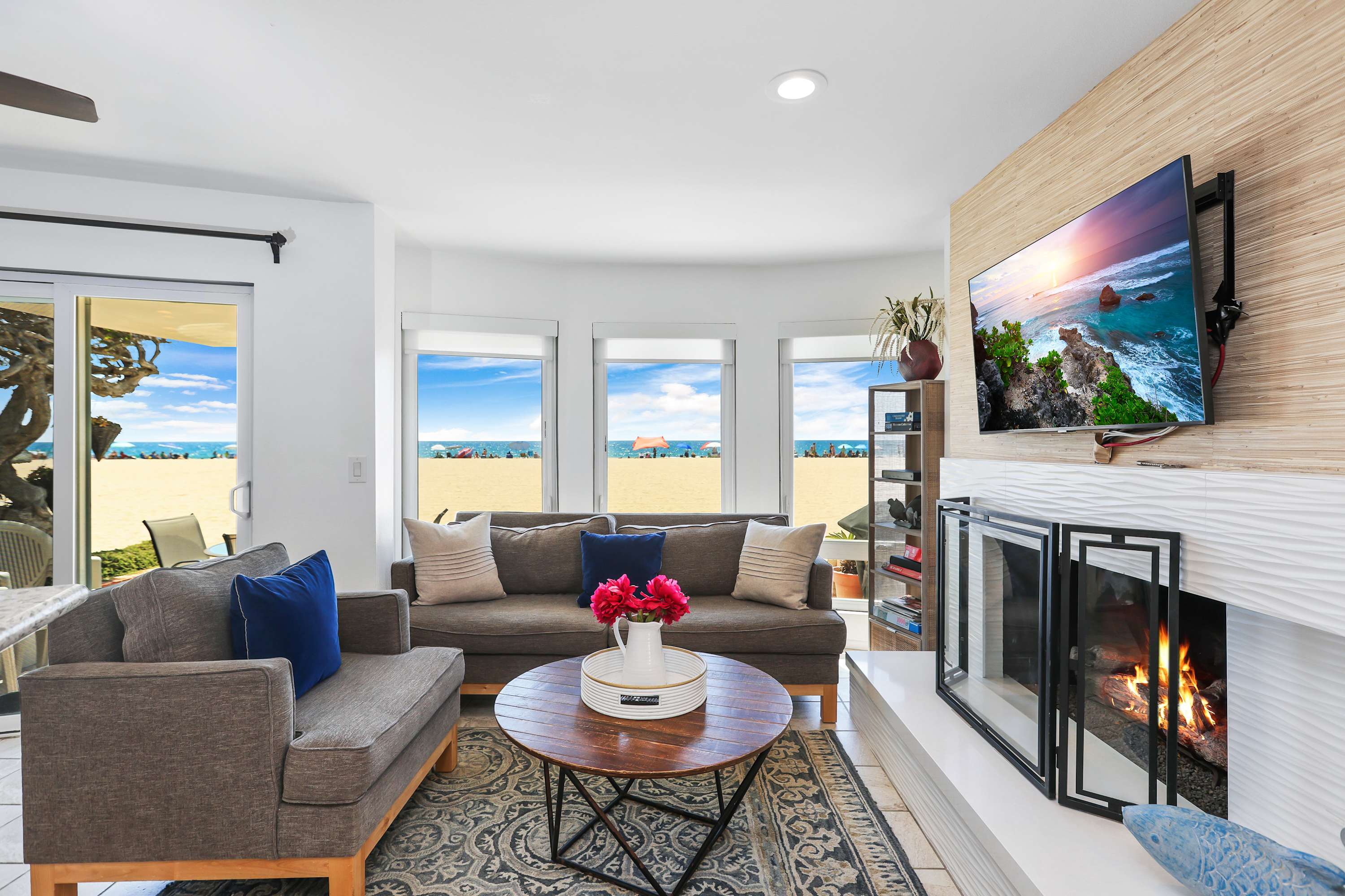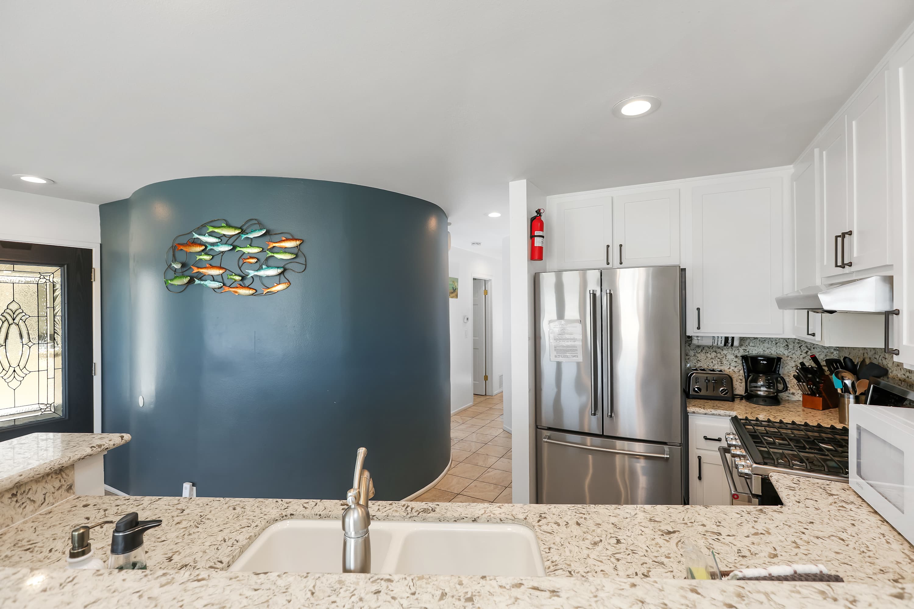 Indoors, serene coastal-inspired spaces envelop you in comfort and style, creating the ideal space for relaxation and rejuvenation between sun-soaked adventures. Curl up on the cushy sofa and loveseat in the living room to stream episodes of all your favorite shows on the smart TV, the gas fireplace keeping things cozy during the cooler nights. Steps away, the modern kitchen comes fully stocked for all your mealtime needs, featuring brand-new appliances, glossy stone countertops, and sleek cabinetry for storing all your snacks and goodies. Snag a high-top stool at the counter to snack on a spread of appetizers or take your meal with a view at the table for 2.