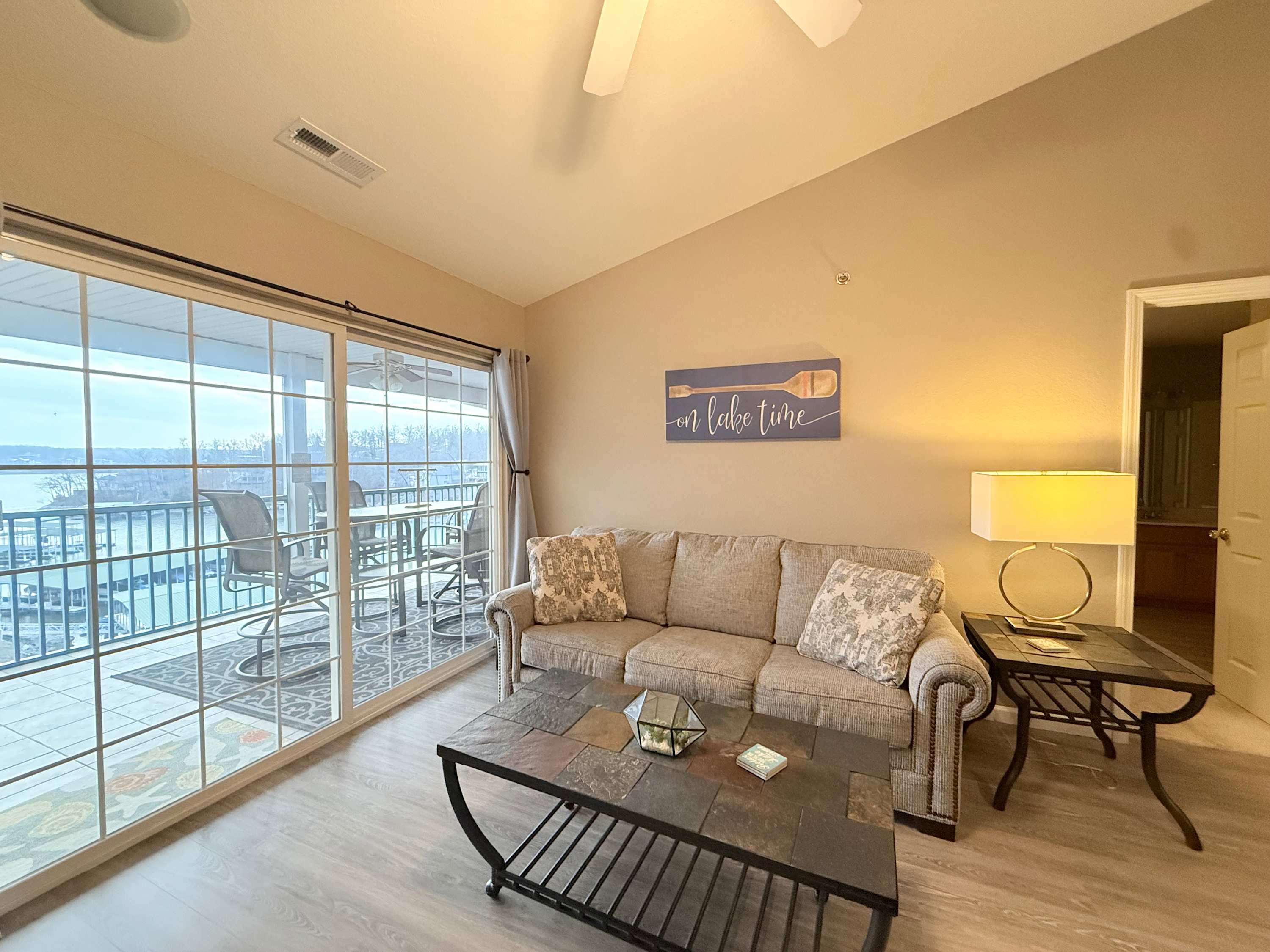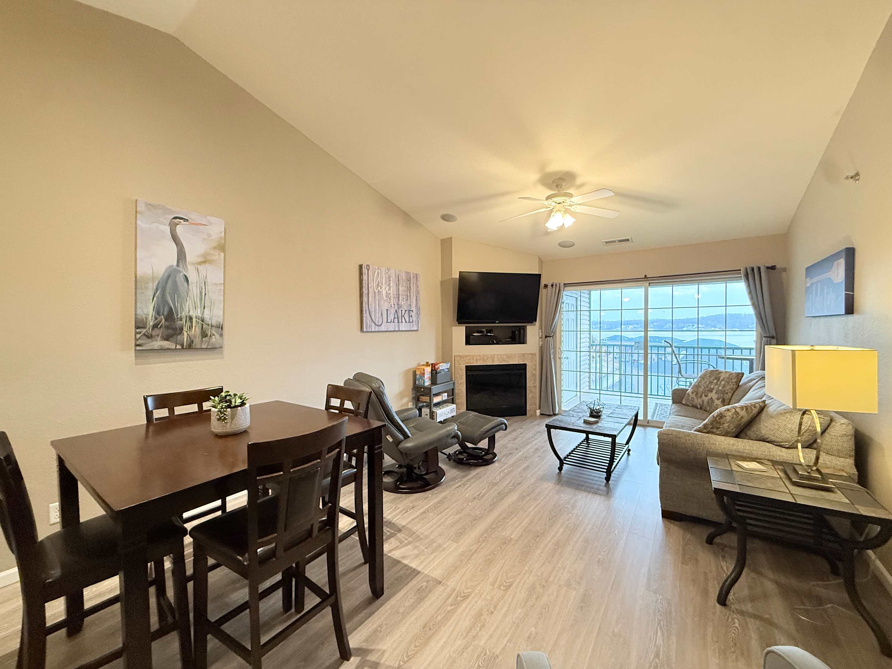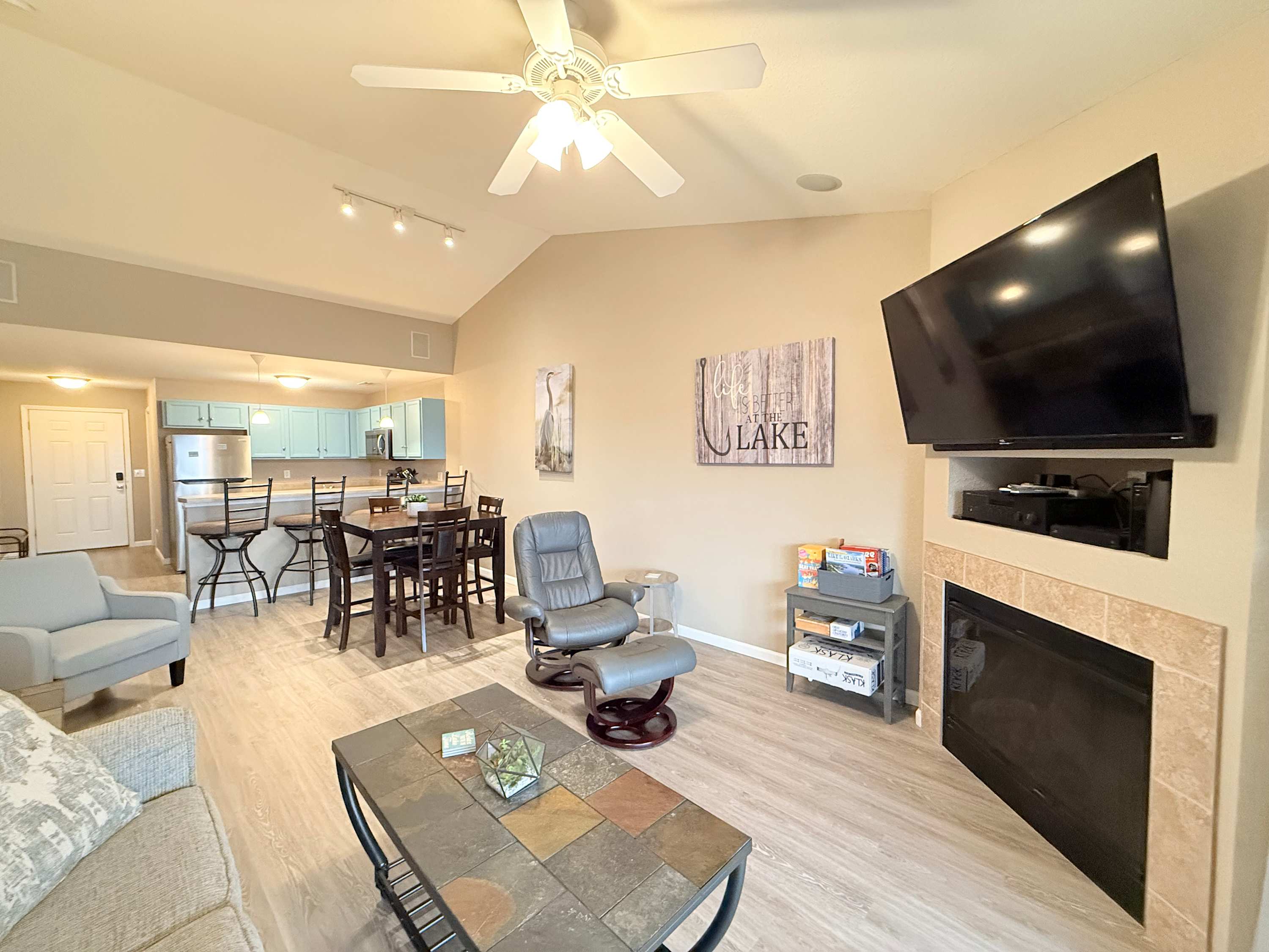 Guests of the home will be able to take full advantage of the seasonal community swimming pool, the best way to beat the heat during the summer months while enjoying all the sights and sounds of the lake. When you need a break from the action or to enjoy some quiet downtime, head inside the condo where open and well-lit spaces welcome you to relax and unwind. Sink into the plush living room sofa while you catch up on episodes of your favorite show on the smart TV. An electric fireplace will keep you warm and toasty during the cooler nights, creating the right ambiance for a family movie night. The well-equipped kitchen offers everything you need to prepare delicious meals right at home, with ample cabinetry available for food storage. Gather together for formal meals at the dining room table with seating for 4 or hop up to the counter and enjoy afternoon appetizers on the high-top stools. In the mornings, enjoy your fresh cup of coffee out on the screened-in balcony, overlooking the peaceful views of the water as you plan out the day’s activities.