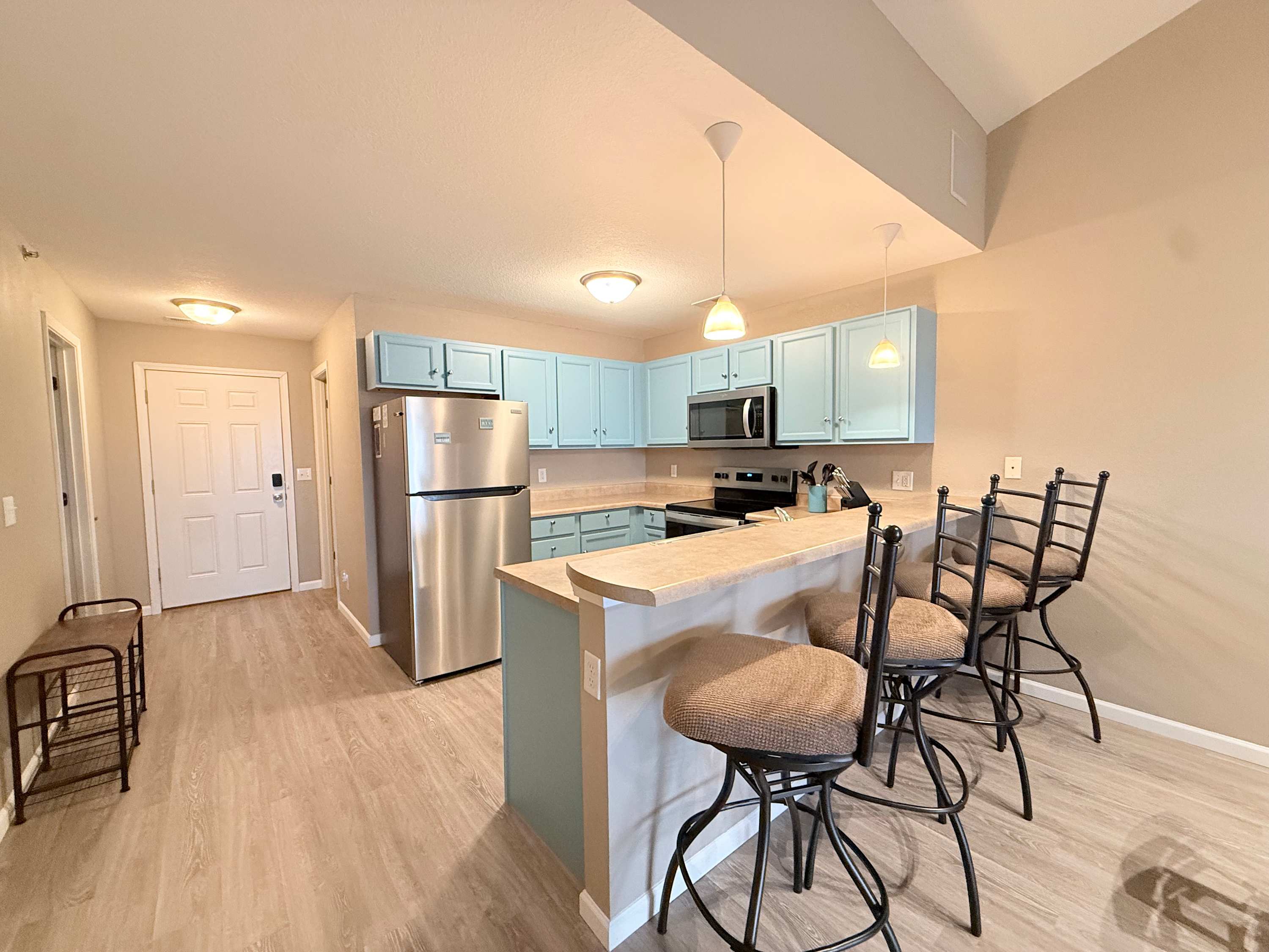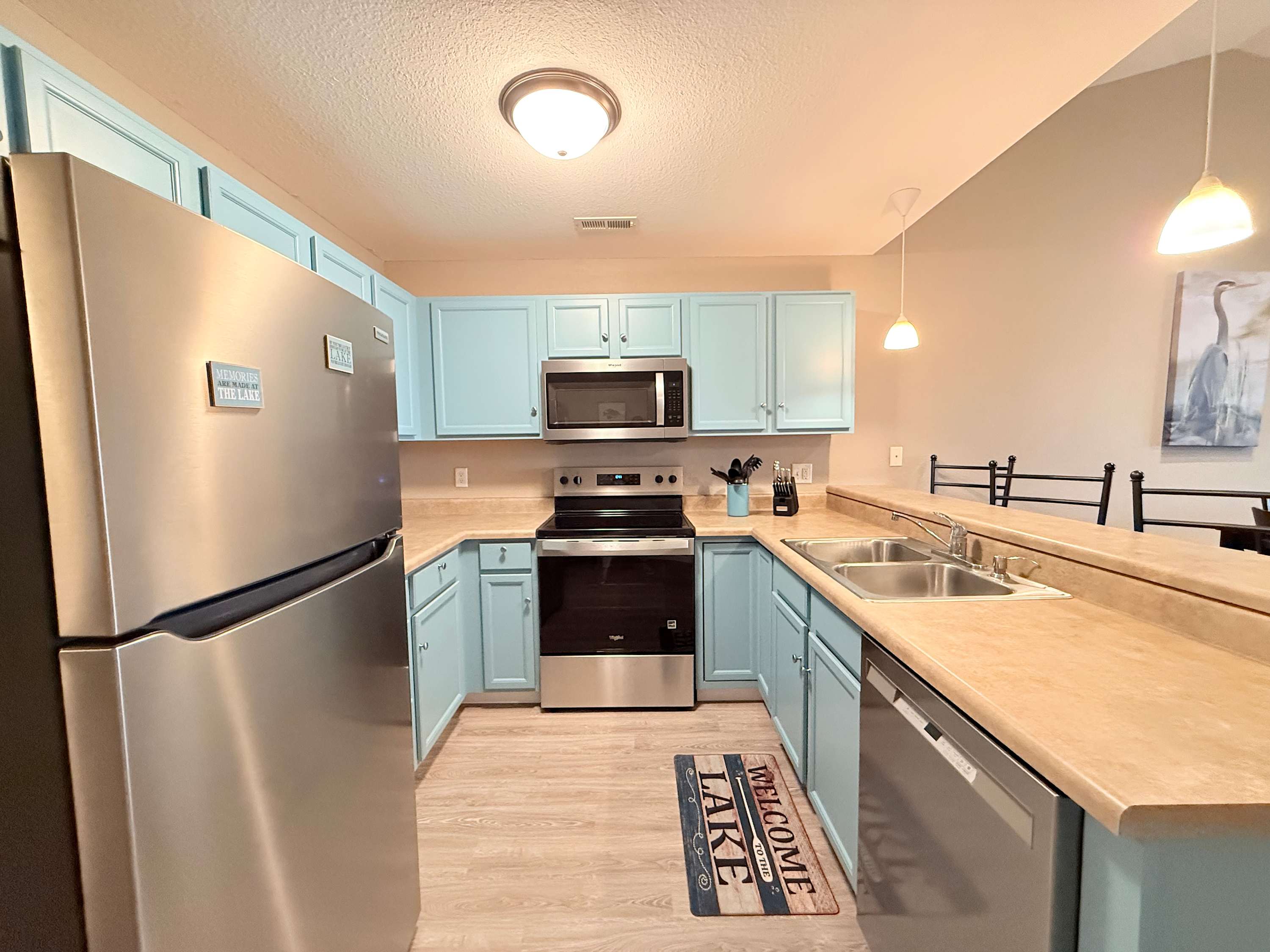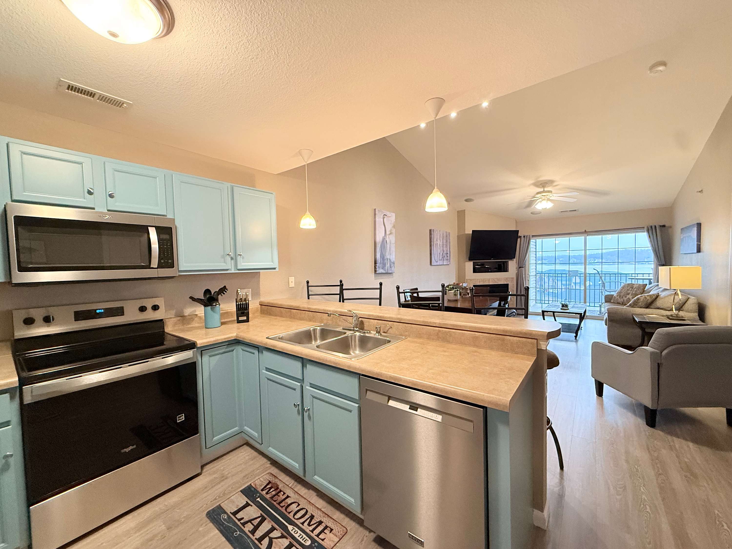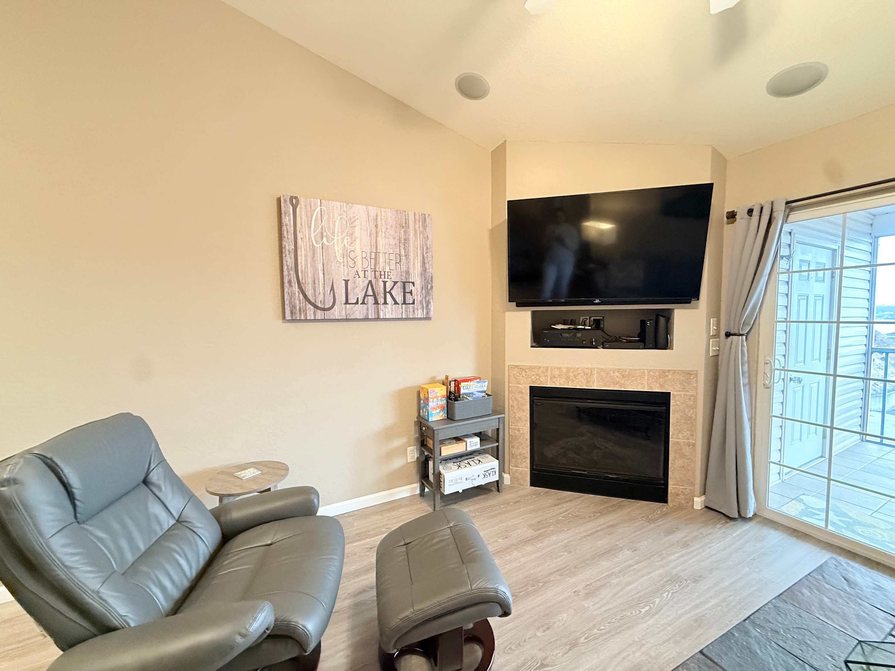 Guests of the home will be able to take full advantage of the seasonal community swimming pool, the best way to beat the heat during the summer months while enjoying all the sights and sounds of the lake. When you need a break from the action or to enjoy some quiet downtime, head inside the condo where open and well-lit spaces welcome you to relax and unwind. Sink into the plush living room sofa while you catch up on episodes of your favorite show on the smart TV. An electric fireplace will keep you warm and toasty during the cooler nights, creating the right ambiance for a family movie night. The well-equipped kitchen offers everything you need to prepare delicious meals right at home, with ample cabinetry available for food storage. Gather together for formal meals at the dining room table with seating for 4 or hop up to the counter and enjoy afternoon appetizers on the high-top stools. In the mornings, enjoy your fresh cup of coffee out on the screened-in balcony, overlooking the peaceful views of the water as you plan out the day’s activities.