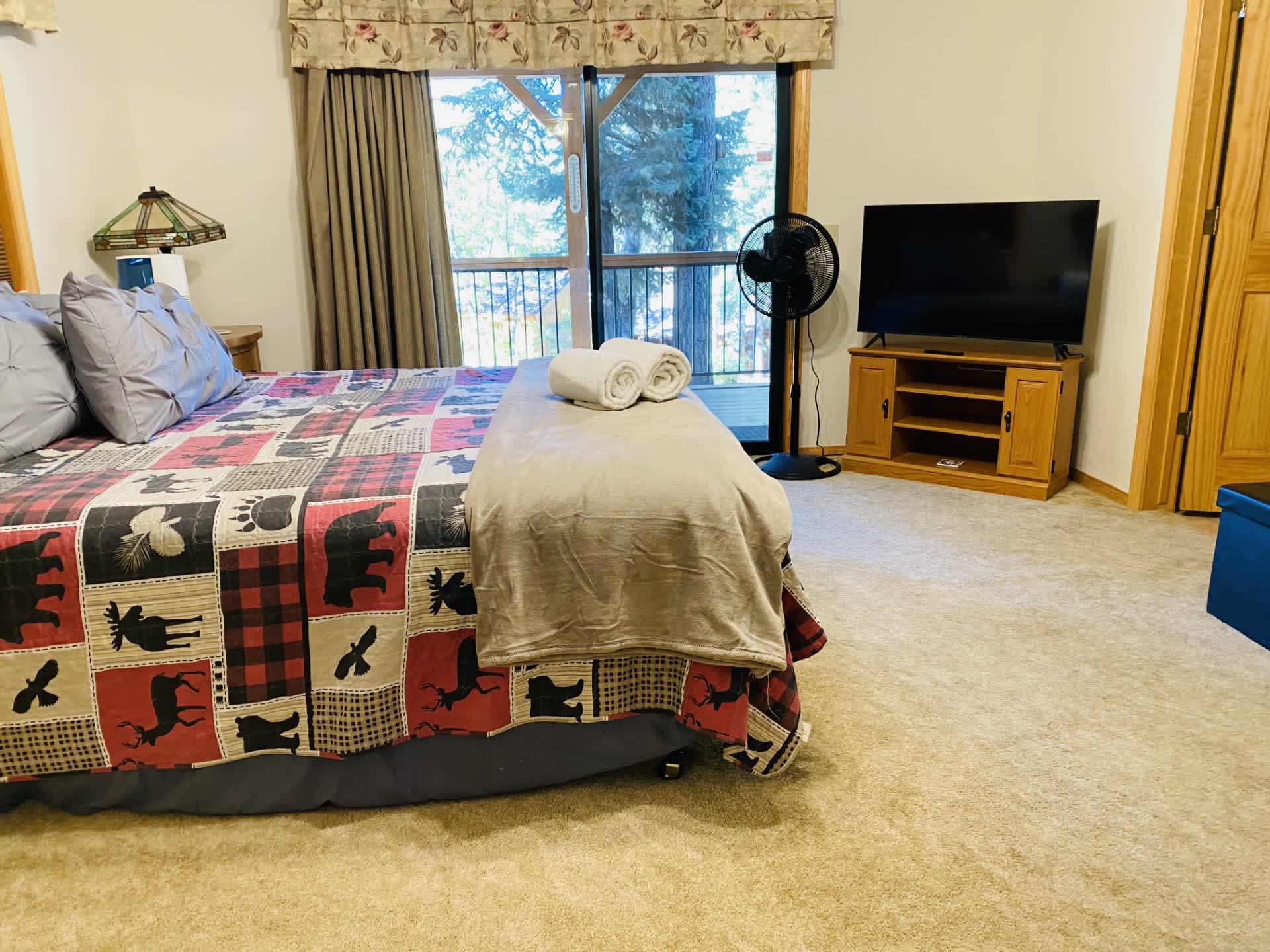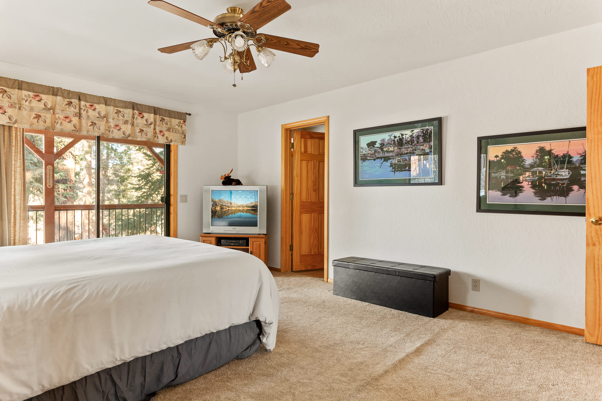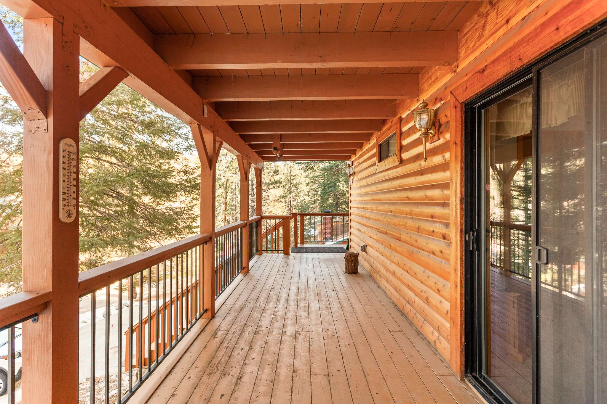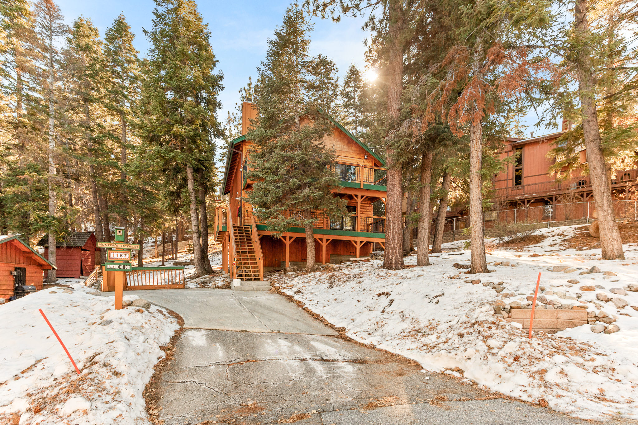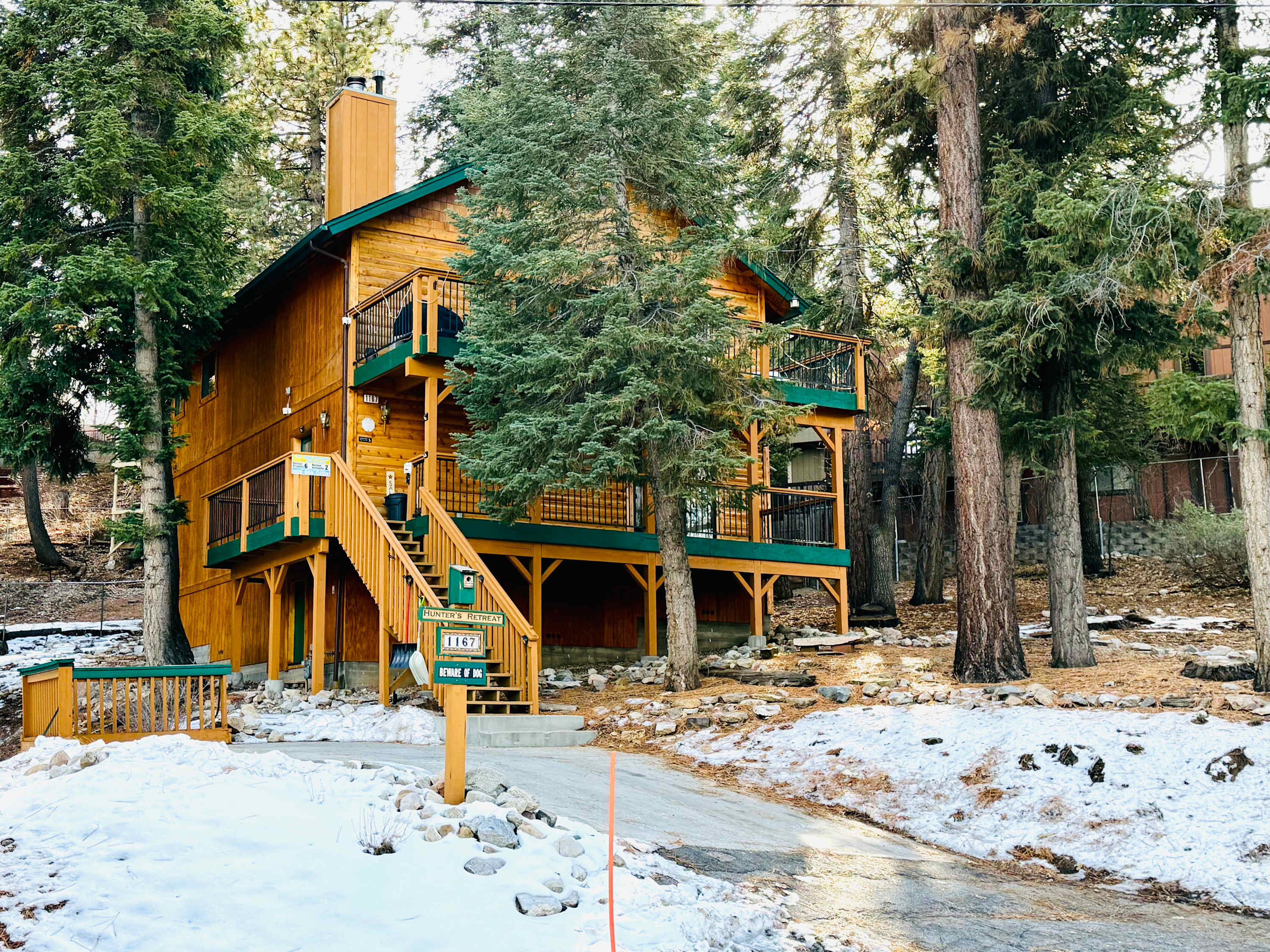 Only 1 mile from Bear Mountain Resort, your stay is minutes from the slopes with shuttle transportation available on Moonridge Blvd. Hunter’s Retreat is also situated near charming village features like the Alpine Pedal Path Trails and pedestrian walkways. With all the outdoor activities of Big Bear available, you’ll certainly enjoy moments of indoor relaxation as well. Inside, the home perfectly blends modern touches with classic cabin design. The main living area is sure to hold some of your trip’s best quality time between the large sectional couch, smart tv, fireplace, and massive kitchen with a full suite of appliances and large kitchen island with barstool seating. Cooking, visiting, eating, and lounging happens all at once and all together.