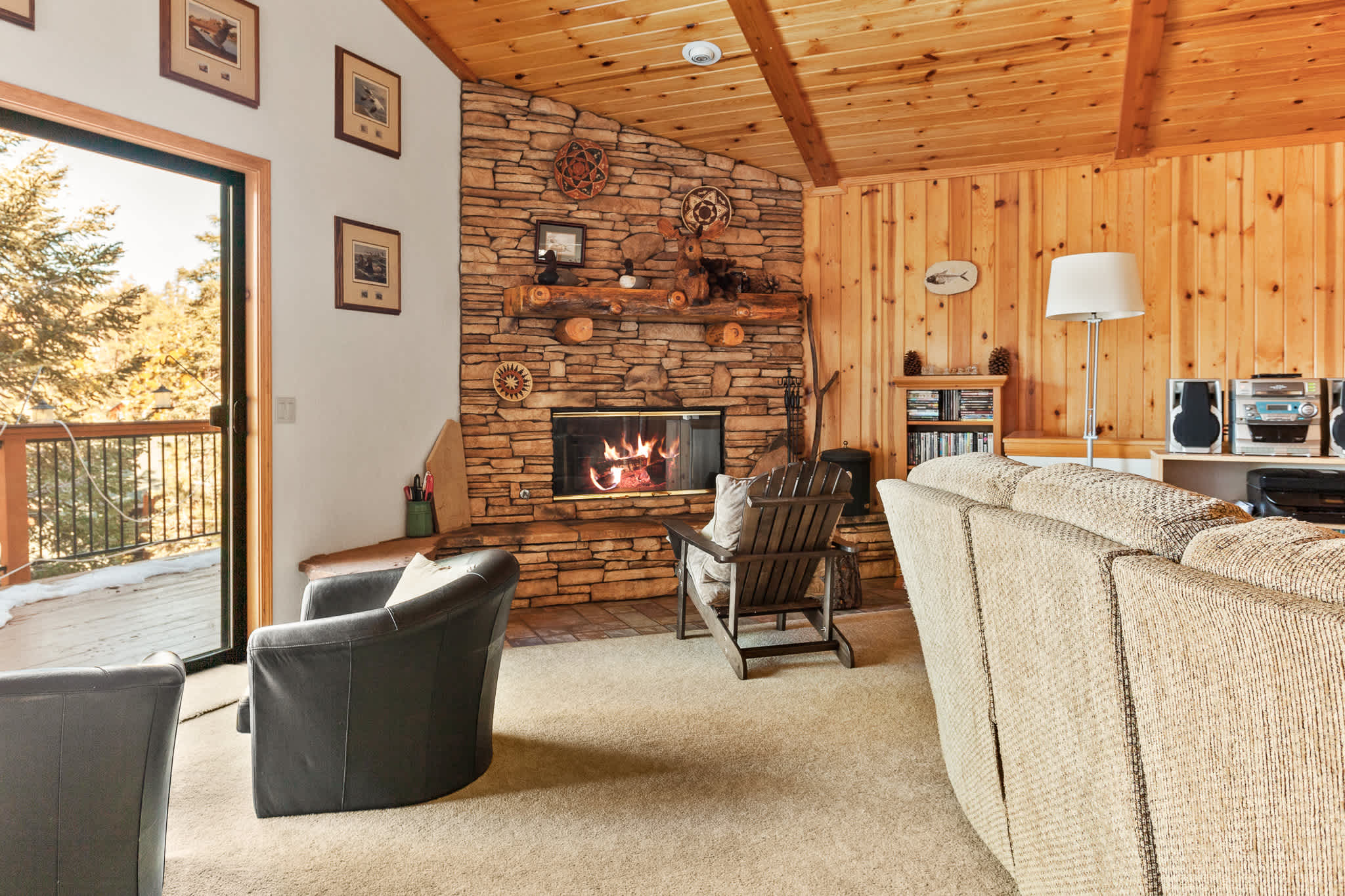 A classic cabin in the woods, Hunter’s Retreat welcomes you to an unforgettable retreat in Big Bear. With details like the stone fireplace, vaulted wood ceilings, and multi-level decks, this home is an indulgence into nature.