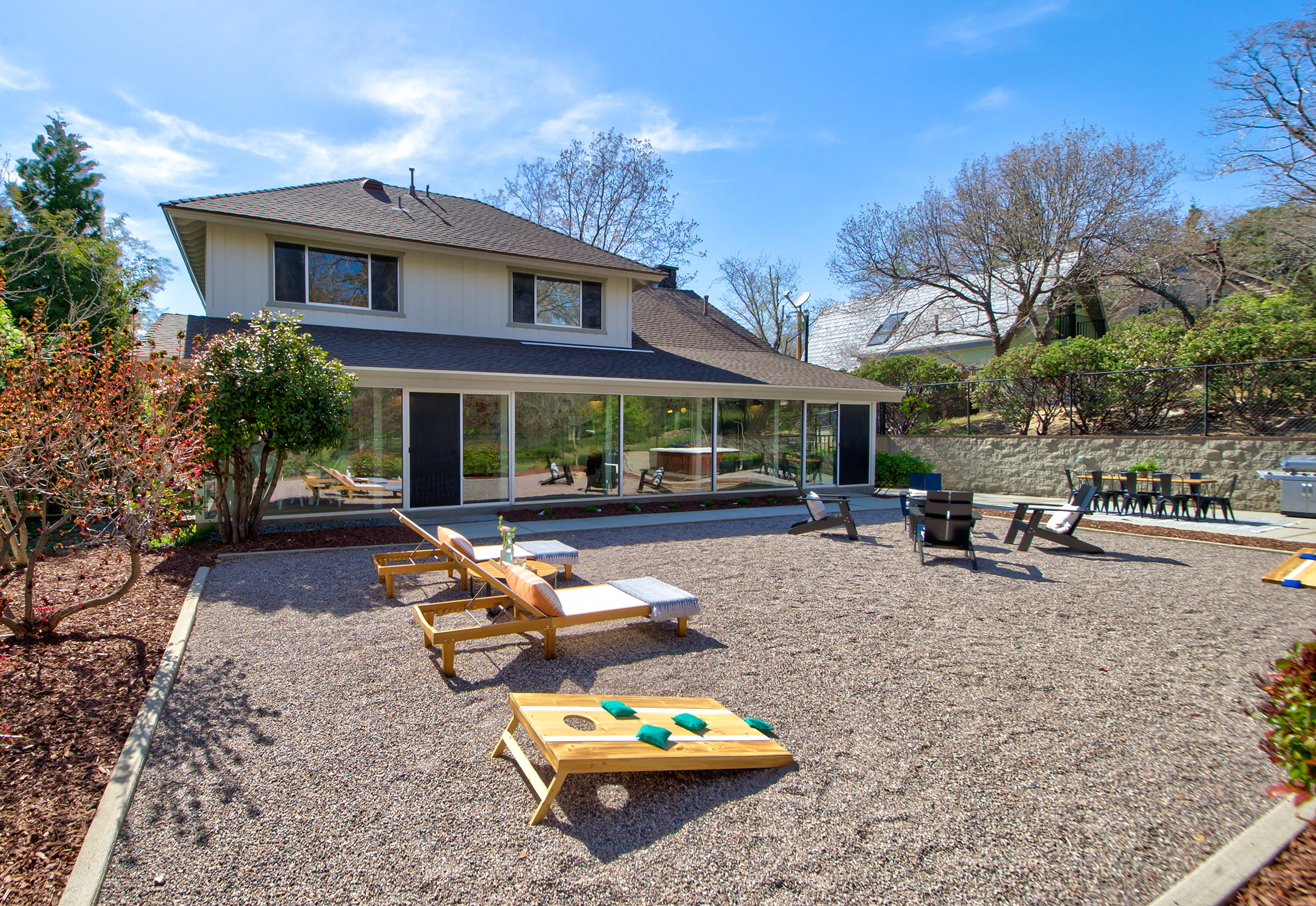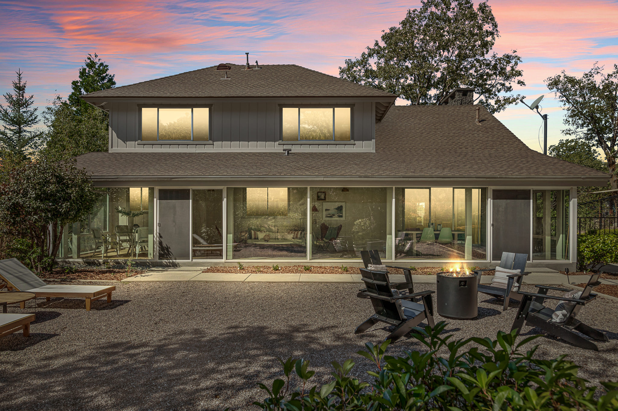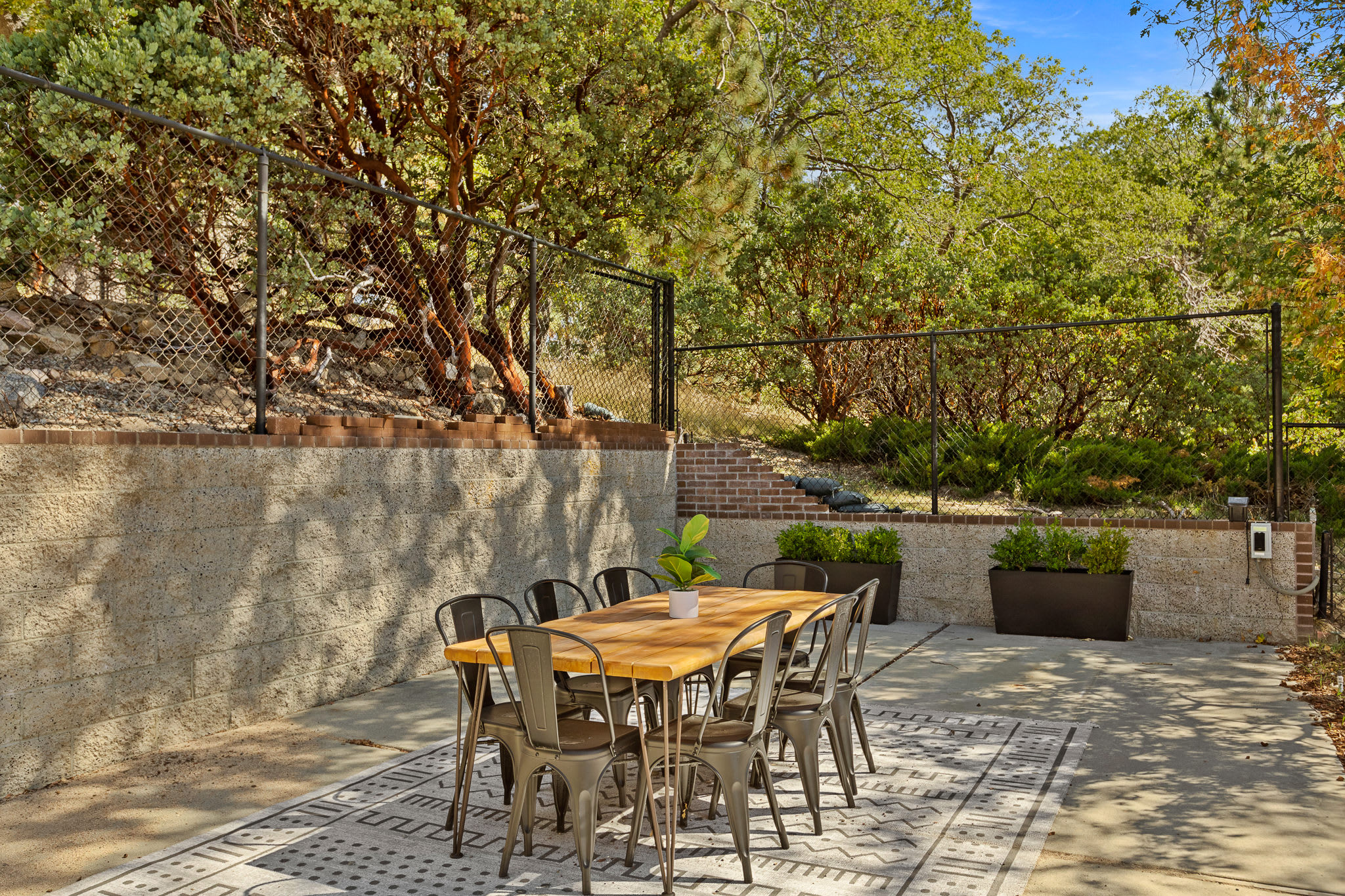 The backyard is completely level and entirely fenced in, featuring a fire pit with adirondack chairs (perfect for roasting marshmallows) and an outdoor dining table -- all overlooking the complete privacy, serenity and beauty of the National Park.