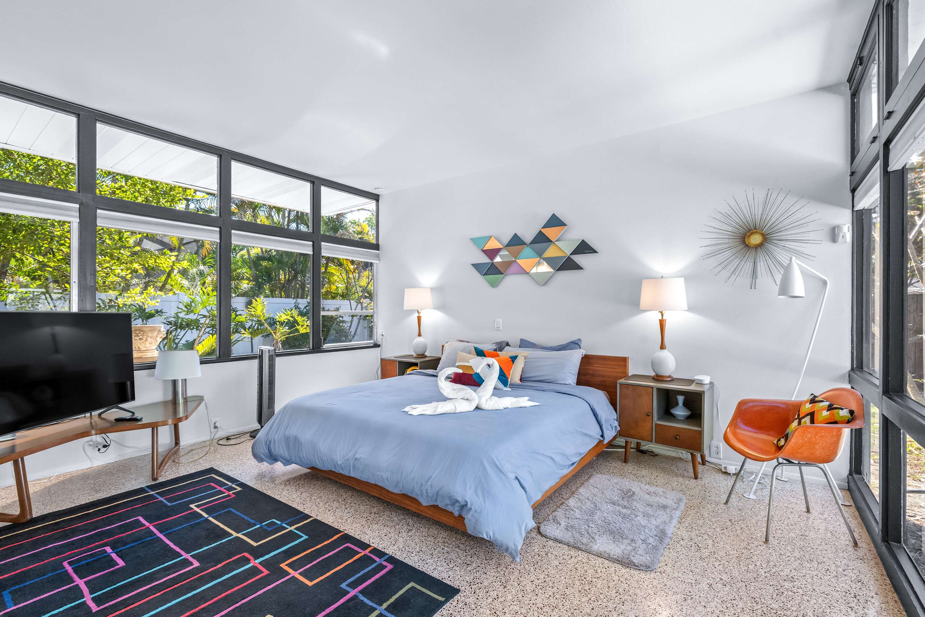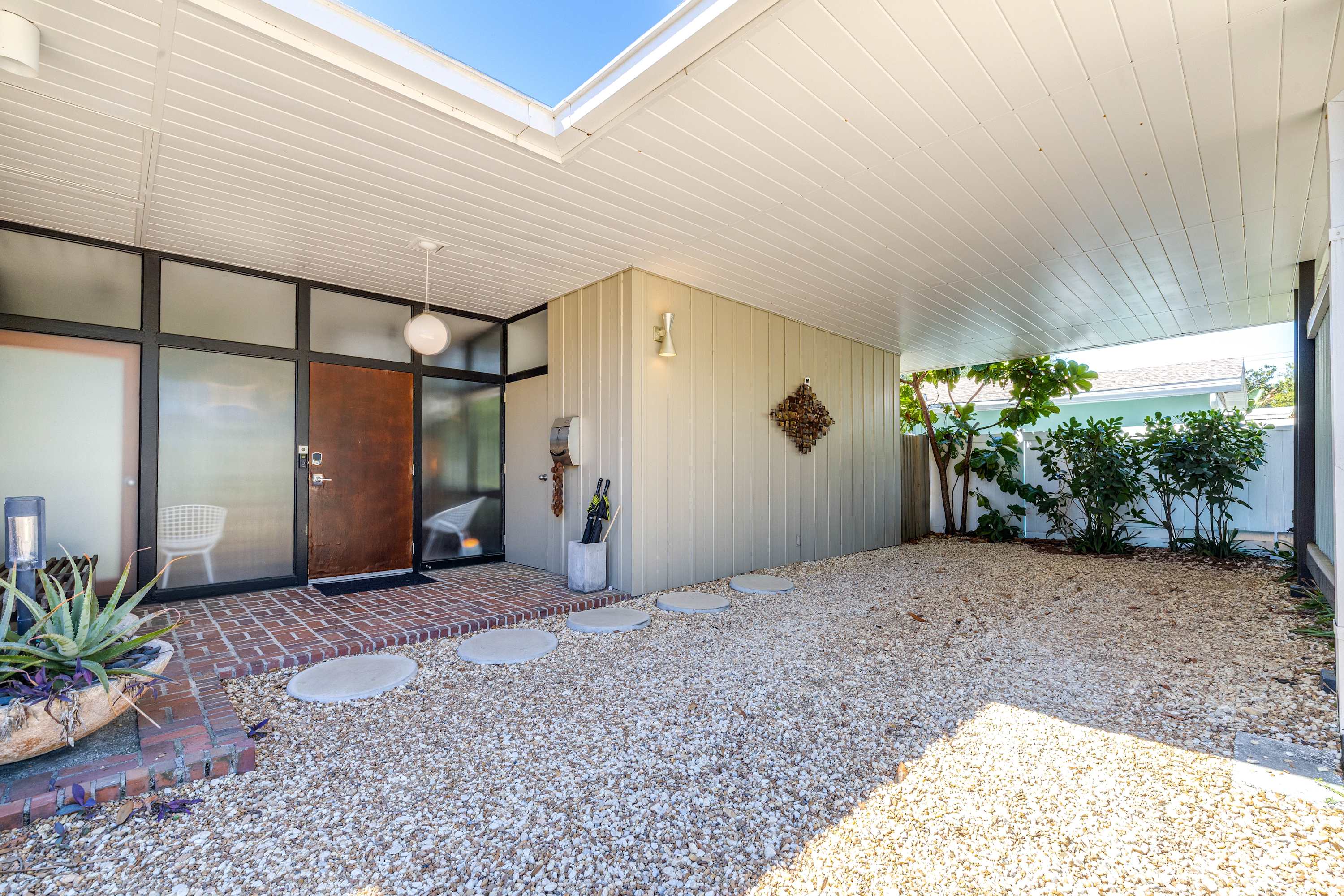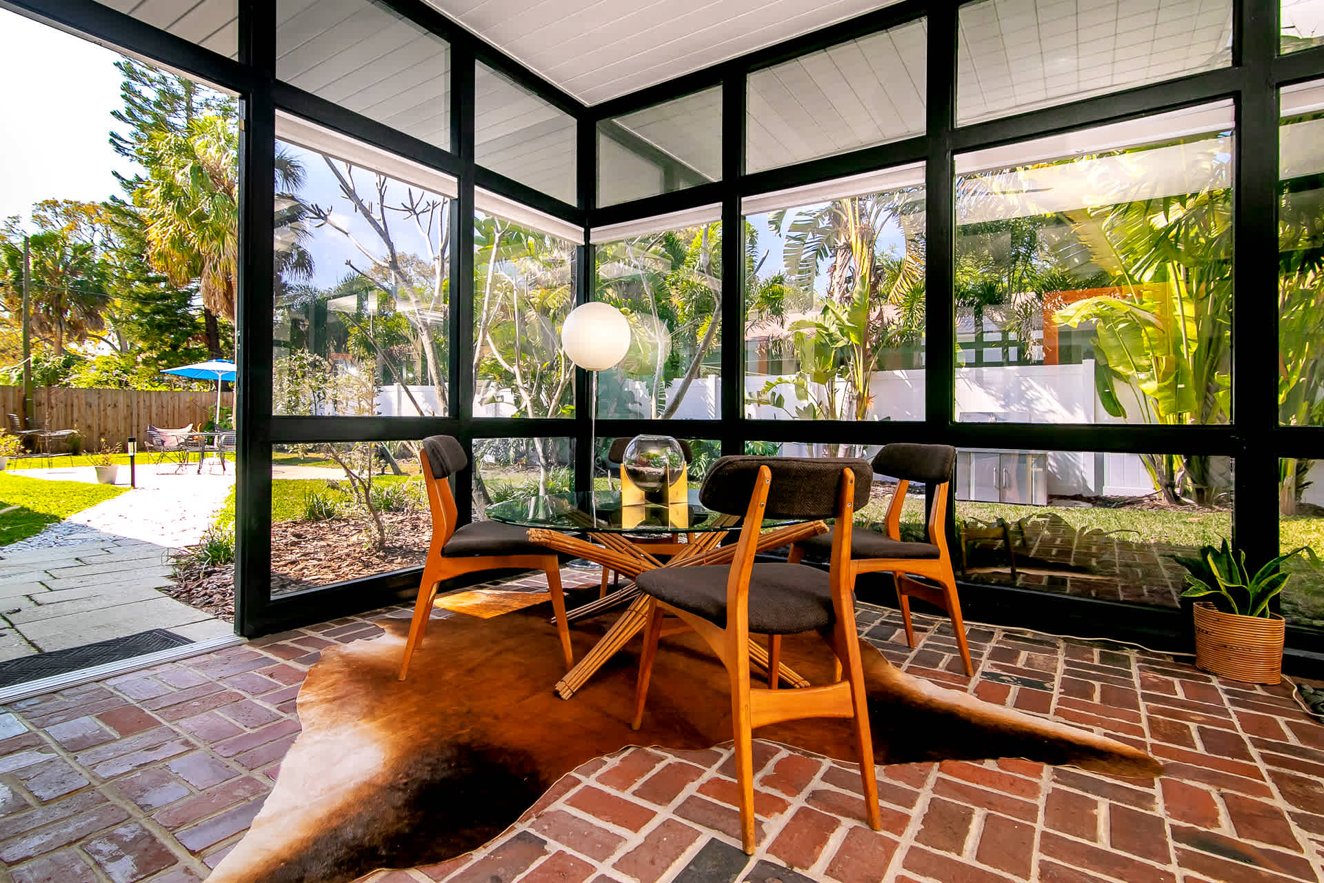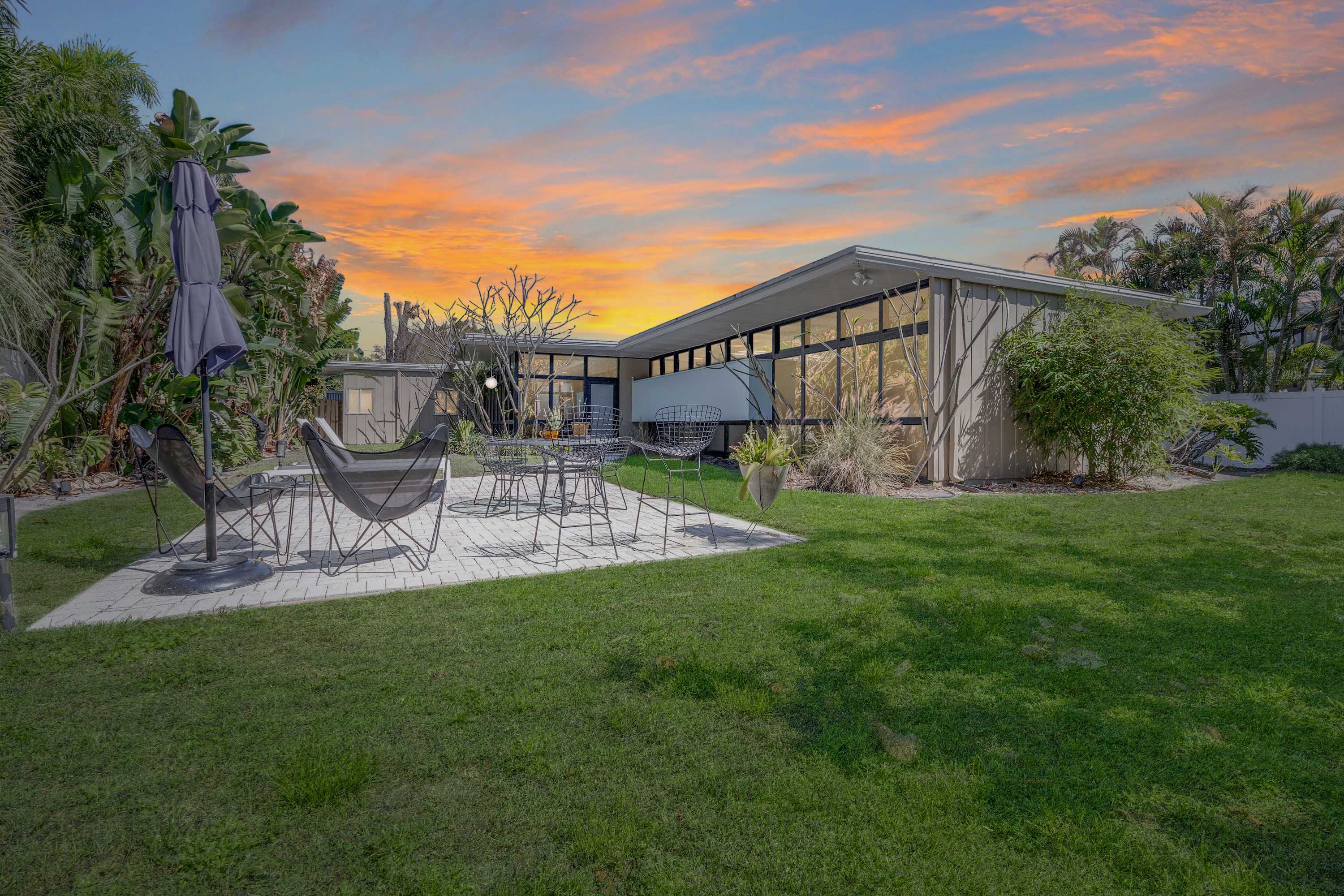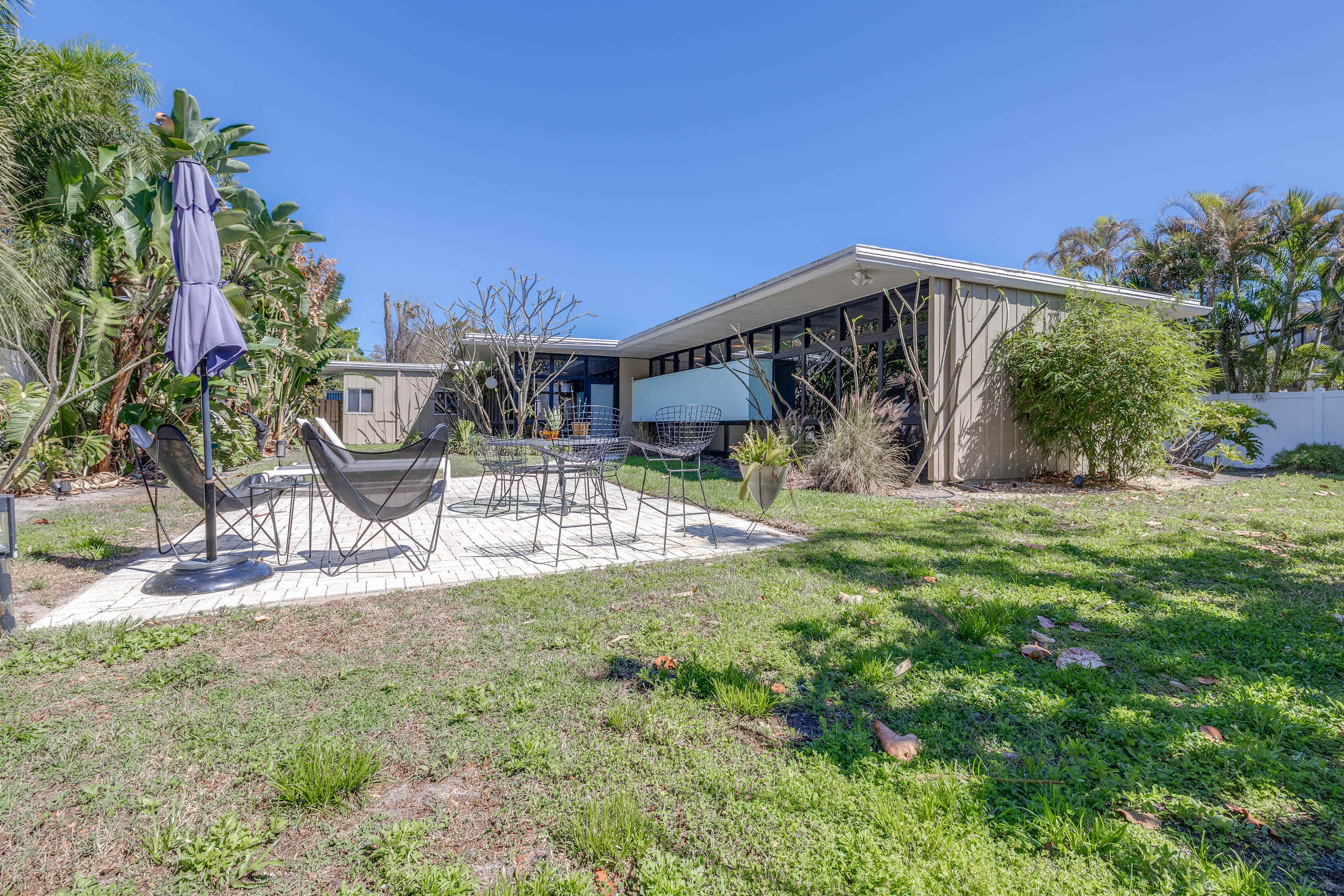 Boasting an authentic mid-century modern design, the home is sure to captivate with its one-of-a-kind features. Enjoy tranquil views from the floor to ceiling windows throughout the home, which also illuminate the space with beautiful natural light. The interior has been thoughtfully designed with unique lighting fixtures, vintage furnishings, and vibrant art that provides warmth, visual interest, and character. Stunning textiles add a touch of luxury and comfort to each room. Outside, the fenced-in yard offers a private space to entertain family and friends with a barbeque grill and furnished patio. All this is just 10-15 minutes from Tampa’s most popular attractions, and 40-45 minutes from St. Petersburg beaches and destinations.