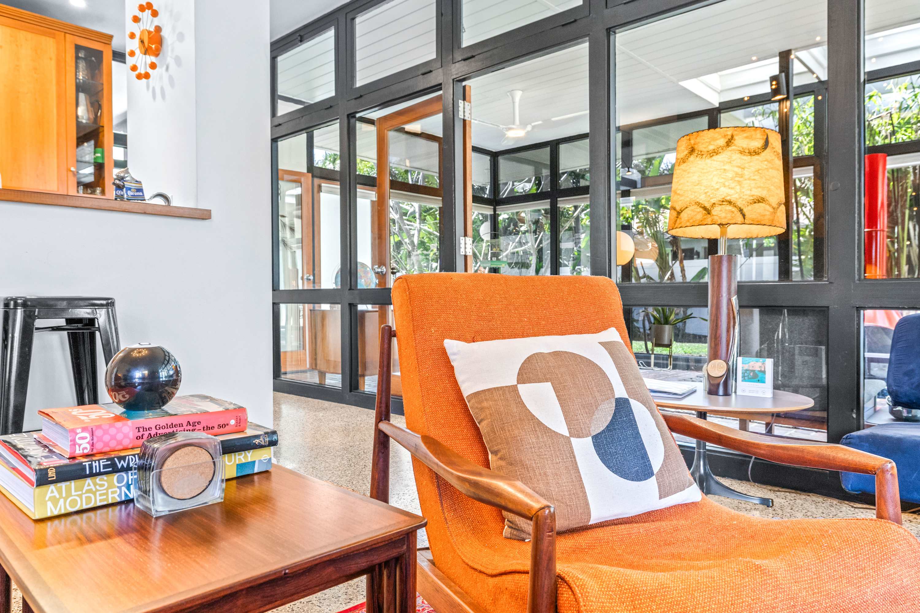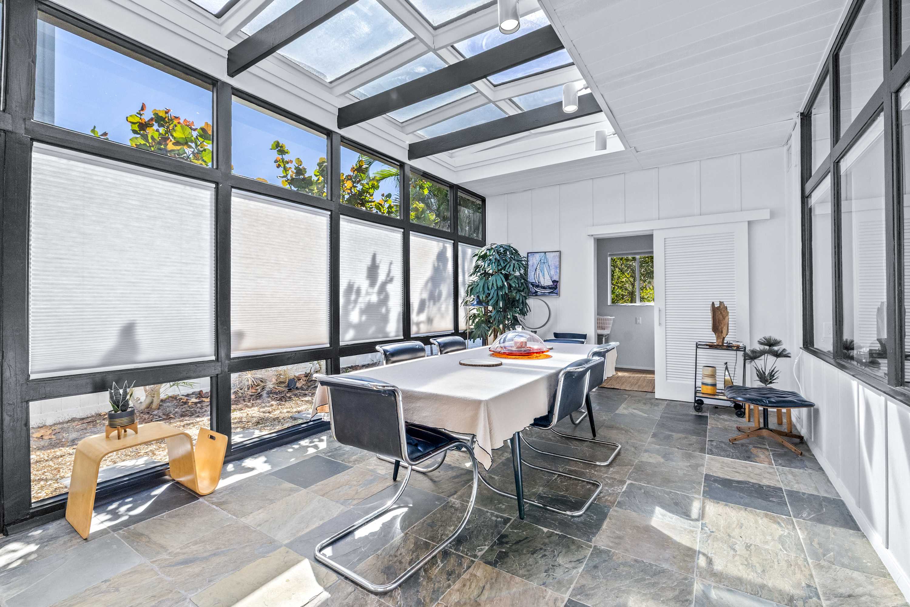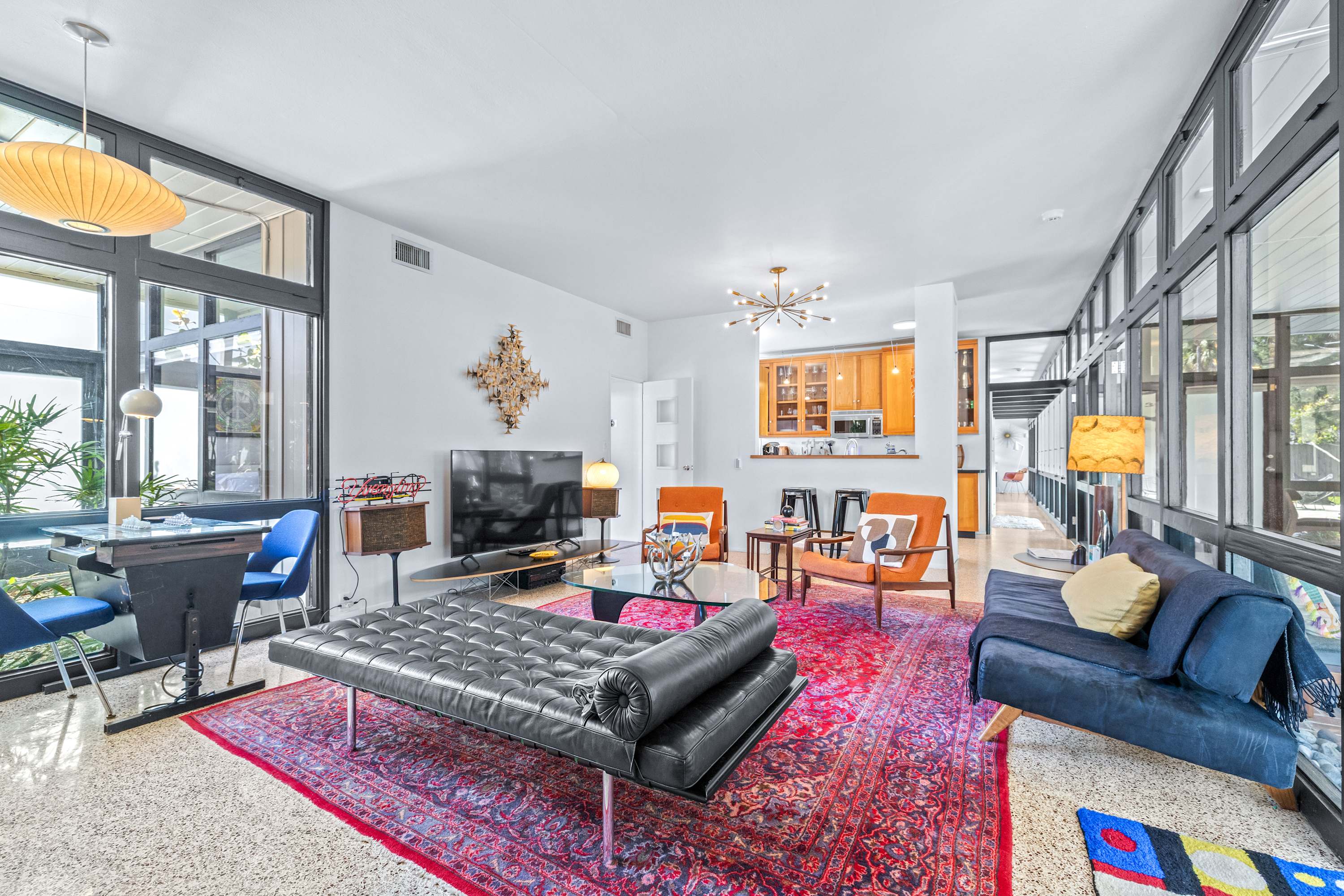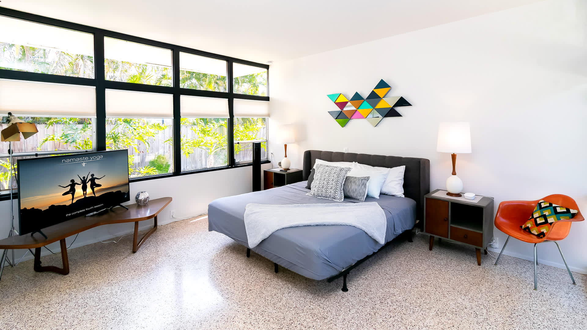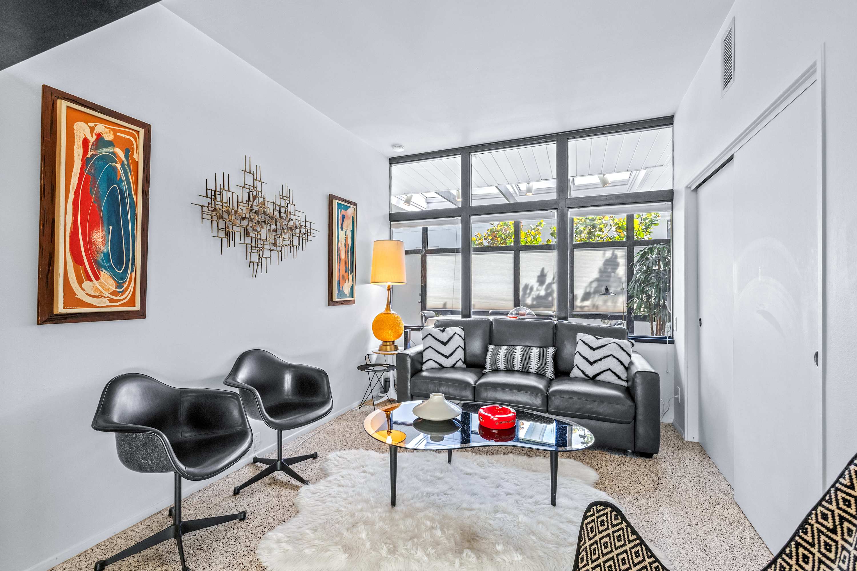 Boasting an authentic mid-century modern design, the home is sure to captivate with its one-of-a-kind features. Enjoy tranquil views from the floor to ceiling windows throughout the home, which also illuminate the space with beautiful natural light. The interior has been thoughtfully designed with unique lighting fixtures, vintage furnishings, and vibrant art that provides warmth, visual interest, and character. Stunning textiles add a touch of luxury and comfort to each room. Outside, the fenced-in yard offers a private space to entertain family and friends with a barbeque grill and furnished patio. All this is just 10-15 minutes from Tampa’s most popular attractions, and 40-45 minutes from St. Petersburg beaches and destinations.