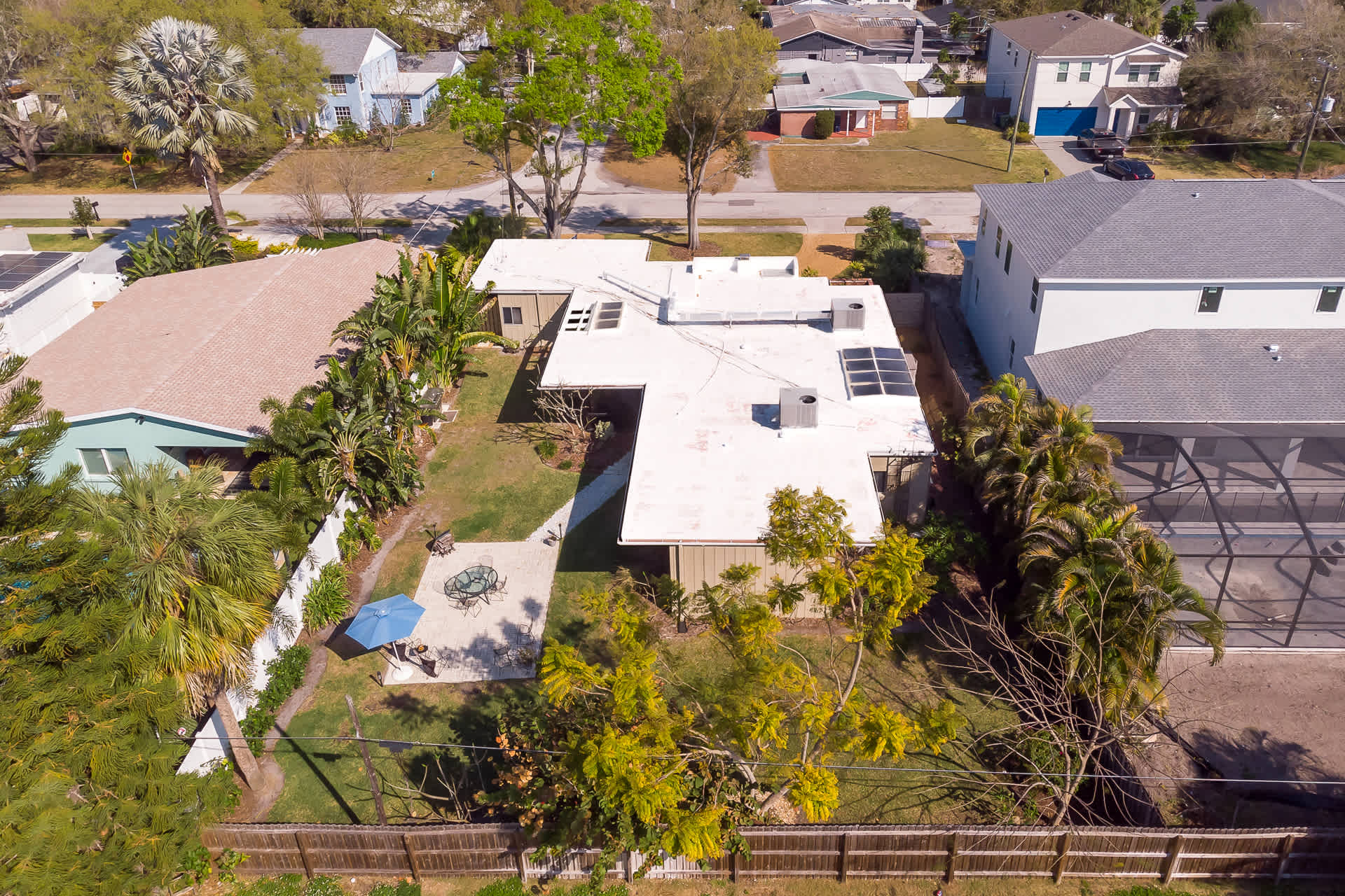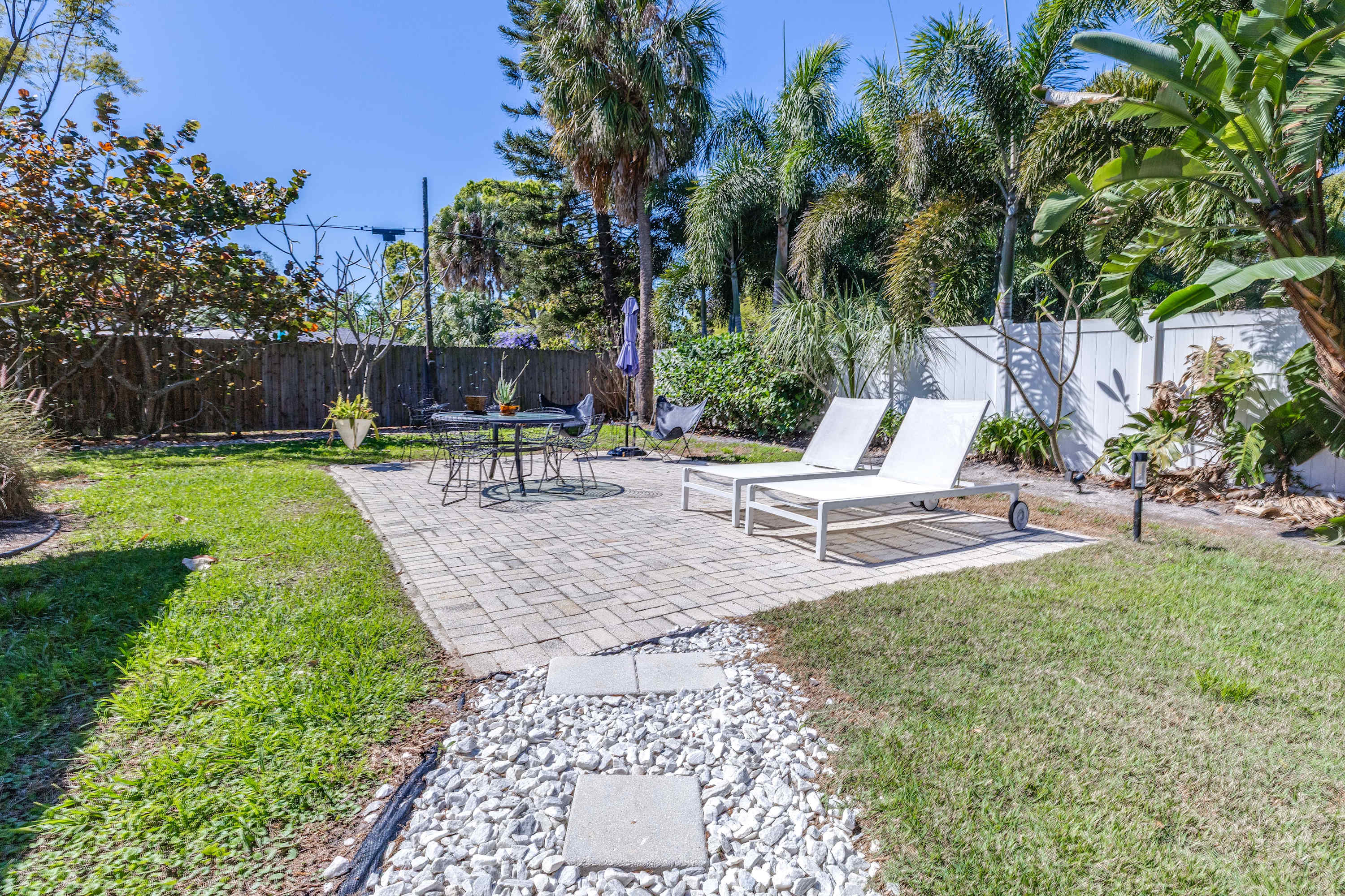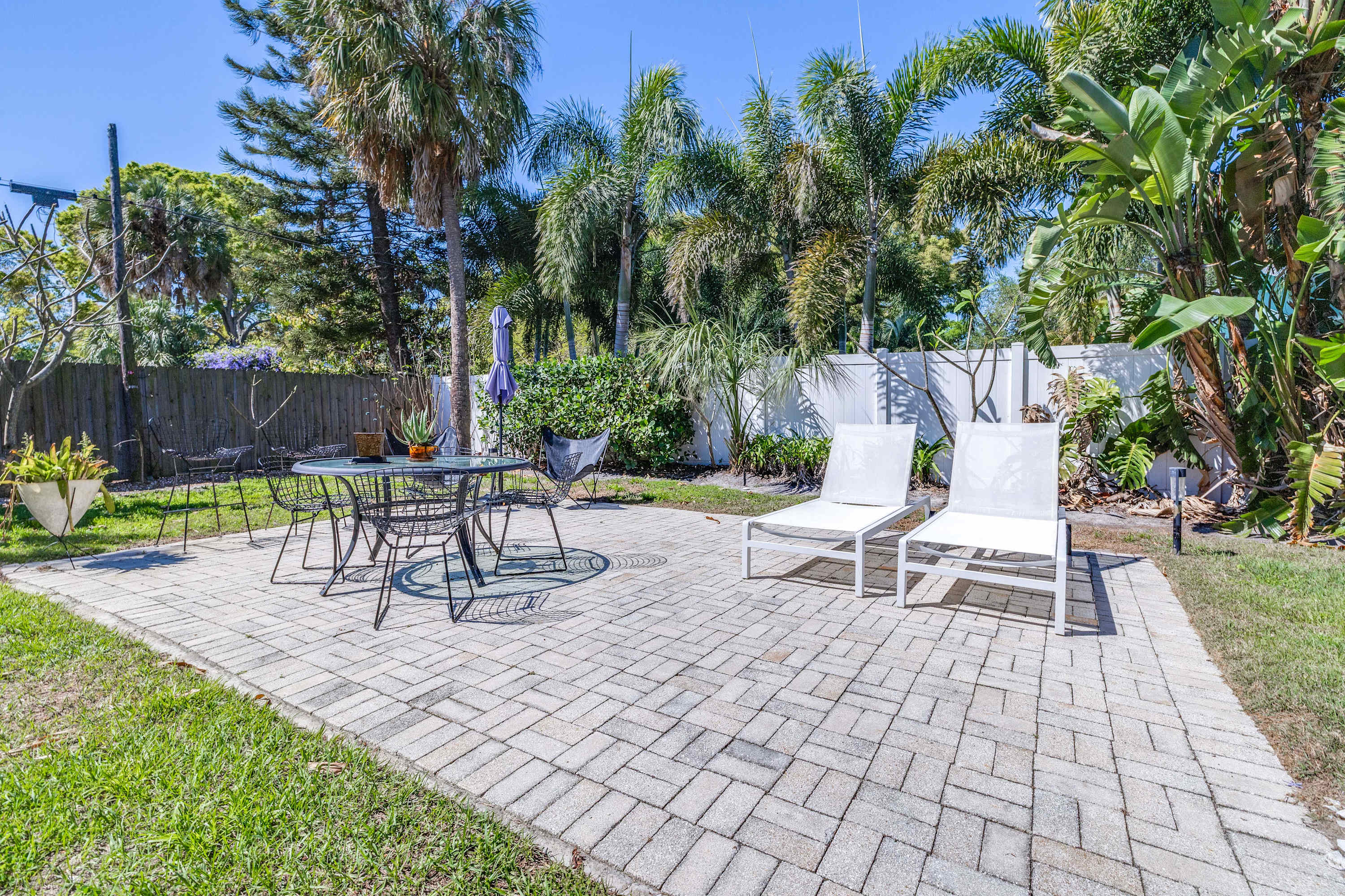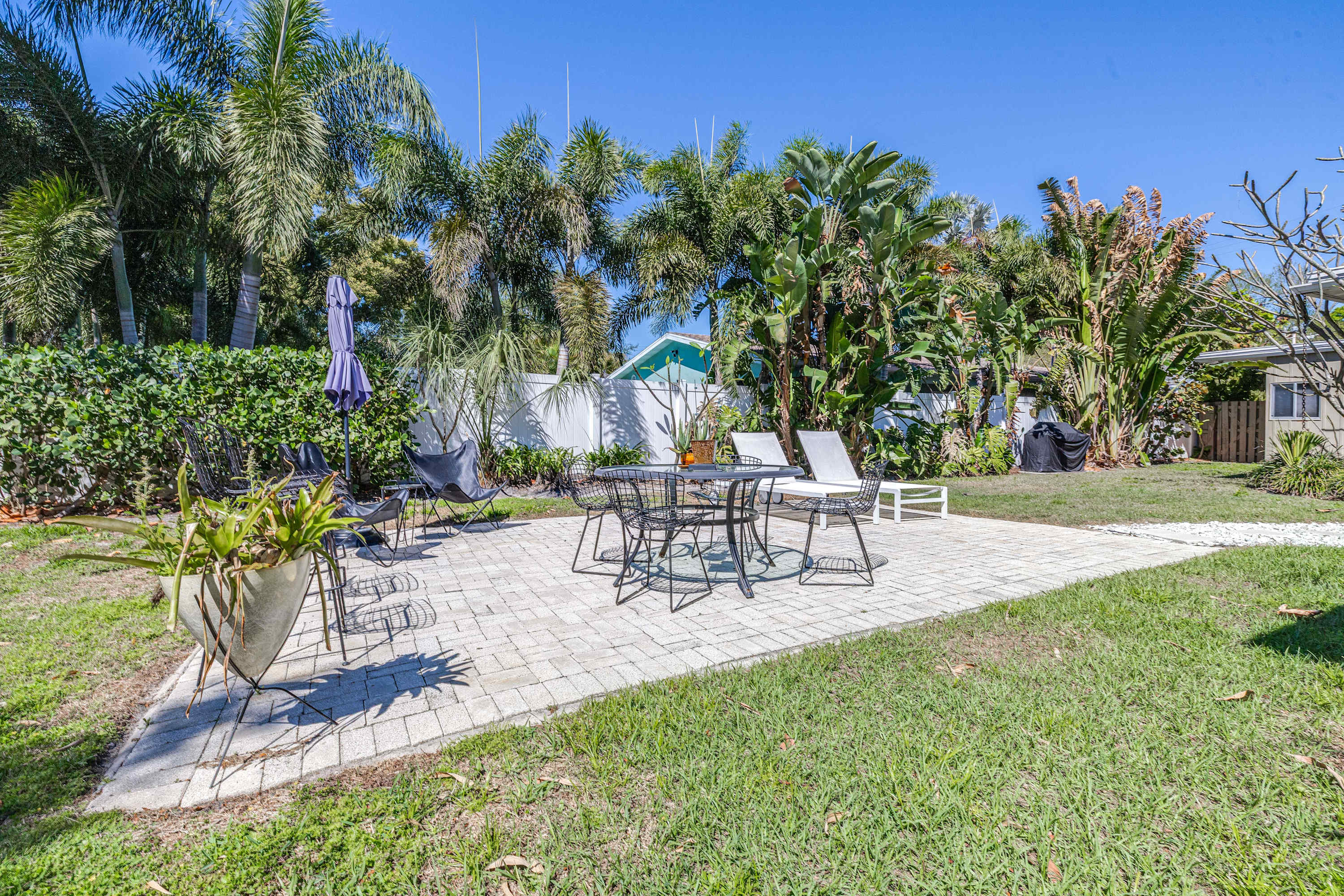 Nestled in a quaint residential neighborhood, this home features a formal living room with a luxurious and inspired ambience, an enclosed patio with delightful seating areas overlooking the property, and a dining area that is illuminated by natural light pouring in from the skylights. The living area has mid-century modern chairs and a smart tv where your group can enjoy movie nights or streaming favorite tv shows. Inside and out, your group can enjoy visiting, playing games, or quietly relaxing in any one of the home’s uniquely furnished nooks. The fully equipped kitchen is fitted with sleek stainless steel appliances so you can whip up delicious meals with ease between your many adventures out into the Tampa Bay area.