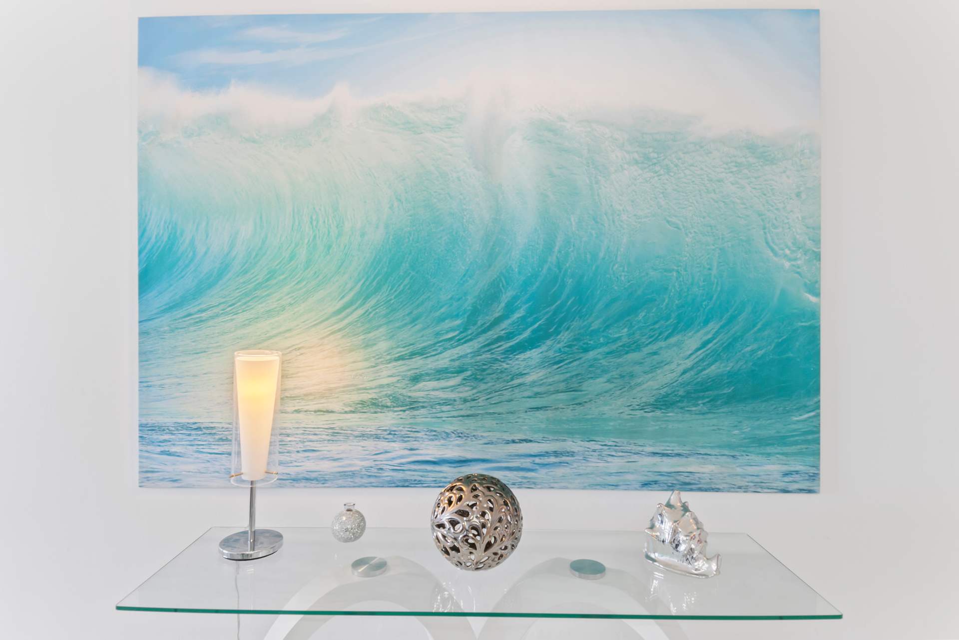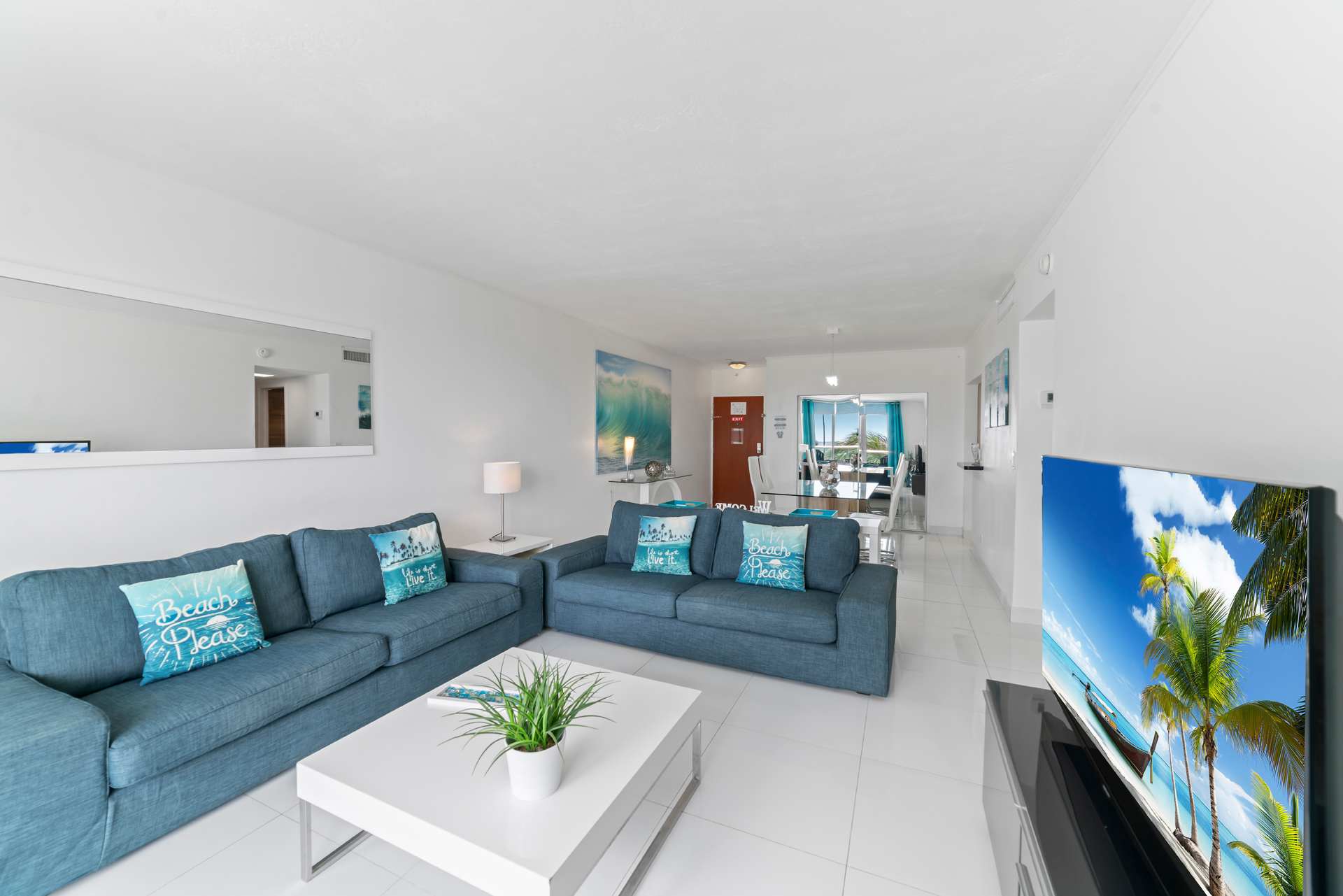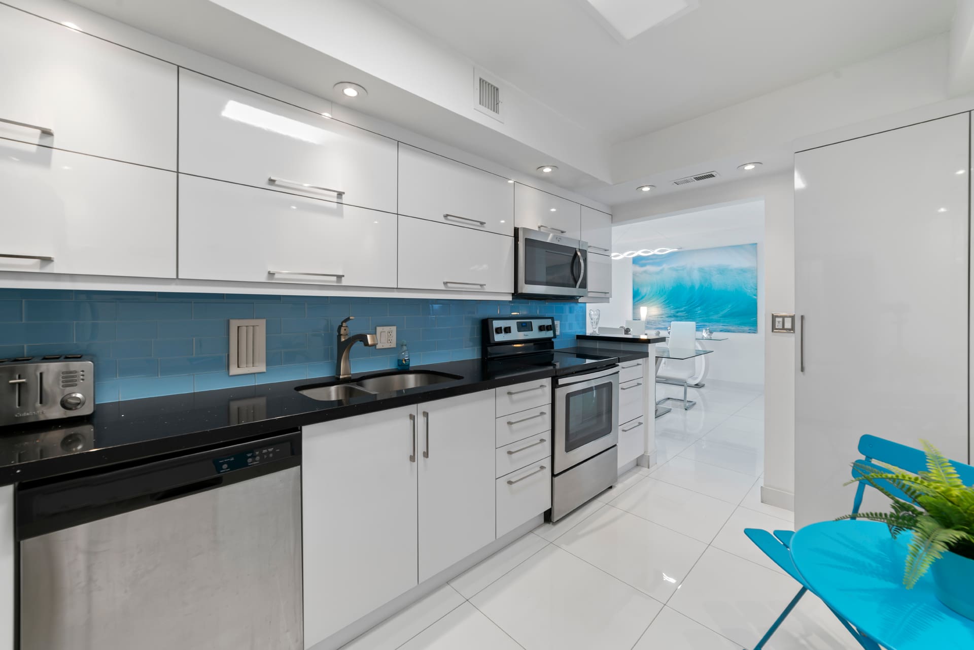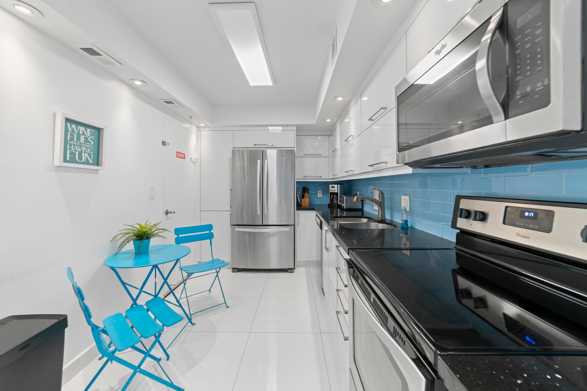 The home’s bright and modern interior is a cool retreat from the heat, with soothing blue tones accenting clean and crisp white walls, flooring, and trim. Sink into plush living room sofa seating while you surf the channels or queue up a movie on the TV. Opening the sliding door will blend indoor and outdoor living together, the salty ocean air swirling freely through the home. Take your morning coffee or an evening cocktail onto the glass balcony, soaking in the views of the lush community grounds and the ocean beyond. Back indoors, make your way into the fully equipped kitchen housing everything you need to whip up delicious meals right at home, showcasing stainless steel appliances, glossy stone countertops, and sleek cabinetry stocked with cookware and dining ware. A café table for 2 is perfect for quick bites while the dining table for 4 is ideal for formal meals gathered together.