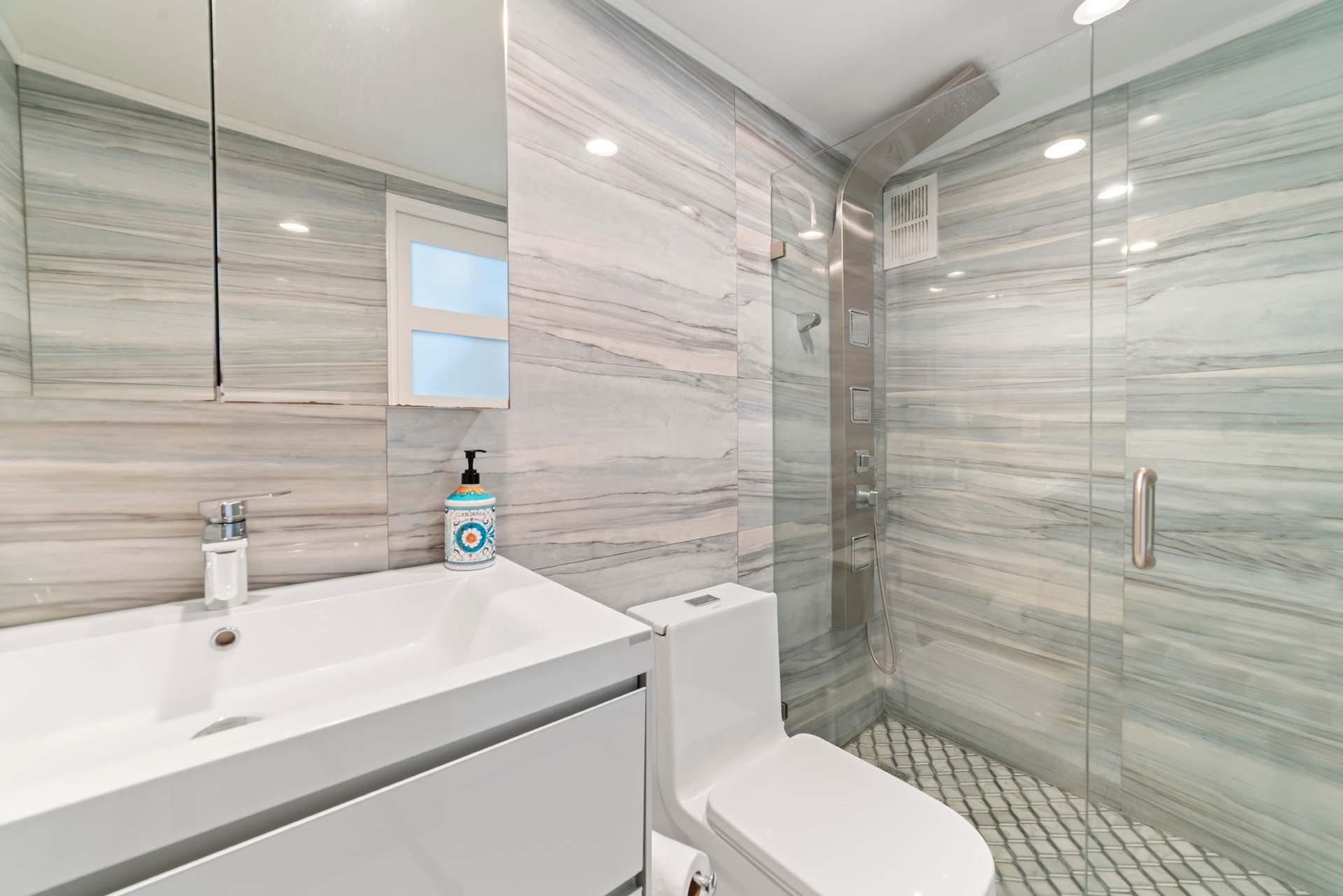 This home comfortably sleeps 4 guests in a private bedroom with 2 luxurious queen size beds fitted with crisp linens and soft blankets for a great night’s sleep, along with a TV. The home’s modern guest bathroom includes a single vanity and glass walk-in shower.